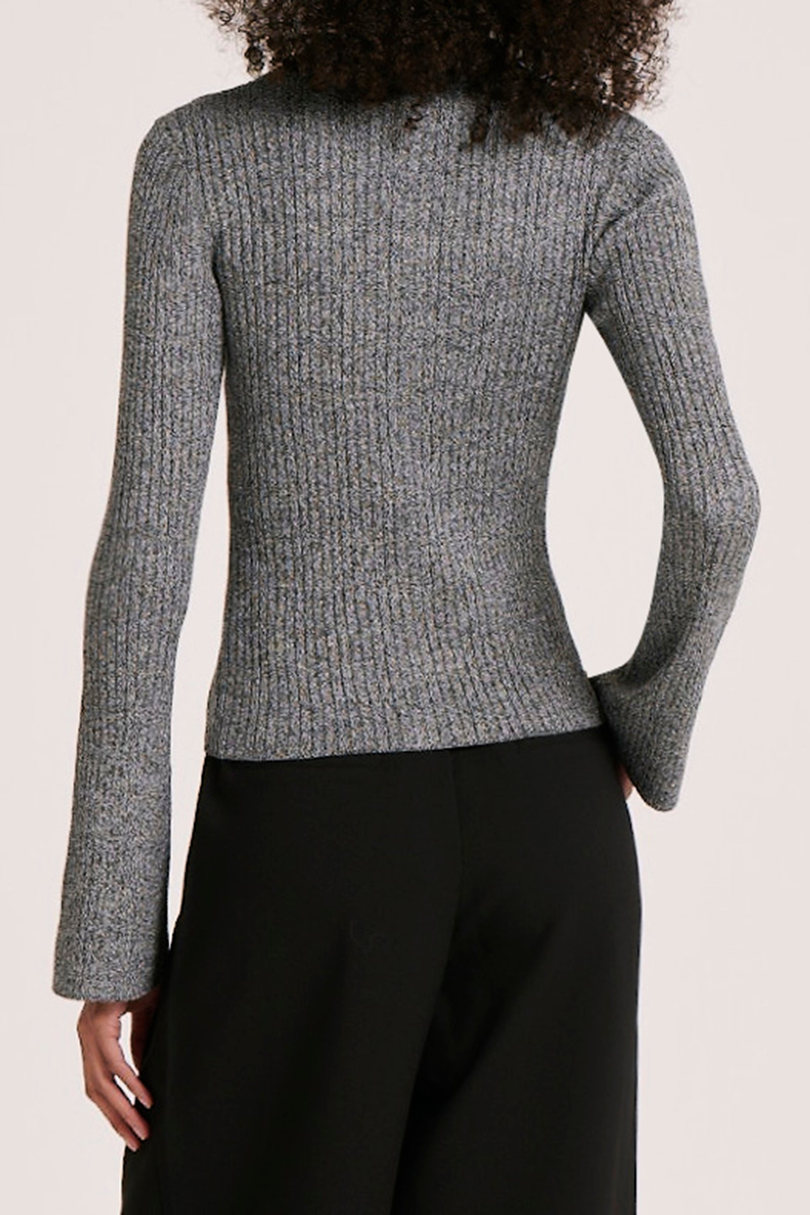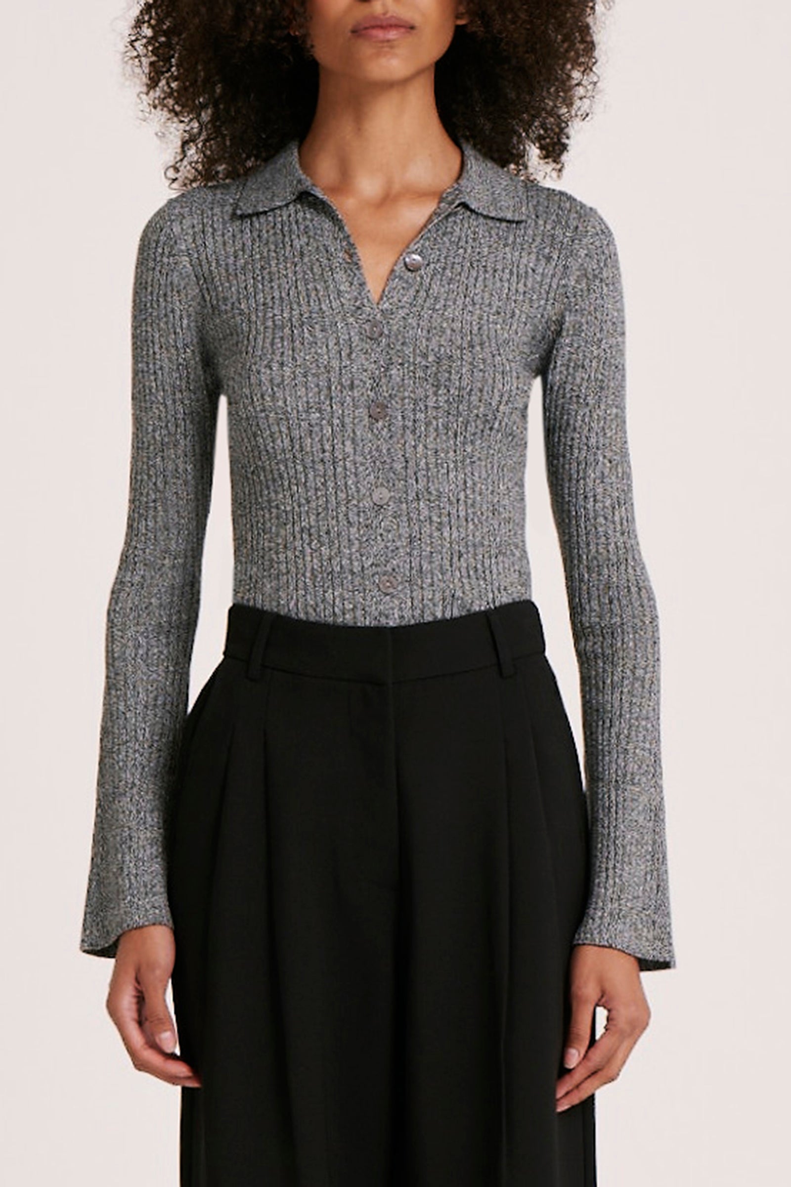 The Abyss Knit Top is made in a  soft cotton blend knit. The silhouette is fitted to the body with length finishing on the hip. Features include full length sleeves with a flared sleeve cuff, ribbed placket and shell buttons.