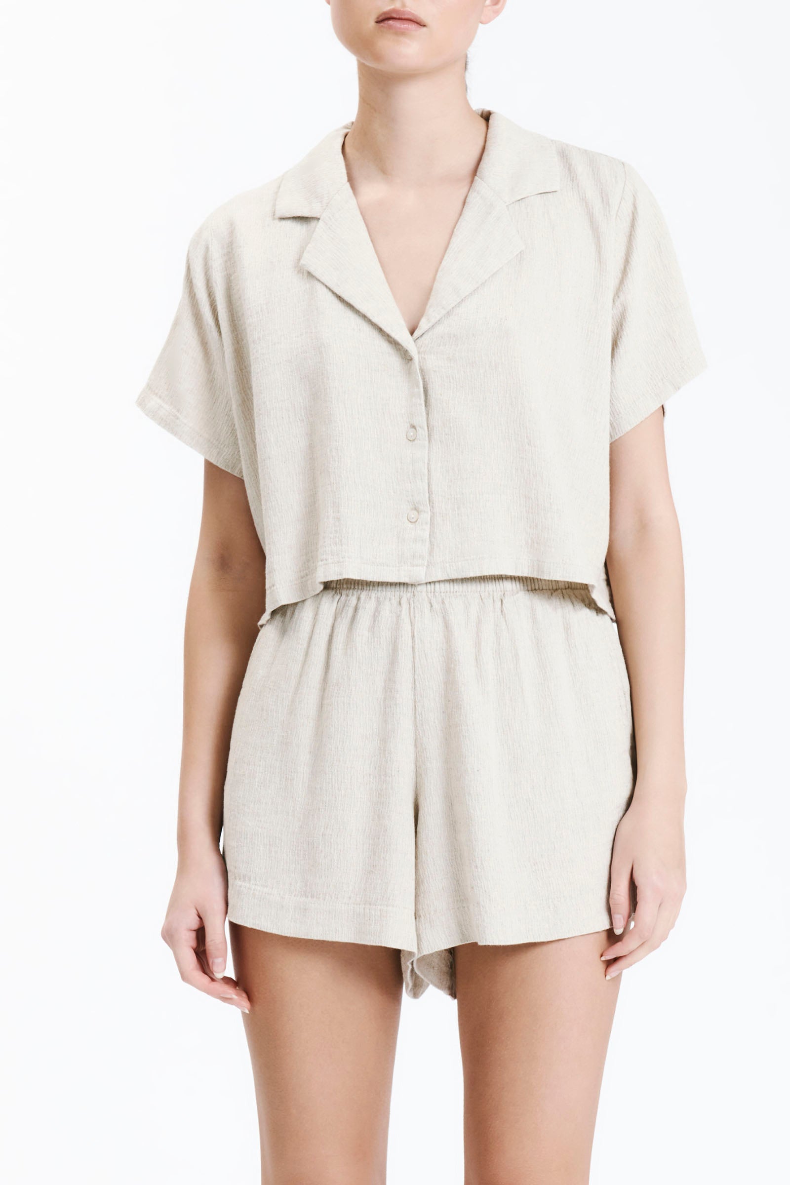 Made in a premium Linen Cotton blend, with a slight crinkle finish. The Ace Shirt is a relaxed cropped shape with length finsihing at the waist. Classic shirting features include a collar with button front opening, short sleeves and back yoke. Finished with shell buttons, and small side seam slits at hem.
