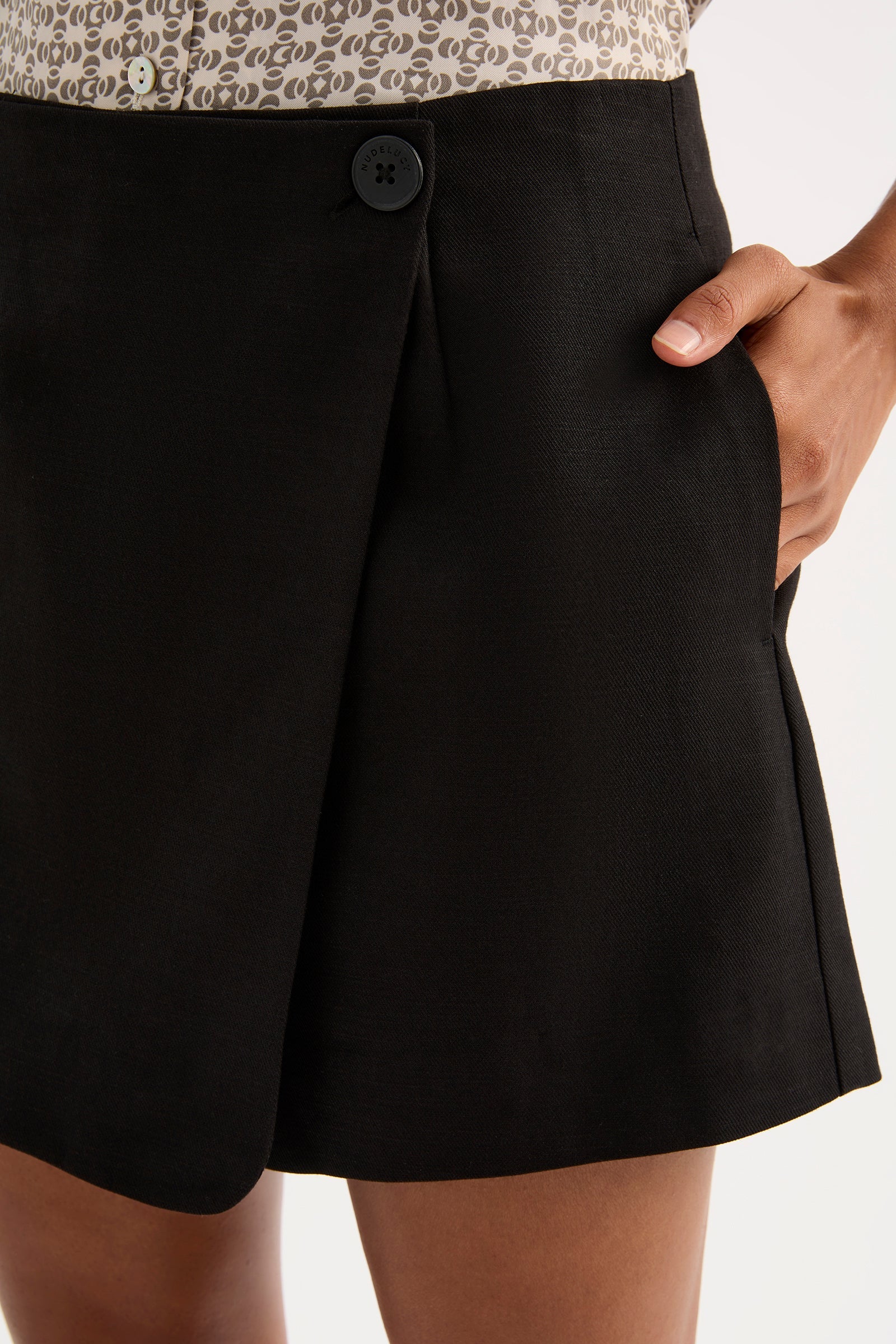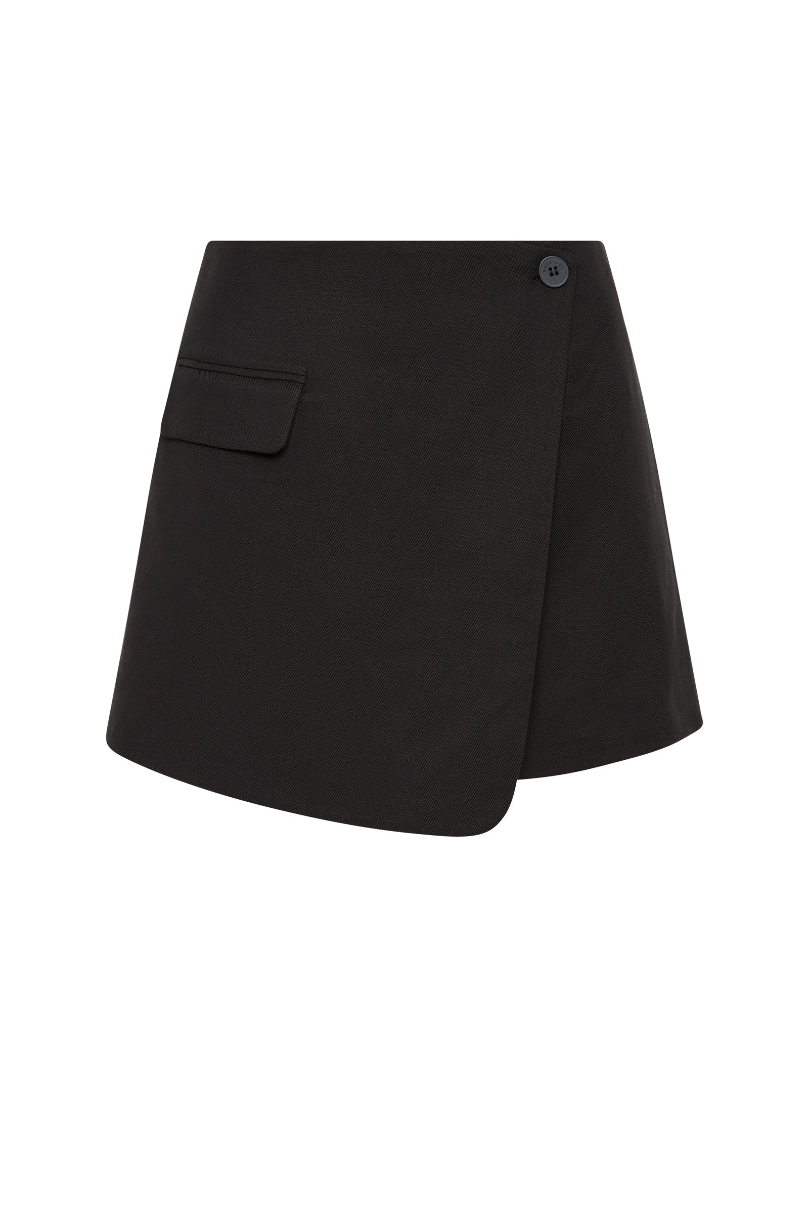 The Agnes Skort is made from a mid weight cotton lyocell blend fabrication which has a soft, breathable hand feel and subtle texture. The skort silhouette is high waisted and mini in length. Features include an asymmetrical front wrap panel, faux pocket design detail, branded Nude Lucy button and invisible zipper at back.