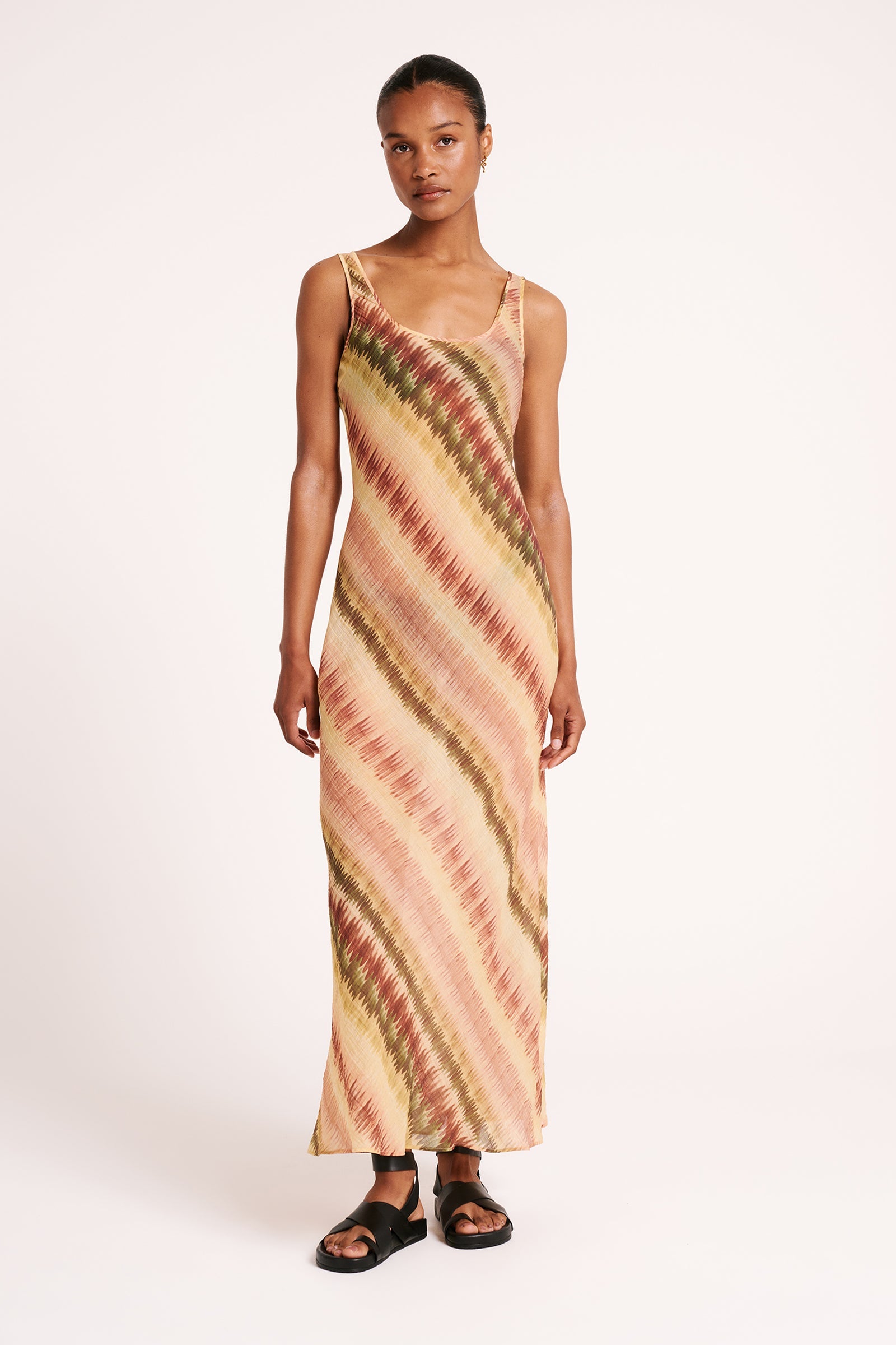 The Akira Dress is made from a lightweight lyocell blend fabric in our exclusive Calypso print. Cut on the bias, this silhouette drapes over the body softly and finishes at ankle length. Features include a scoop neckline and thick straps.