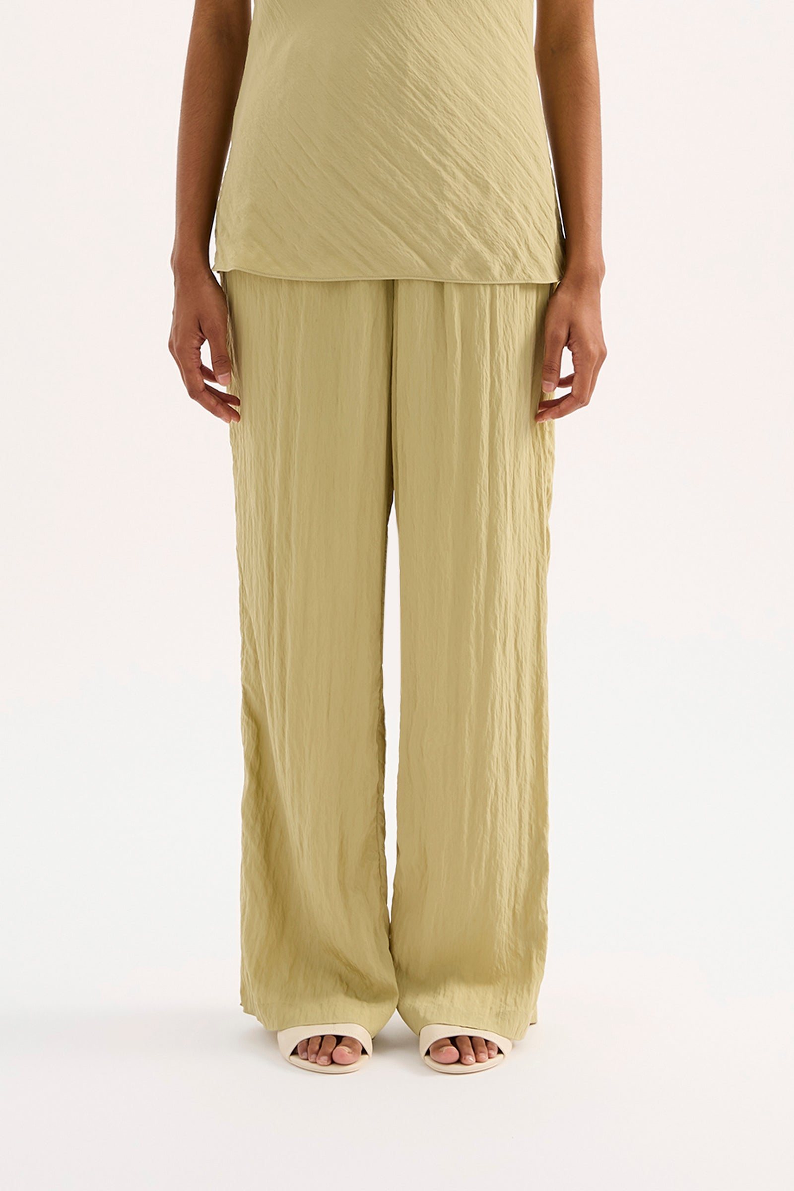 The Alia Pant is made from a viscose blend fabric which is lightweight and has a soft, textured hand feel. The silhouette is a relaxed wide leg, full length pant. Features include an elasticated waistband, side seam pockets and slits at hem.