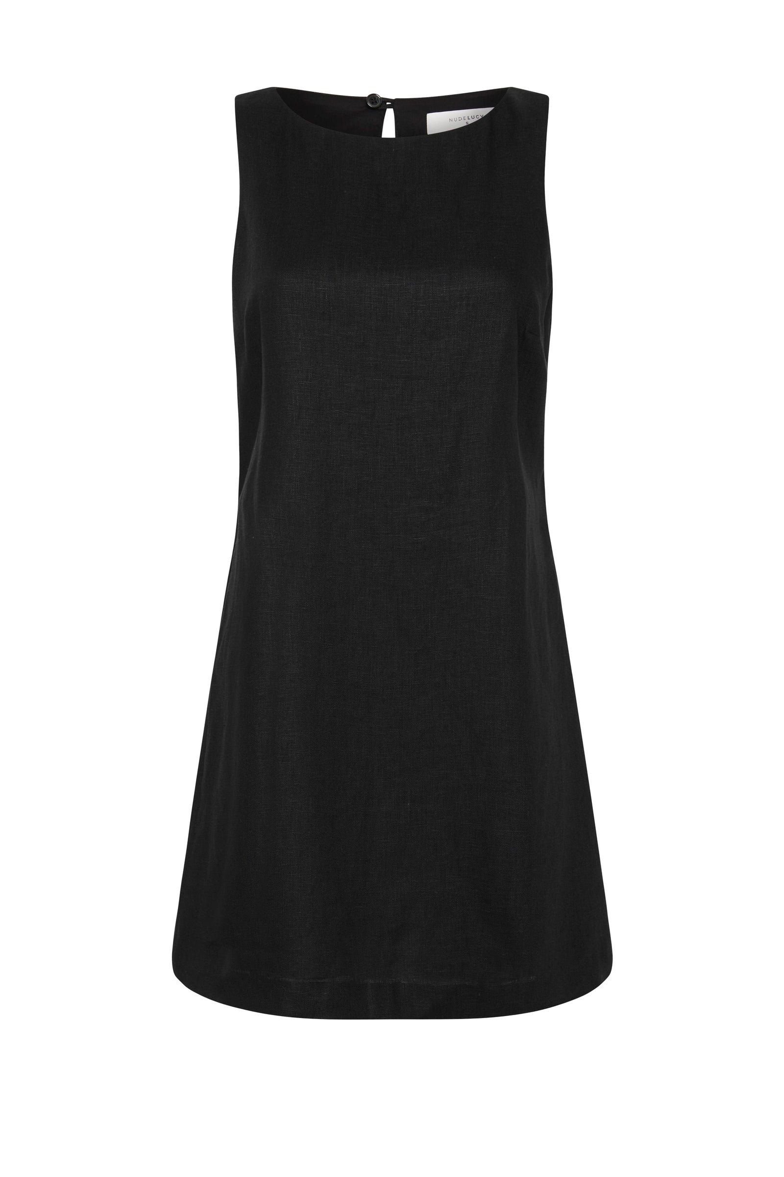 The Aliya Linen Mini Dress is made from 100% Linen which has been washed for a soft, breathable hand feel. The silhouette is feminine with elastic and tie at the back waist and a mini skirt. Features include high neckline and button keyhole opening.