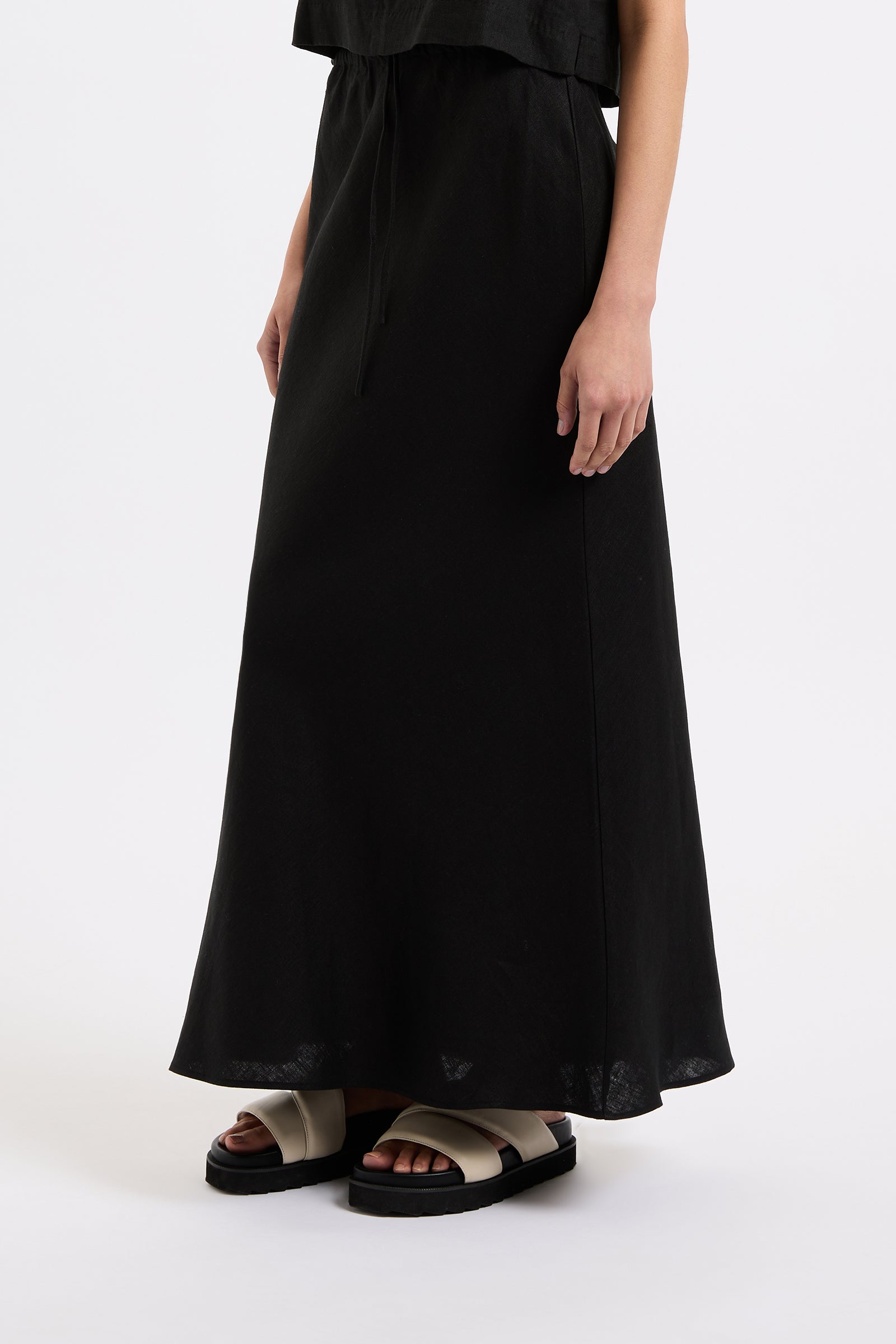 The Amani Linen Skirt in black is made from a premium linen which has been washed for a smooth, soft hand feel. Cut on the bias, this silhouette finishes just above the ankles. Features include encased elasticated waistband with a self cut draw string at centre front.
