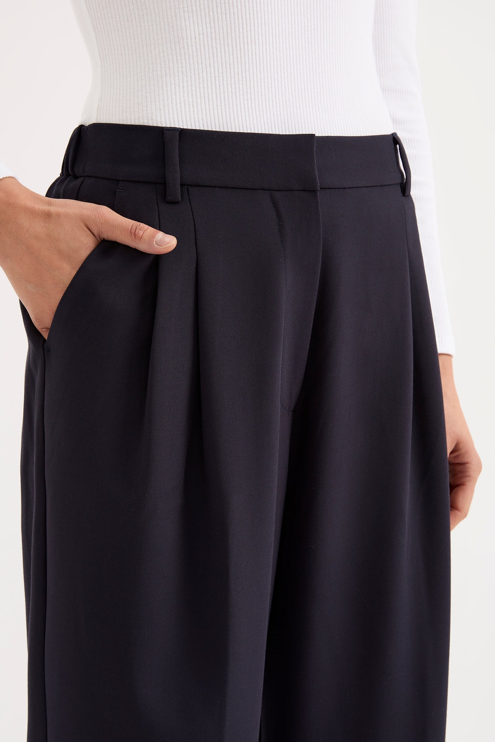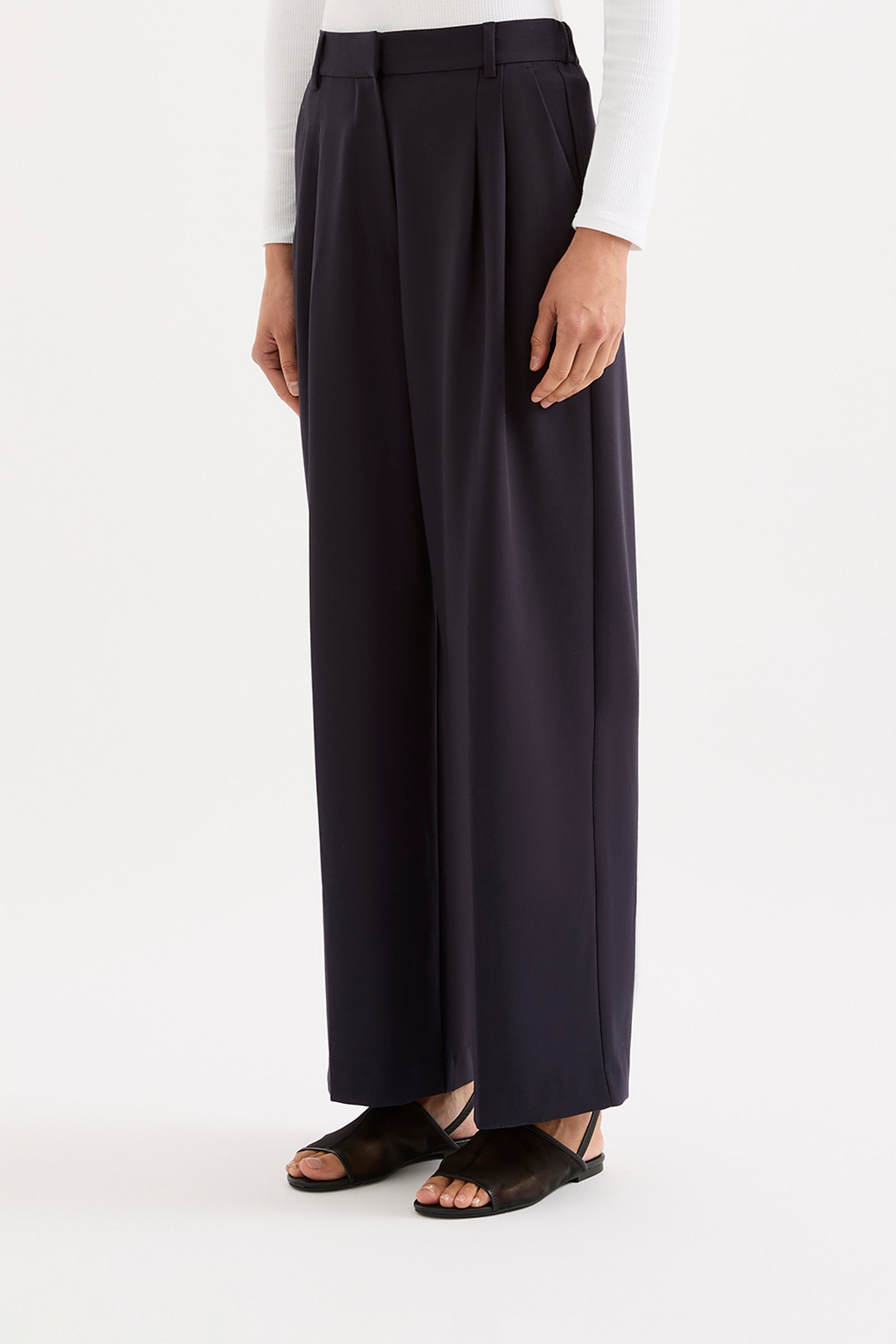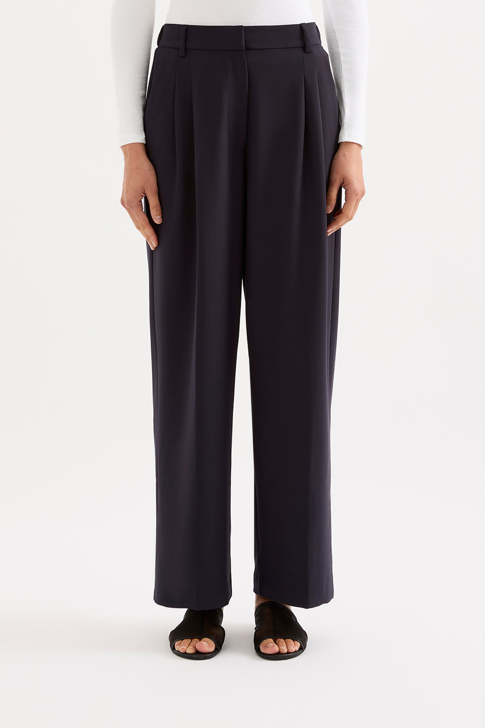 The Andrea Pant is made from a midweight tailoring fabric which has a smooth hand feel. The silhouette is tailored with a high rise and wide leg. Features include front pleats at waist, concealed trouser hook closure and front coin pocket.