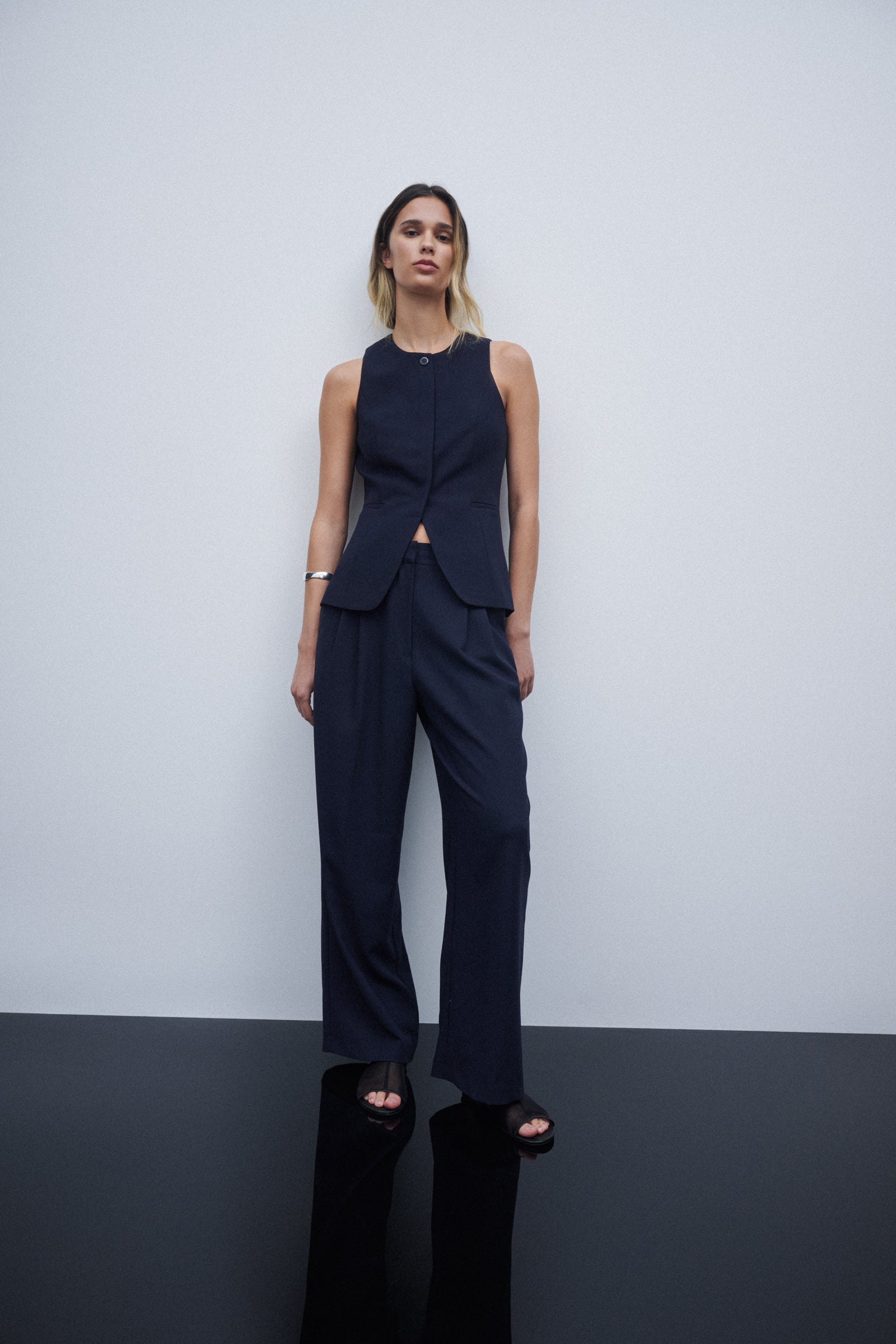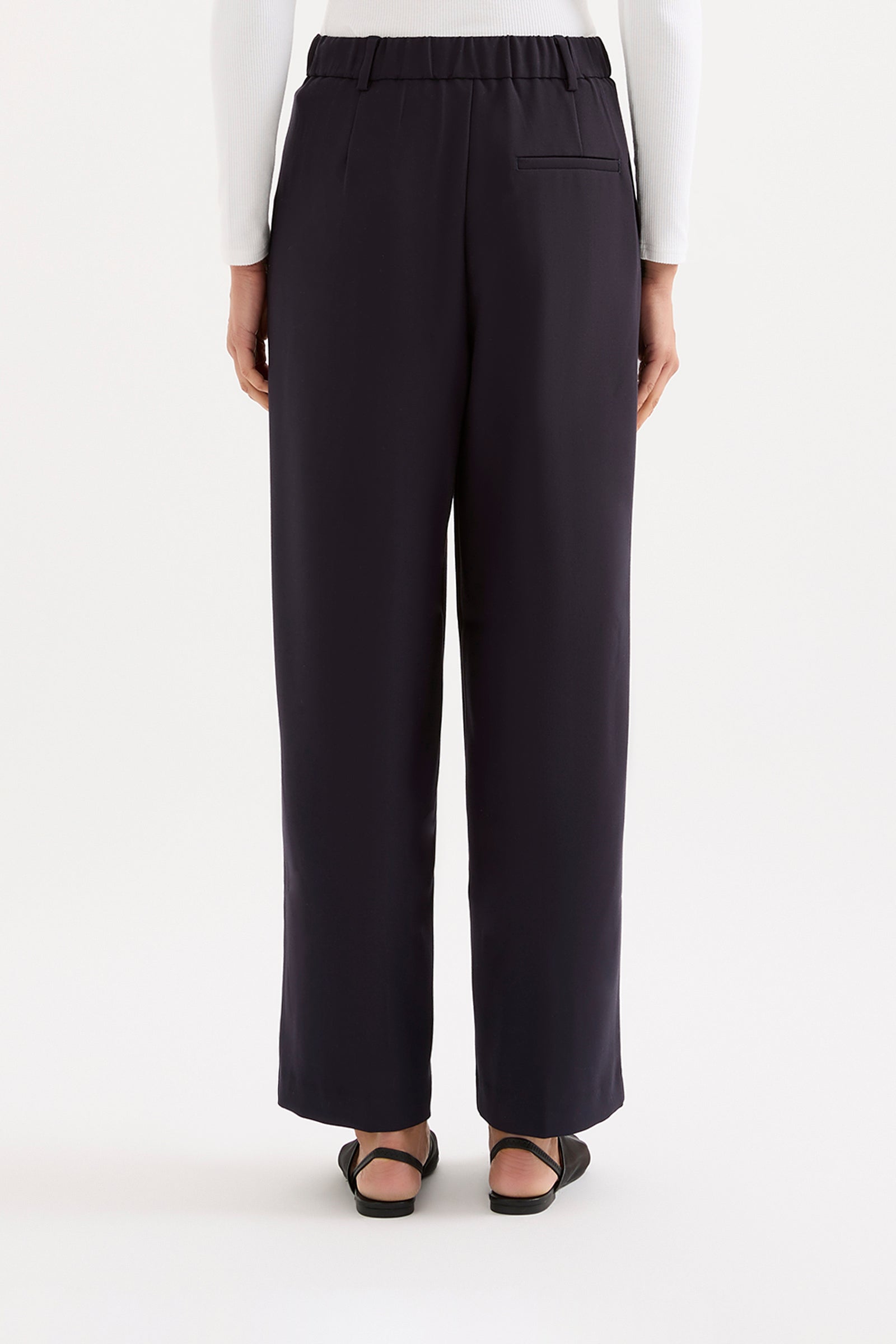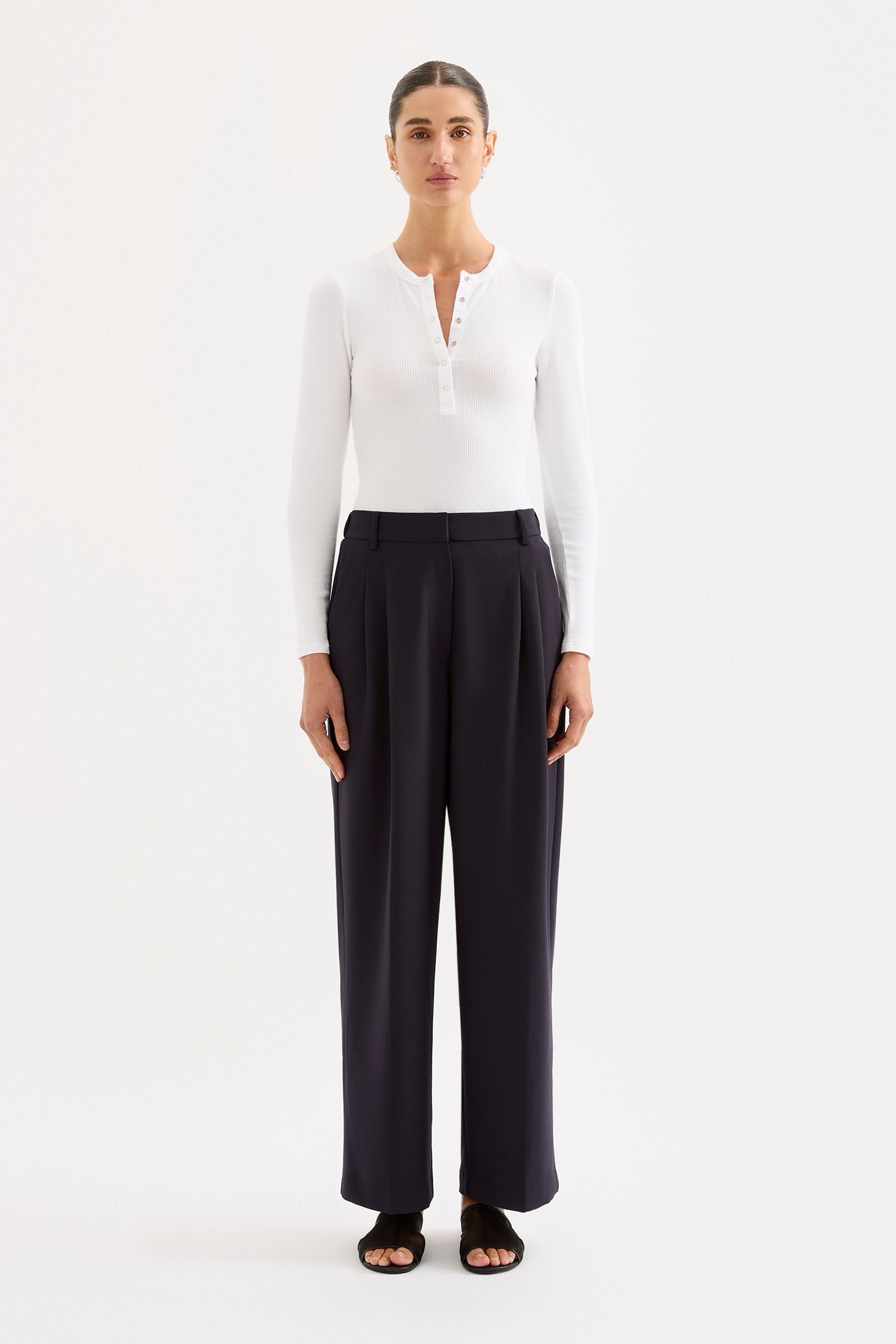 The Andrea Pant is made from a midweight tailoring fabric which has a smooth hand feel. The silhouette is tailored with a high rise and wide leg. Features include front pleats at waist, concealed trouser hook closure and front coin pocket.