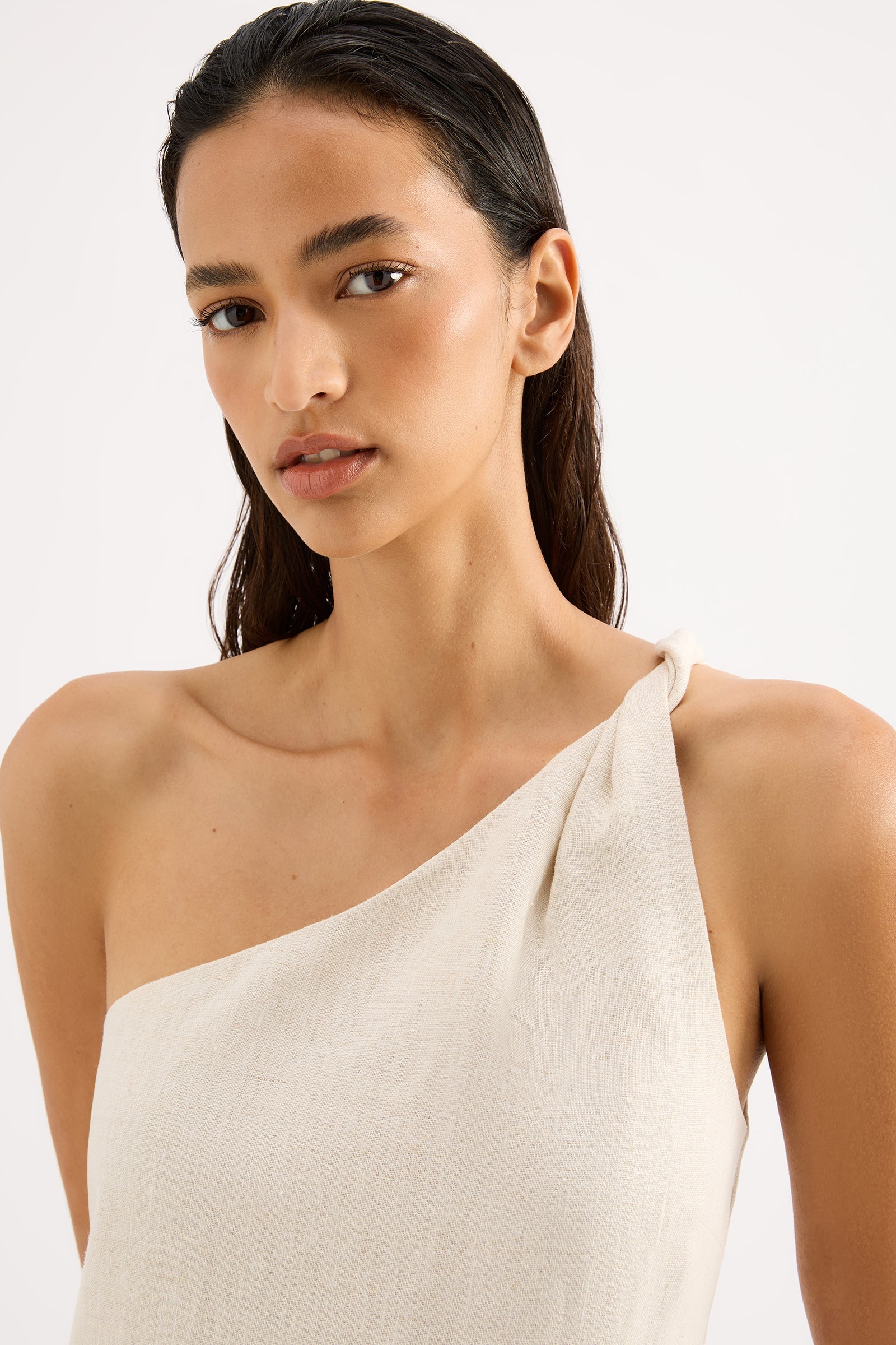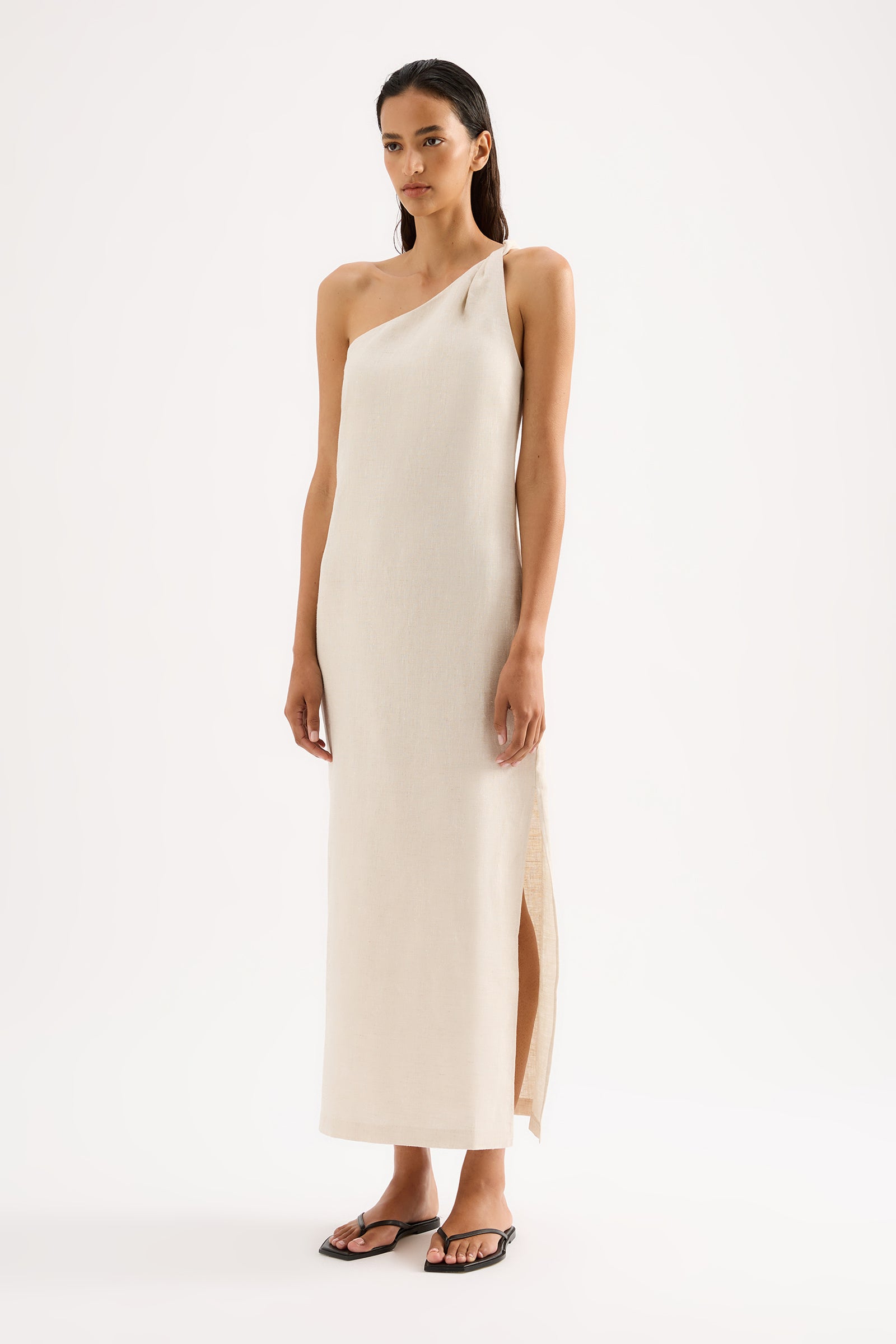 The Avery Linen Midi Dress is made from a premium linen which has been washed for a smooth, soft hand feel. The silhouette is feminine with one thick shoulder strap, fitted waist and midi length skirt finishing above the ankle. Features include shoulder strap twist detail, gripper tape on inside neckline, side split and invisible zipper.