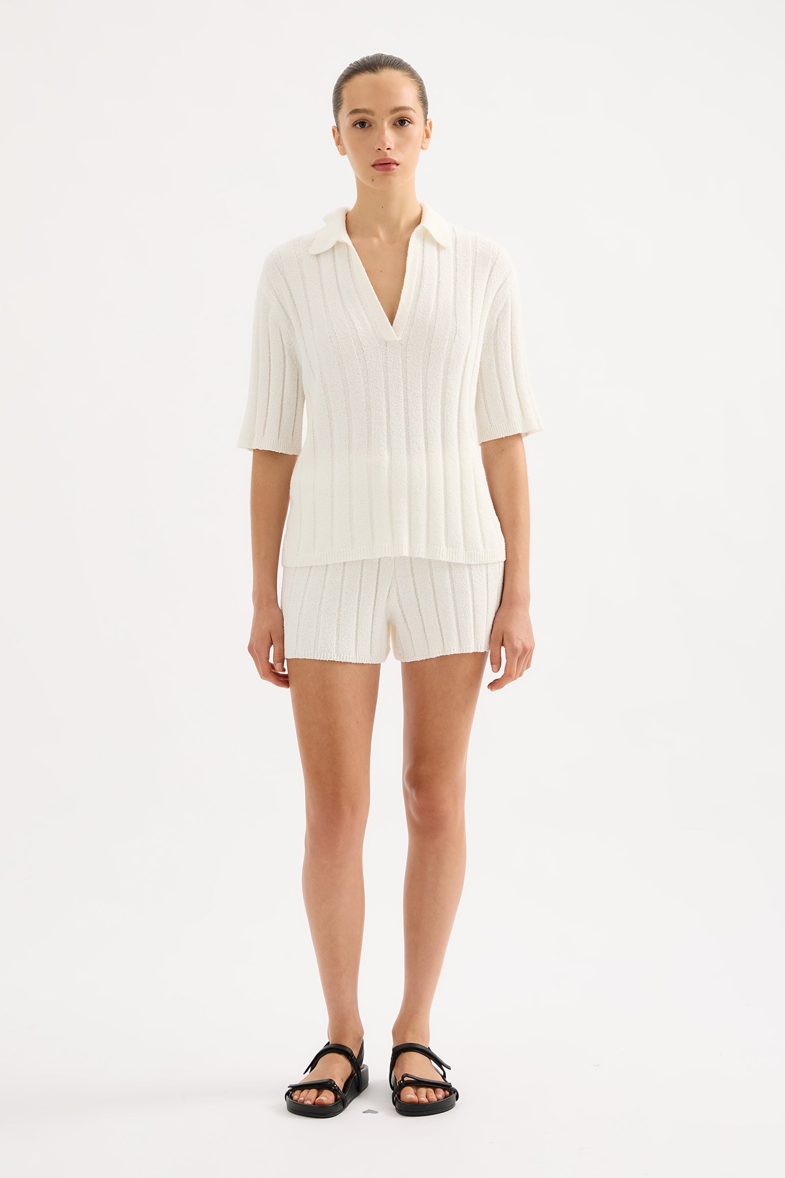 The Brinkley Knit Short is made from a cotton blend yarn which has a dry hand feel. The silhouette is relaxed with a high waist and wide leg opening. Features include an elasticated waistband, draw cord and wide rib construction.