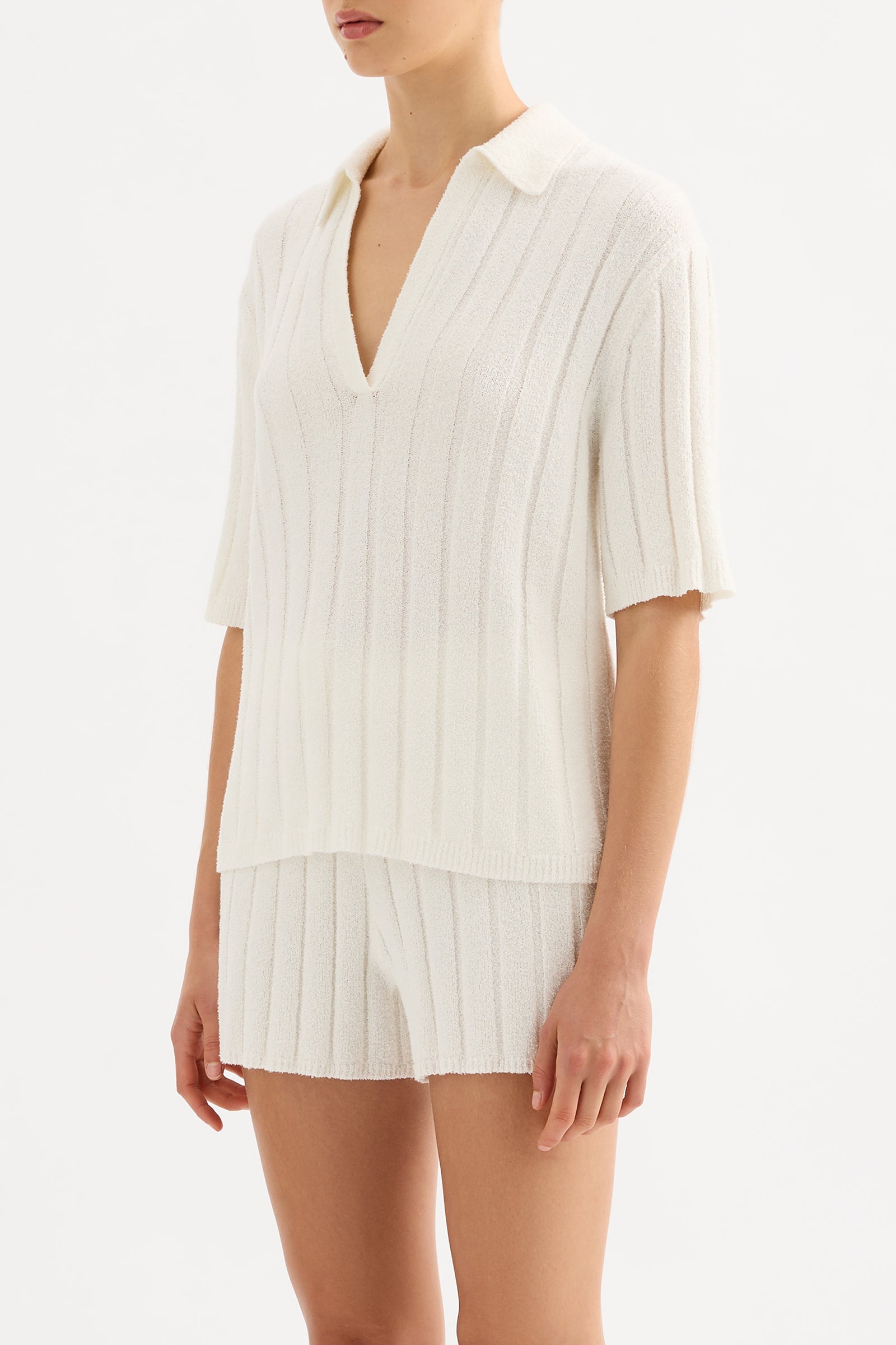 The Brinkley Knit Top is made from a cotton blend yarn which has a dry hand feel. The silhouette is a boxy fit with length finishing on the hip and wide short sleeves. Features include a knitted collar and placket neckline and wide rib construction.