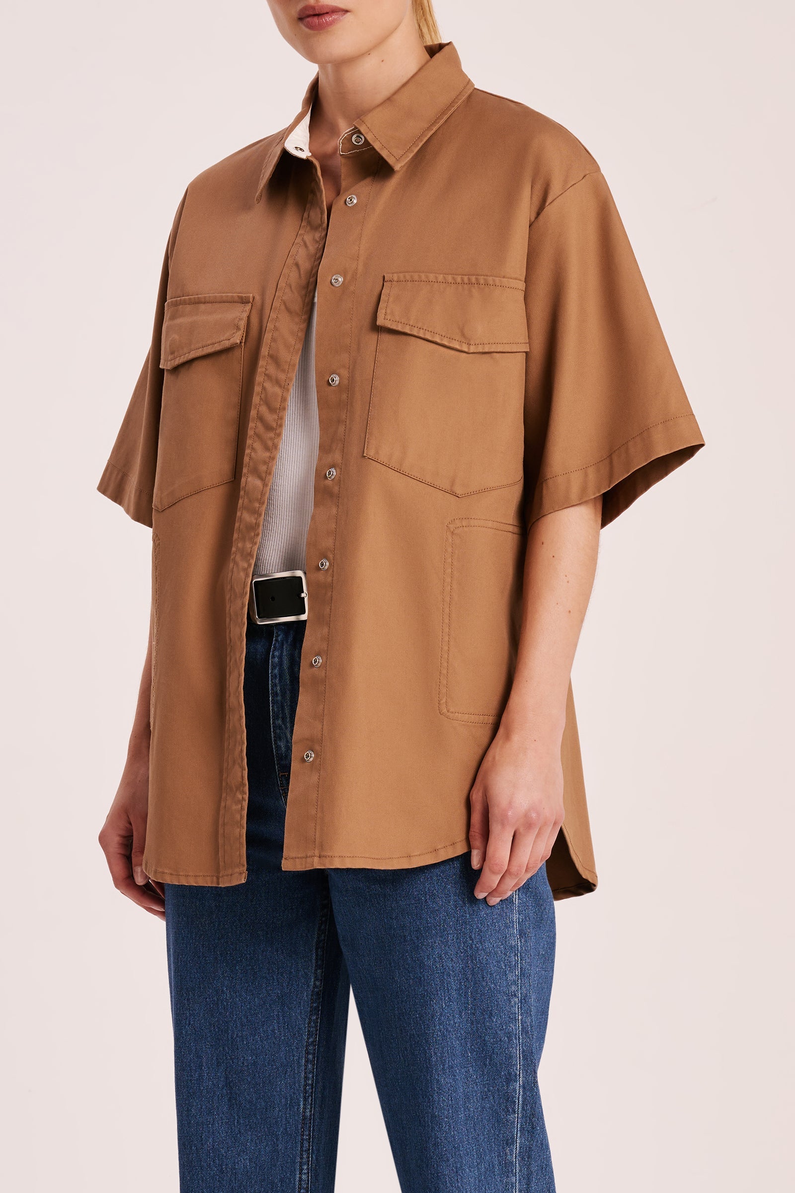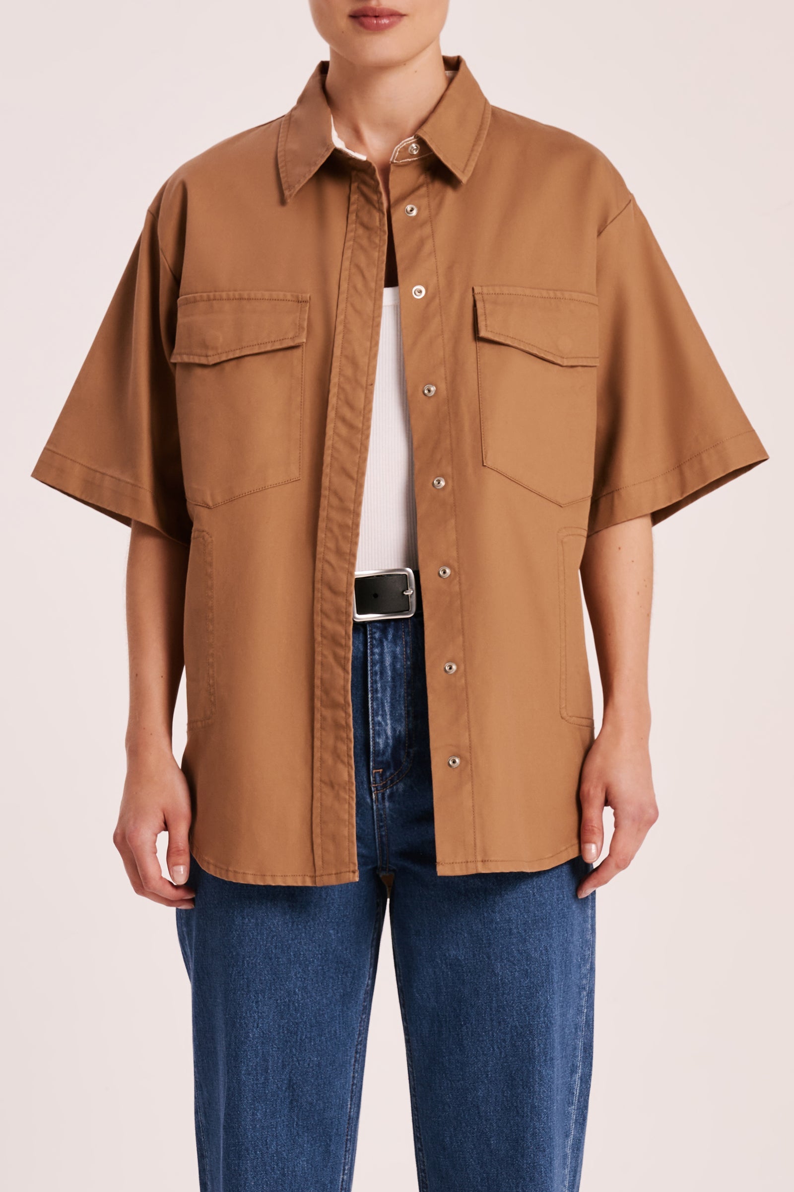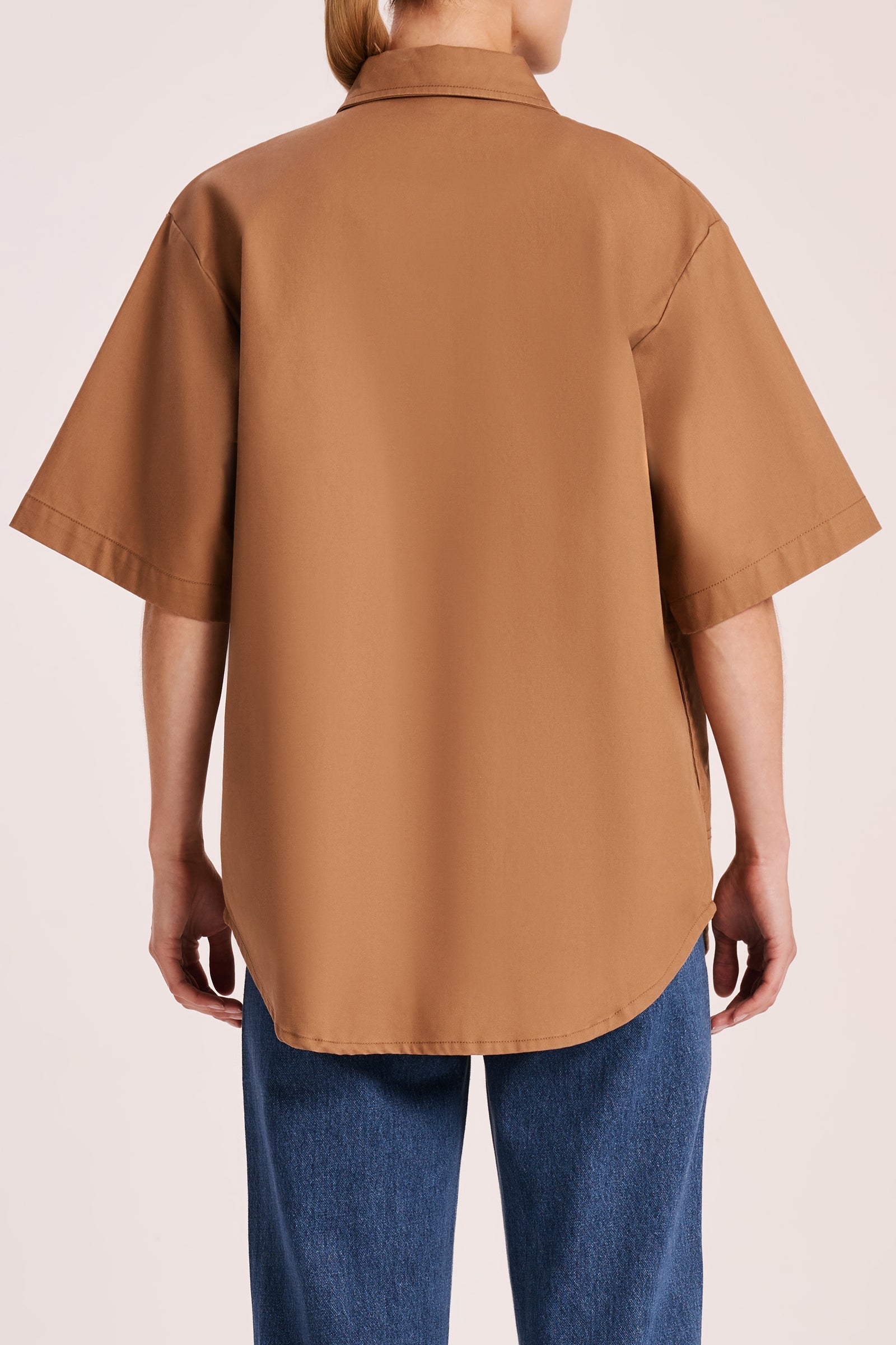 The Brisa Jacket in sepia is made from a heavyweight cotton twill fabrication which has a soft surface and smooth hand feel. The silhouette is an oversized, boxy fit with sleeves finishing at the elbow and length finishing below the hips. Features include classic shirting details, metal press studs and hidden pockets at side seams.