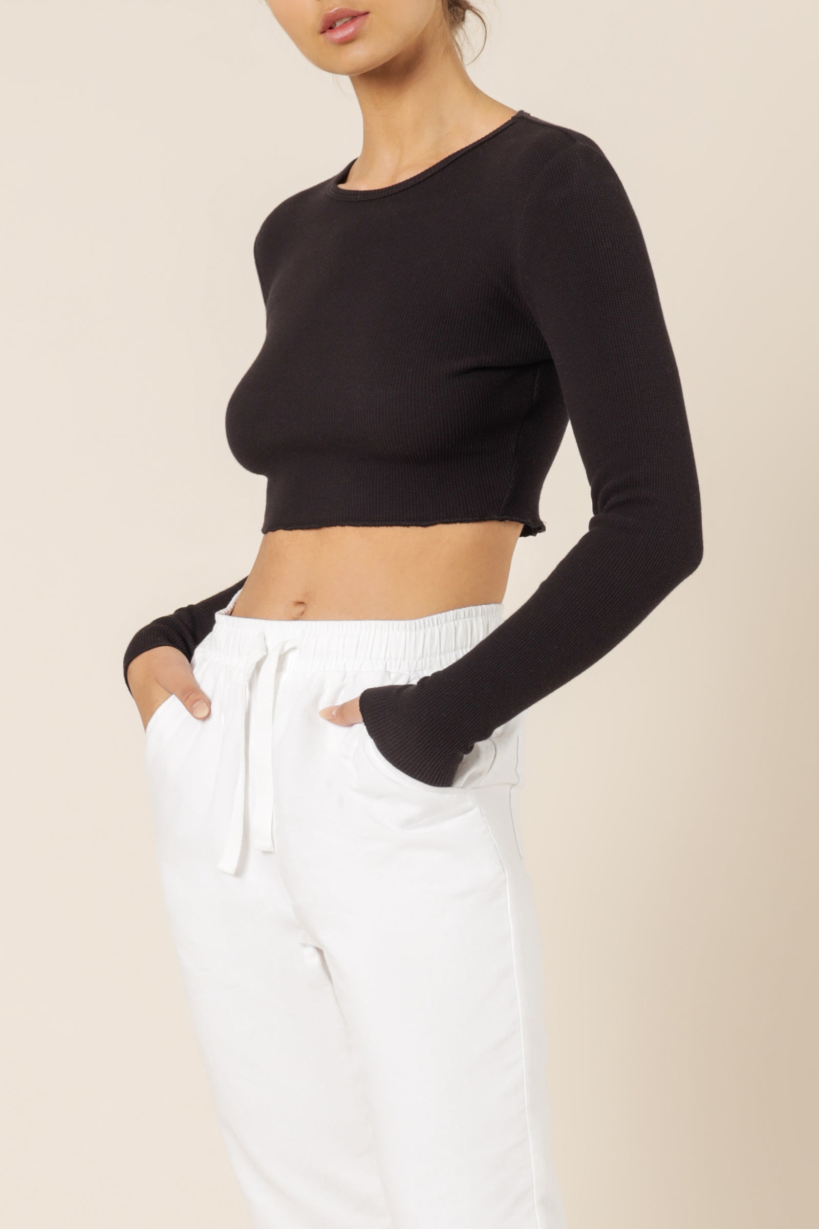 Crafted from our signature waffle stretch cotton, the Cameron Waffle Long Sleeve Tee is a comfortable cropped silhouette sitting just above the waist and fitting closely to the body with full length sleeves. Features include a subtle waffle texture, a crew neckline and babylock finish at body and sleeve hems.