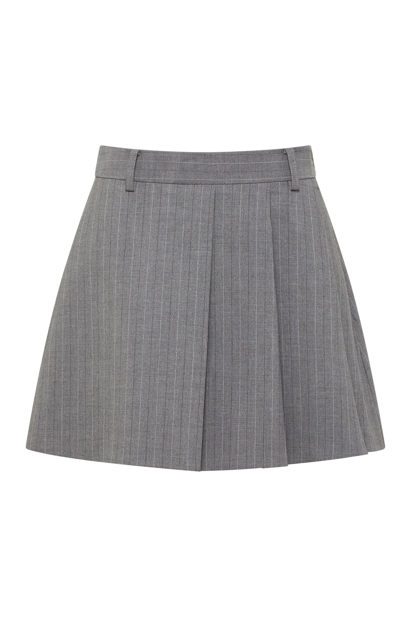 The Cilia Tailored Mini Skirt is made from a classic wool blend suiting fabrication with a smooth hand feel and subtle stripe design. The silhouette is high waisted and mini in length. Features include tailored waistband with belt loops, asymmetrical pleats and invisible zipper at side seam. This style is fully lined.