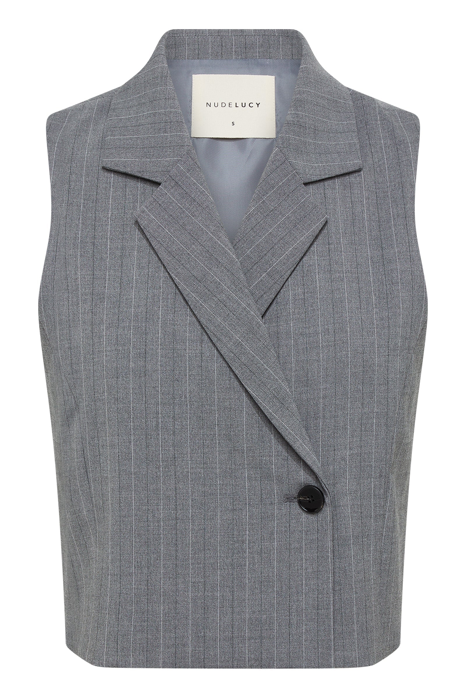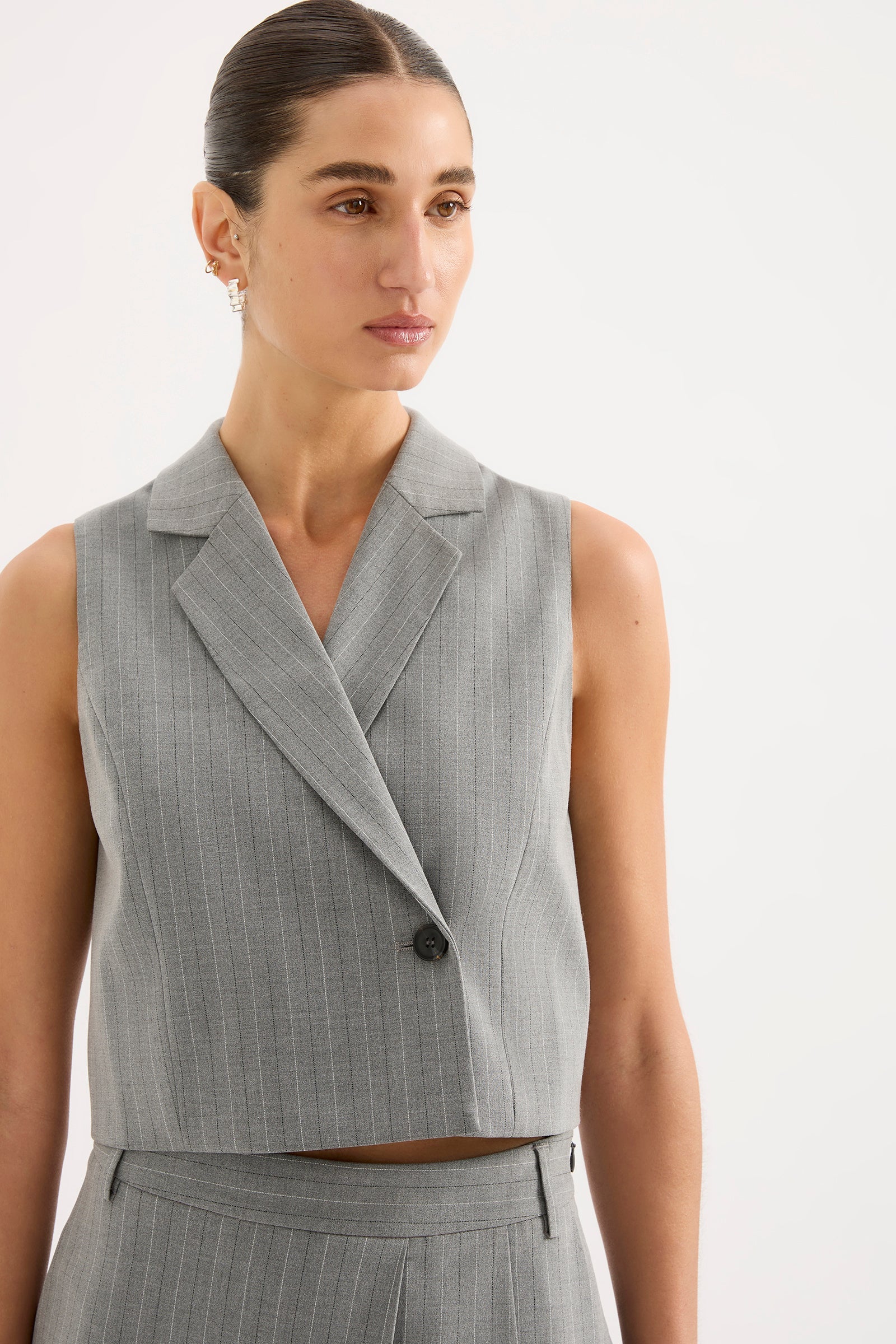 The Cilia Vest is made from a classic wool blend suiting fabrication with a smooth hand feel and subtle stripe design. The silhouette is tailored and cropped with length finishing at the waist. Features include traditional tailoring features including collar and lapel, shaped panel lines and nude lucy branded button. This style is fully lined.
