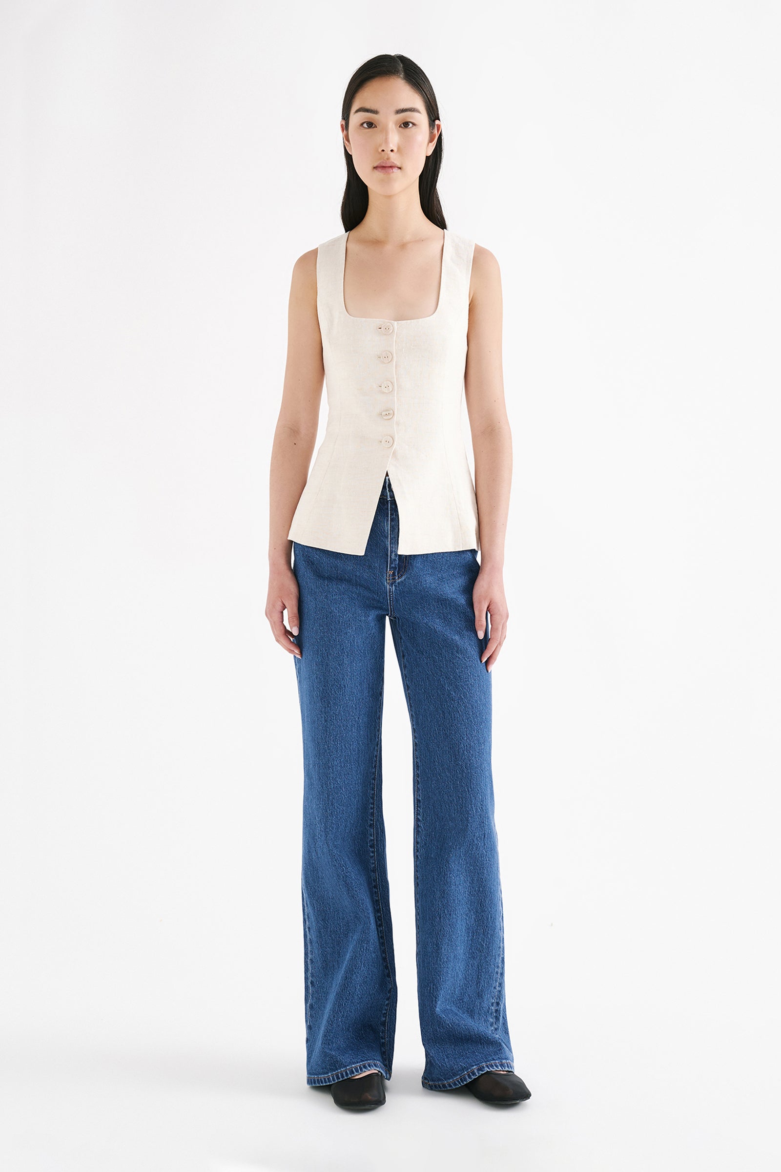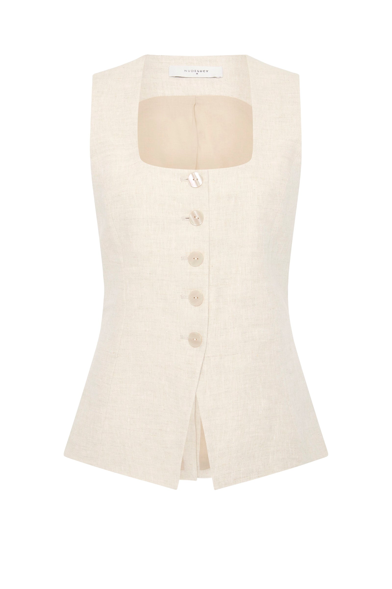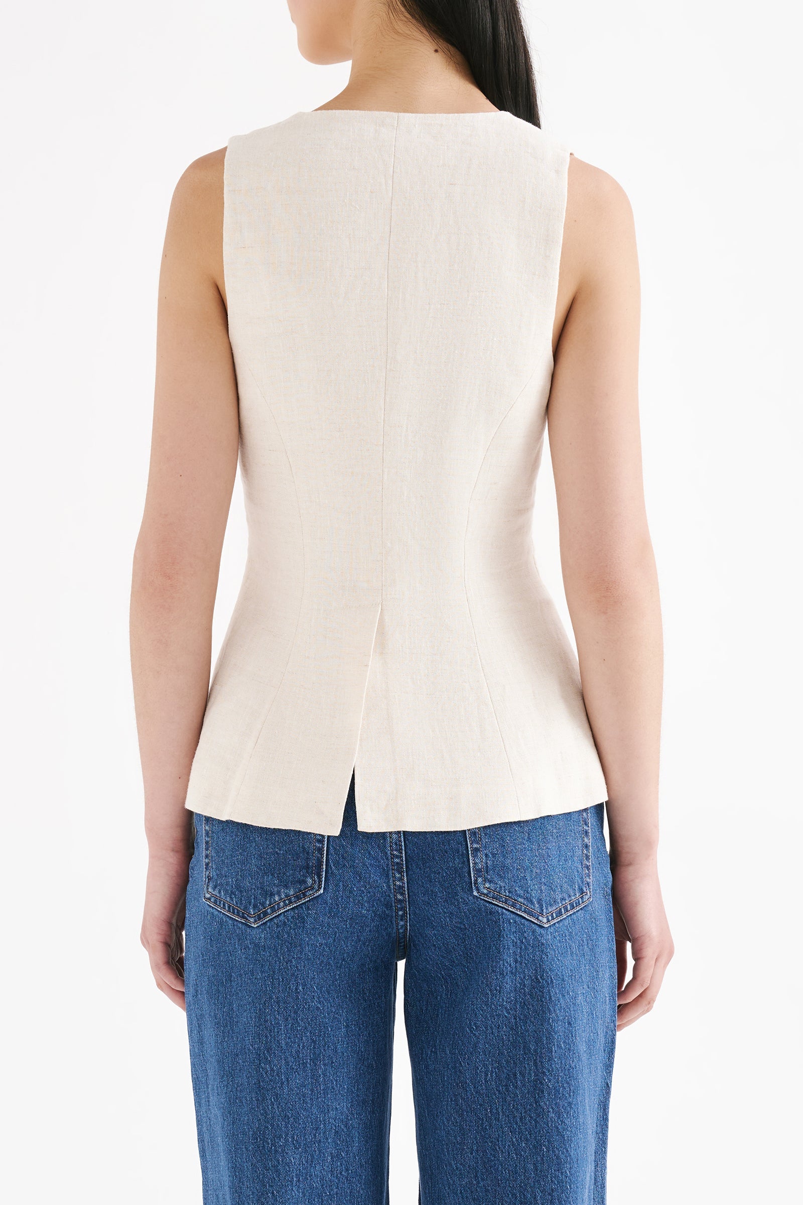 The Clio Linen Vest is made from 100% linen which has been washed for a soft, breathable hand feel. The silhouette is tailored and slim fitting with a button front opening. Features include a scooped neckline and shell buttons. The Clio Linen Vest is fully lined.