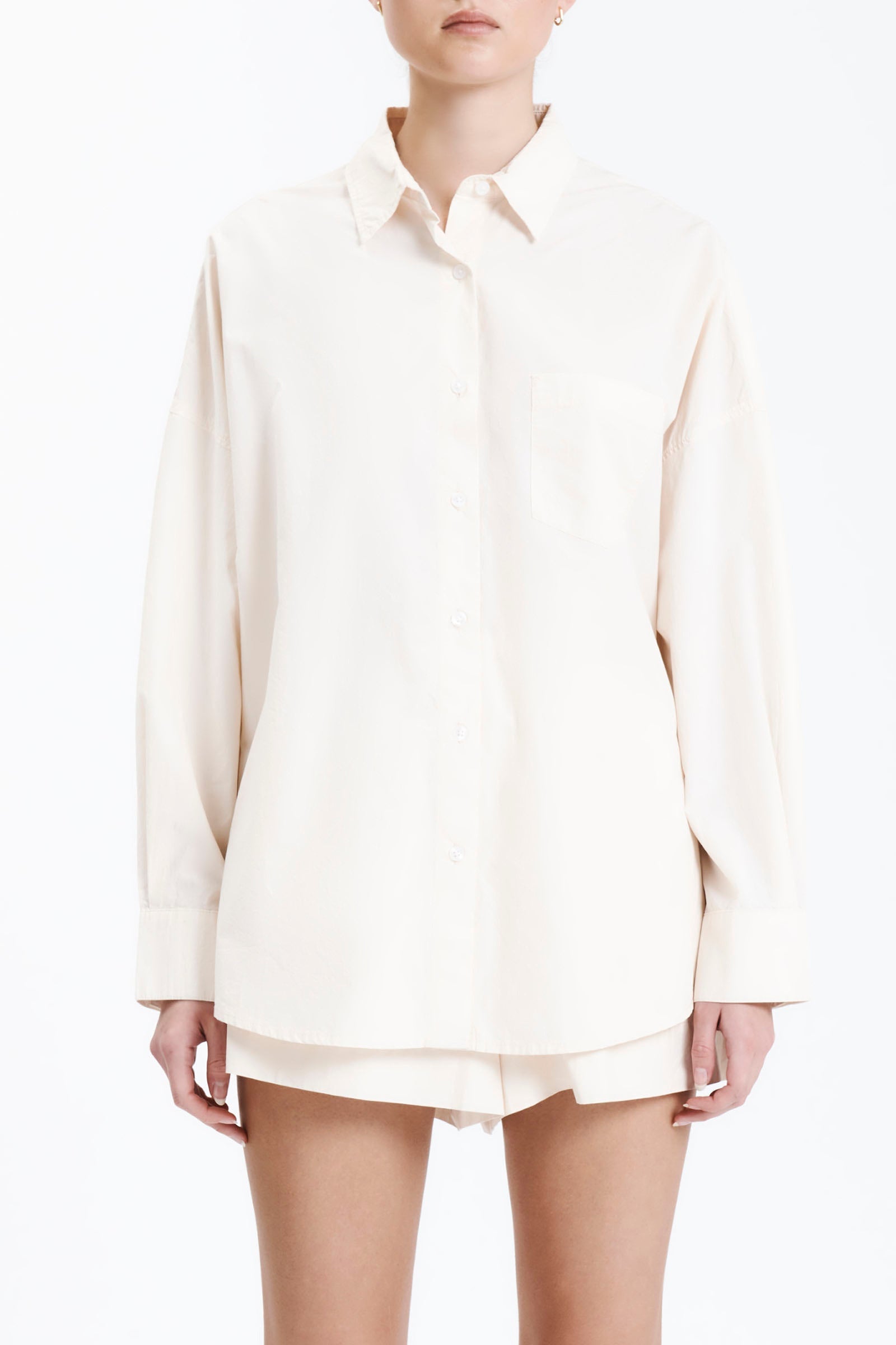 An update from our signature Naya Washed Cotton Shirt. The Cruz Shirt is made from a heavier weight cotton poplin with more structure, washed with a soft peached handfeel. Silhouette is overzised throughout. Classic shirting features include a front patch pocket, traditional shirt collar and front button opening, and a curved hem shape.