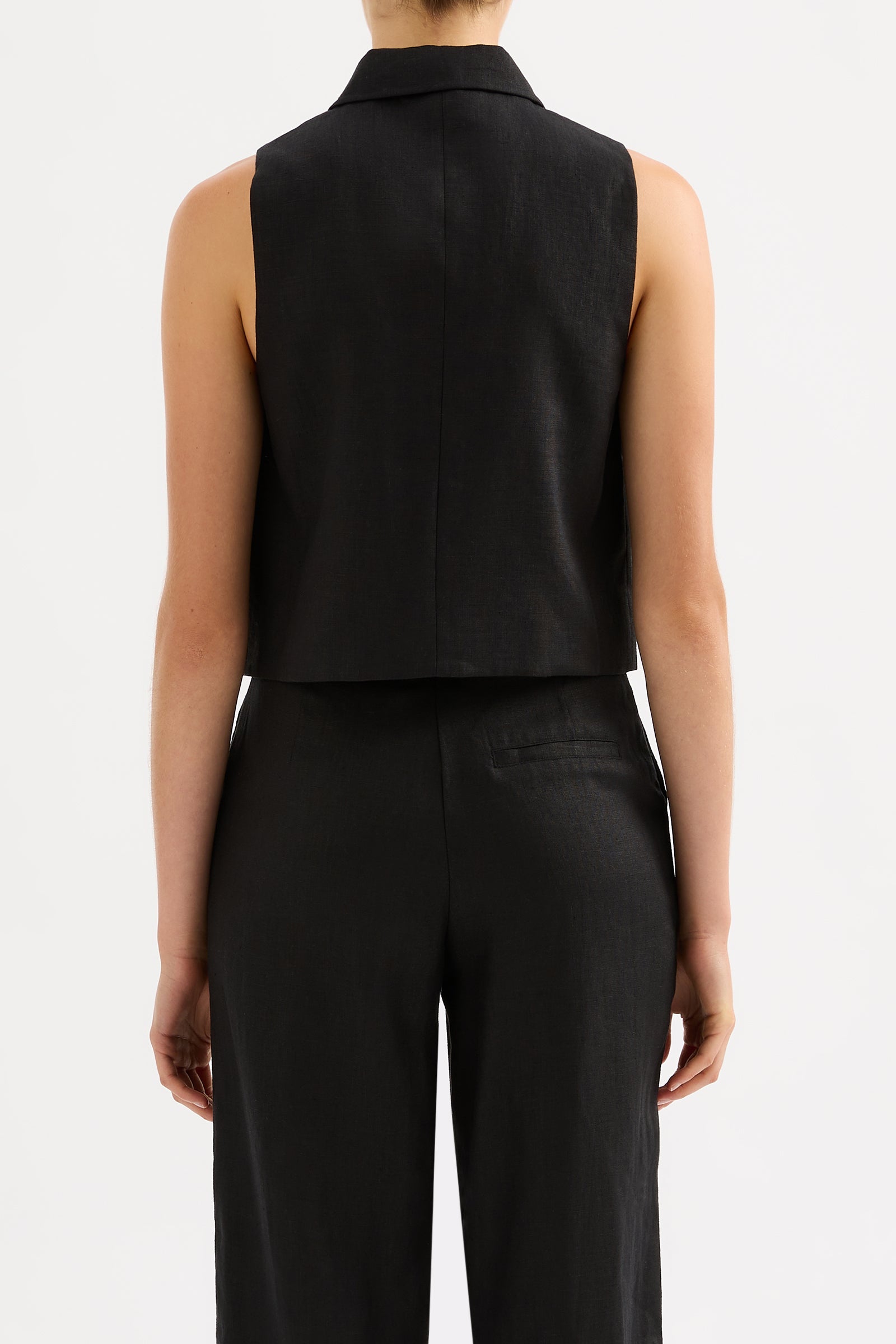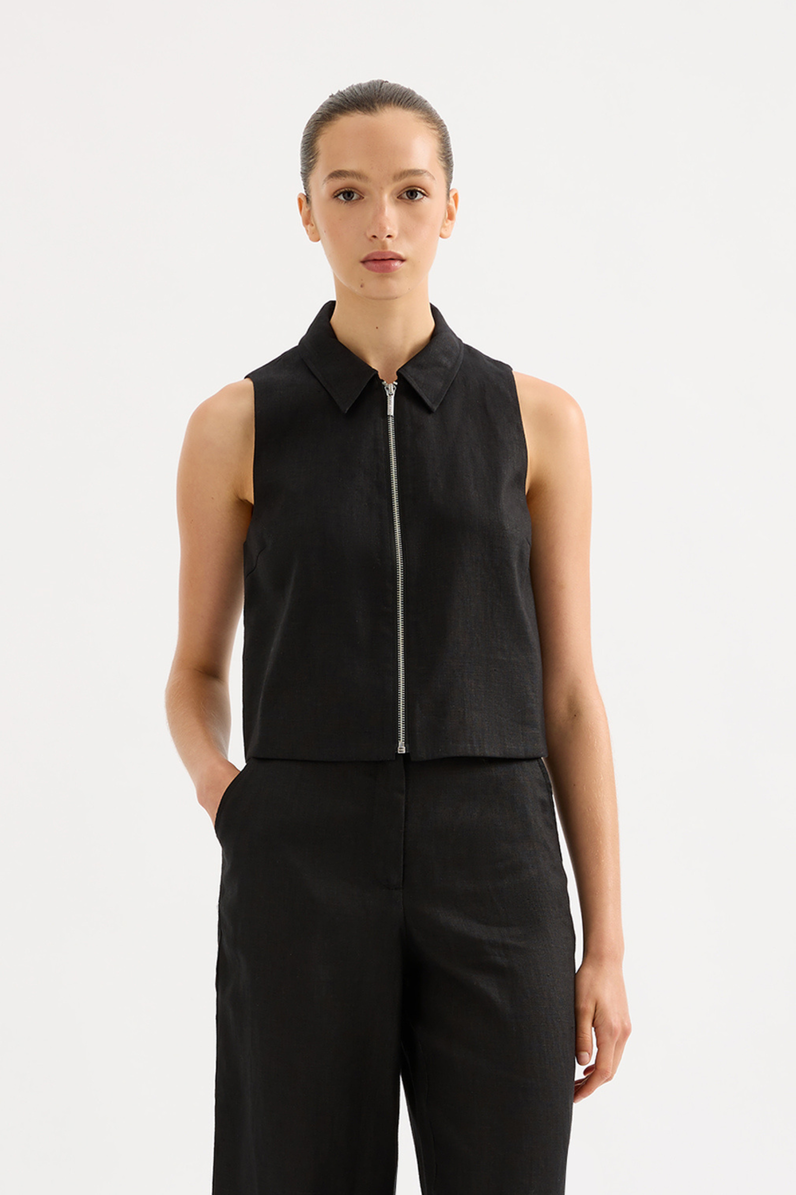 The Dalia Linen Vest is made from a breathable 100% Linen that has been washed for a soft, breathable hand feel. The silhouette is comfortable and cropped, finishing at the waist. Features include a collar and a centre front exposed zipper opening with branded zipper puller.