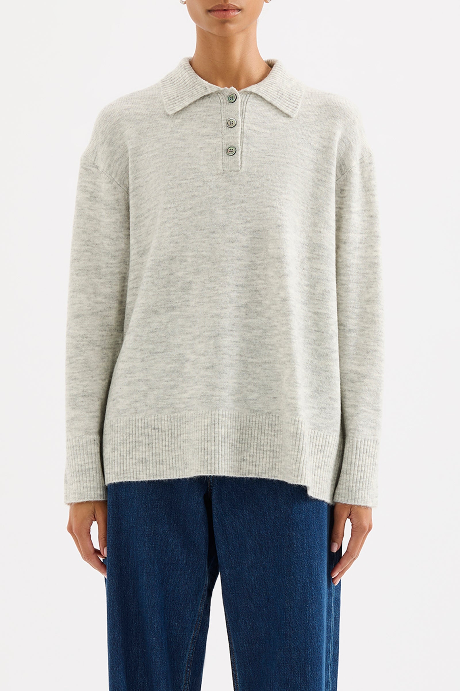 The Dallas Rugby Knit is made from a soft midweight yarn which has a subtle fluffy texture. The fit is relaxed with long sleeves and length finishing below the hips. Features include a fully knitted rugby collar, mock shell buttons and a soft rib hemline and cuffs.