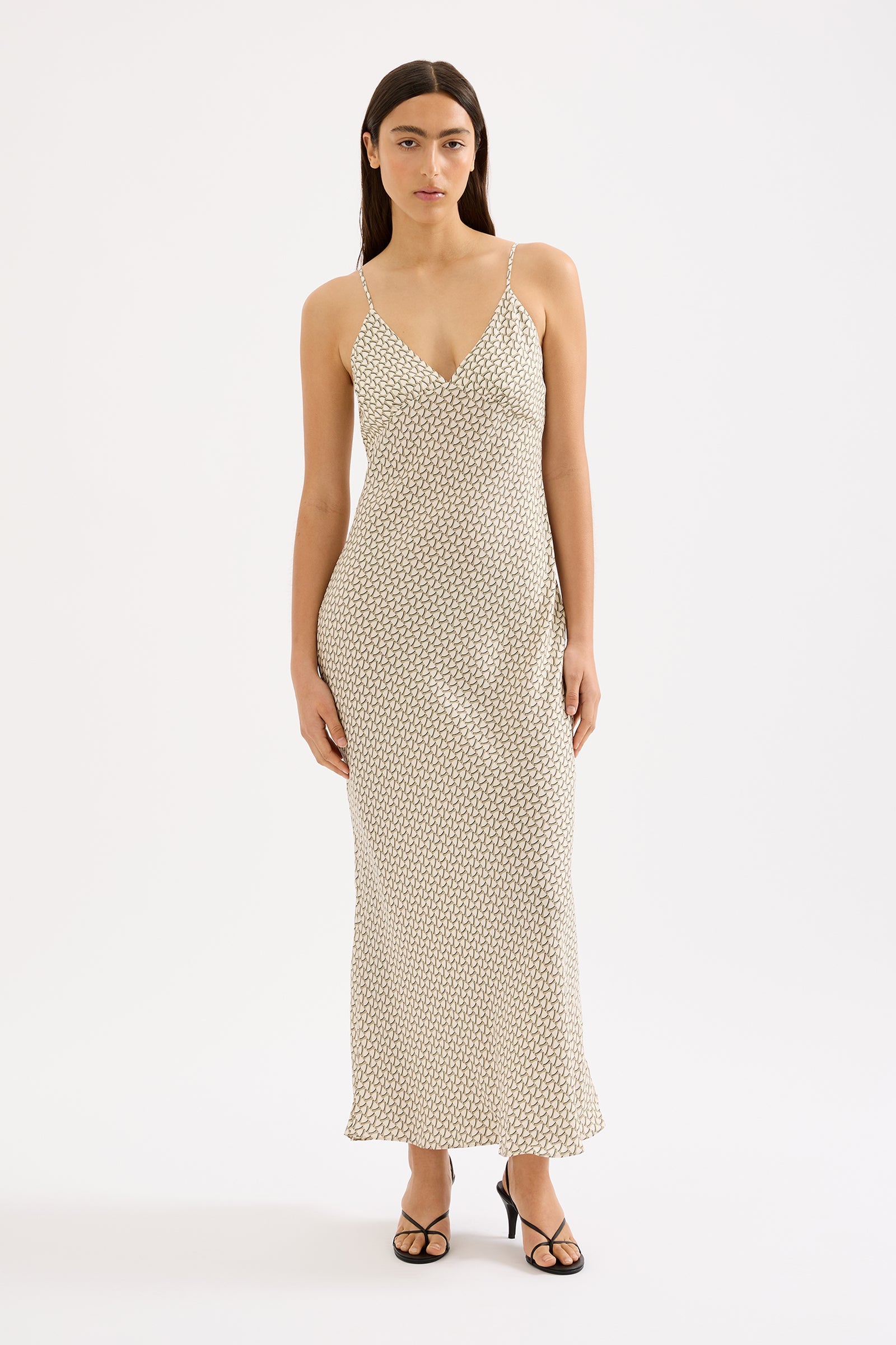 The Delphine Slip Maxi Dress is made in our signature cupro fabrication in our exclusive Delphine print. Cut on the bias, this silhouette drapes over the body softly and finishes ankle length. Features include a v neckline with a gathered under bust seam and adjustable thin straps.