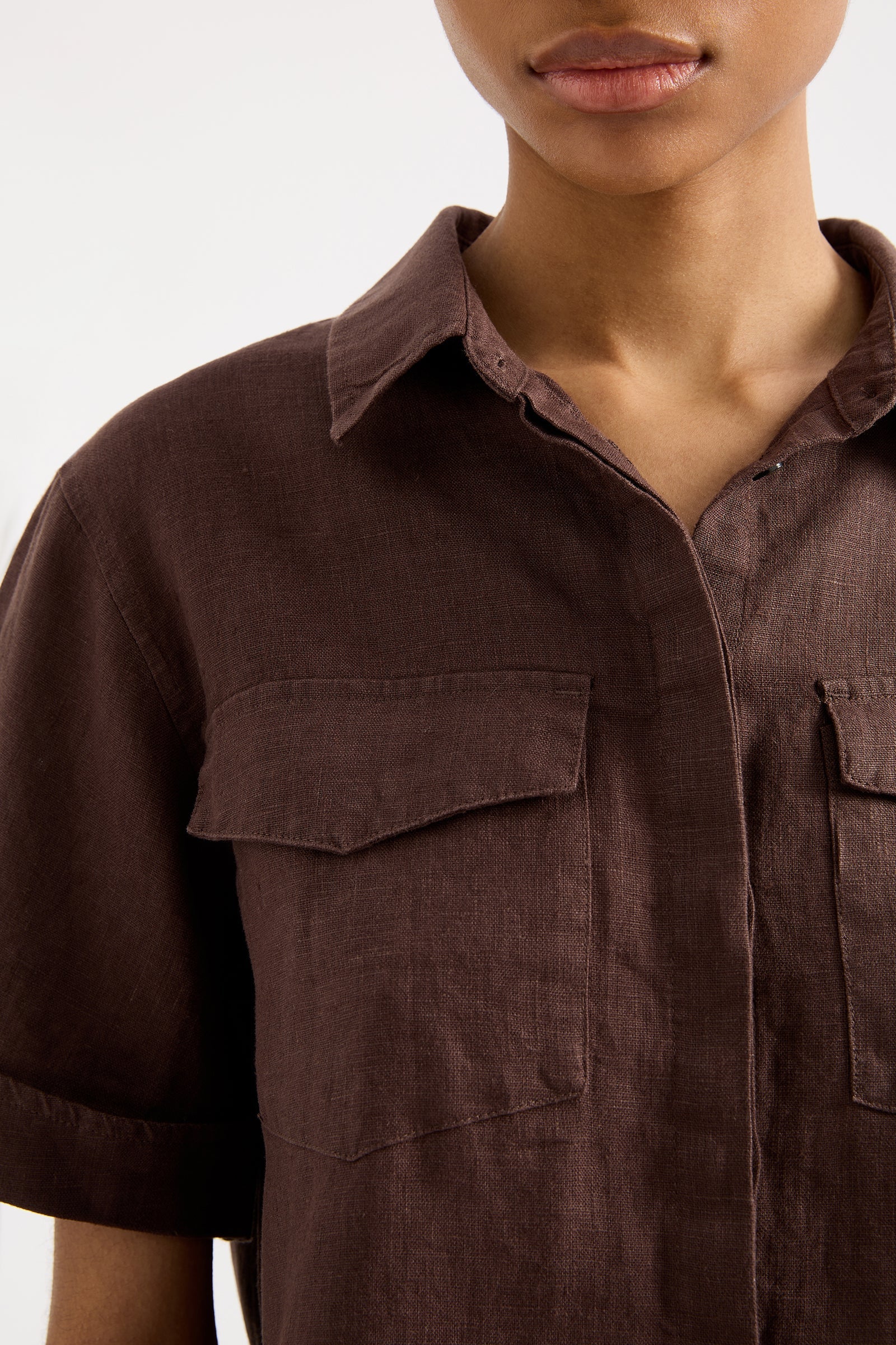 The Desi Linen Shirt is made from a premium linen which has been washed for a smooth, soft hand feel. The silhouette is relaxed, with length finishing at the hip. Features include classic shirting details with front patch pockets, rolled sleeve cuff and shell buttons.