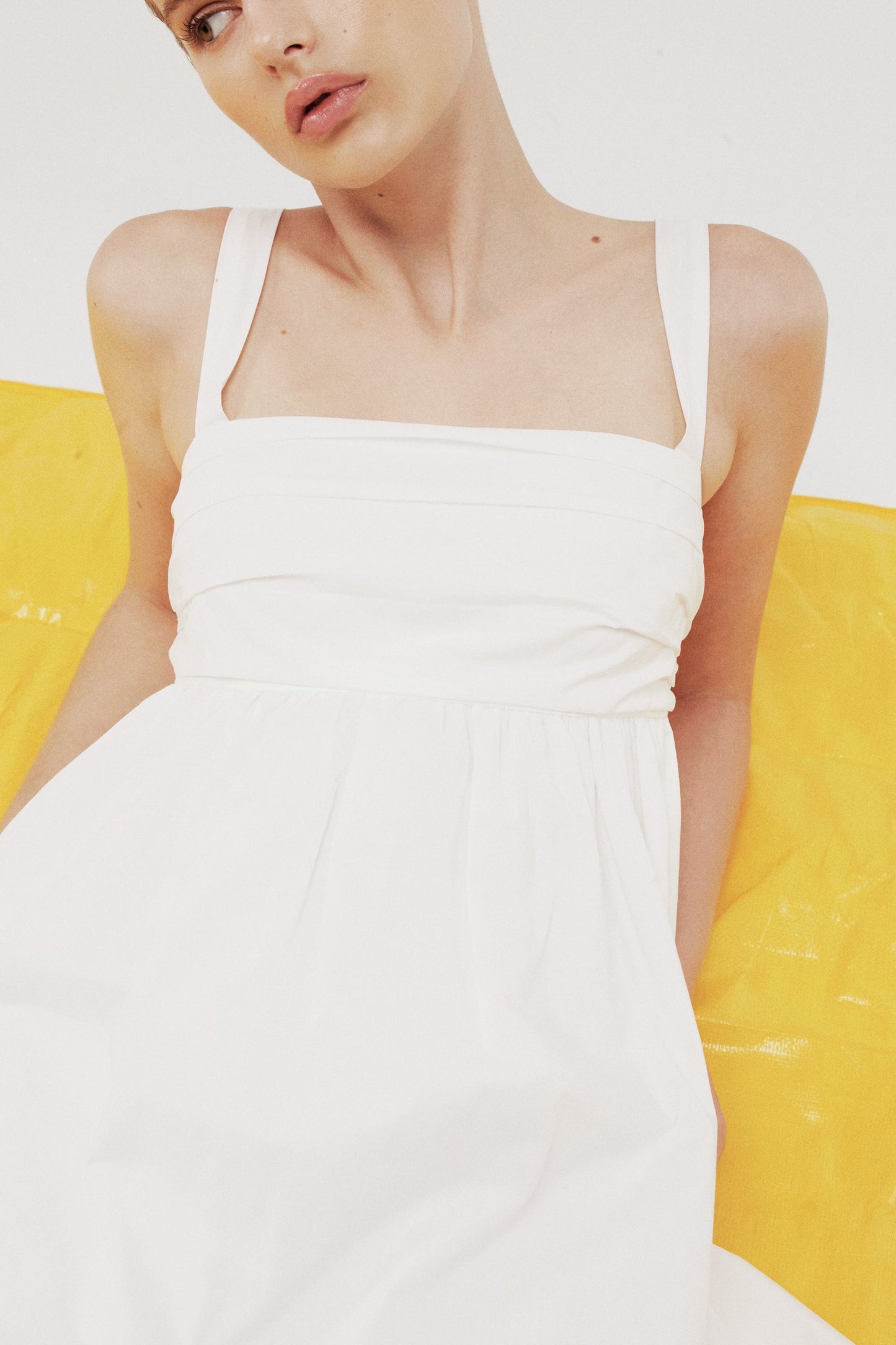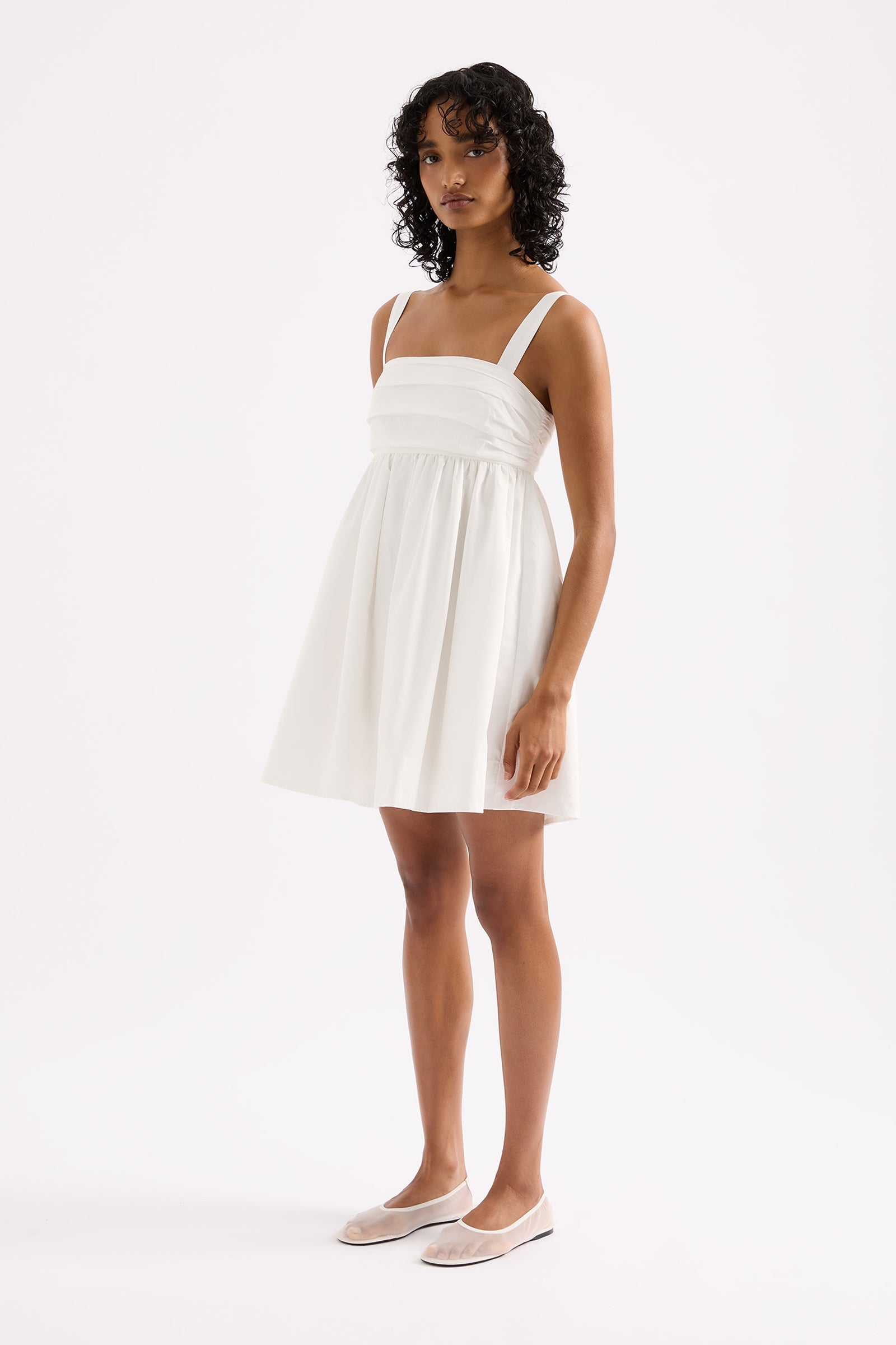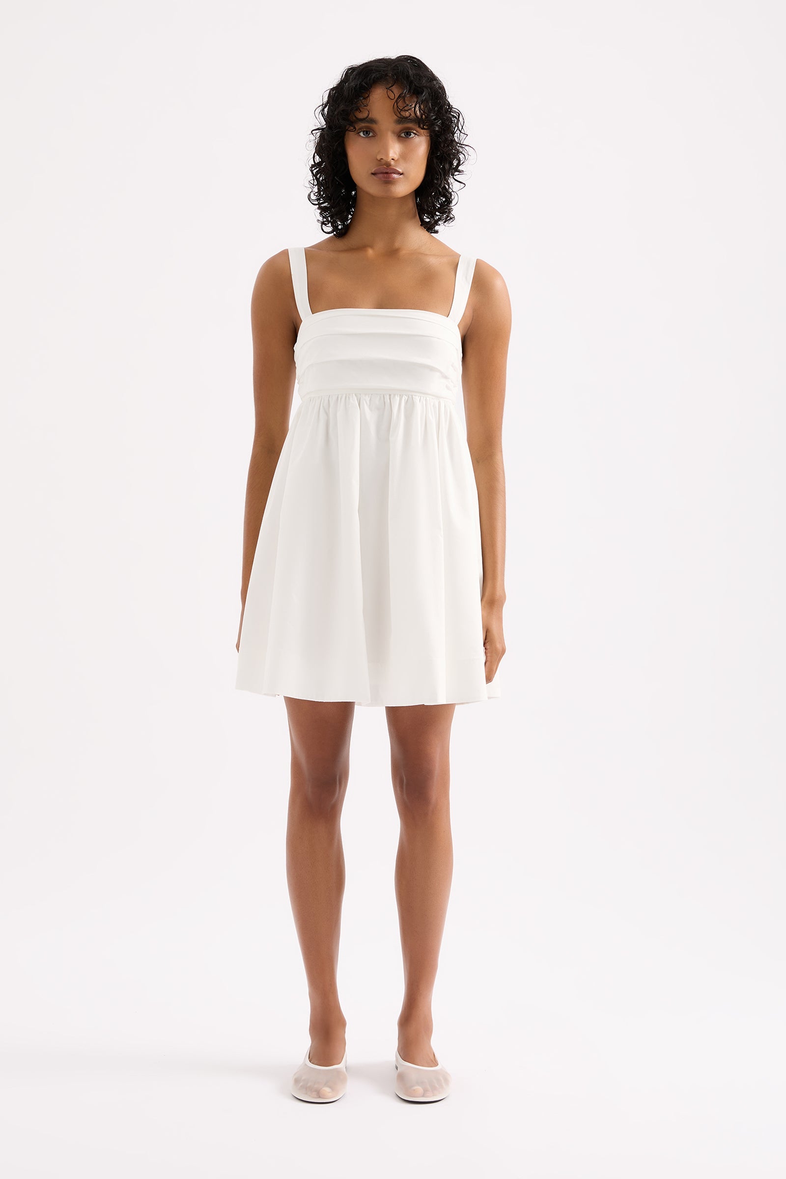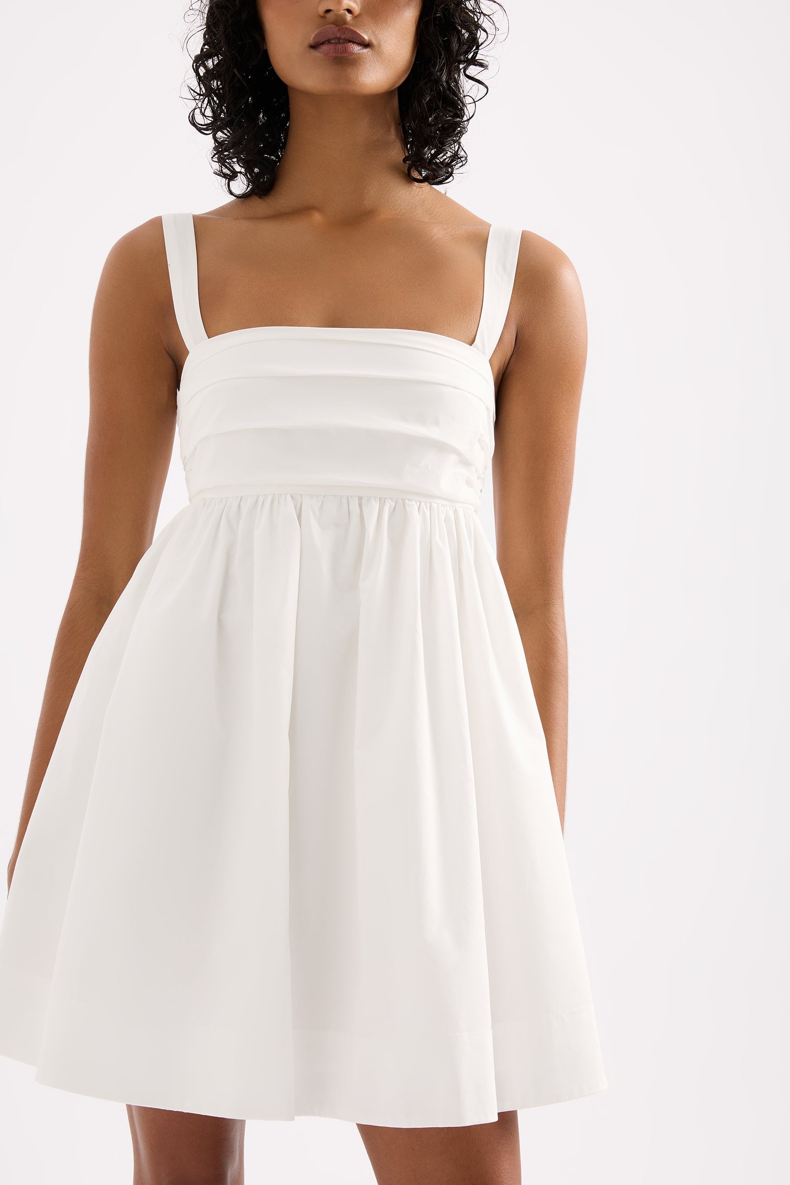 The Drea Mini Dress is made from a cotton poplin which has be washed for a smooth, crisp hand feel. The babydoll silhouette is feminine and relaxed with a square neckline and soft billowing skirt finishing mini in length. Features include tuck detail at bust, invisible zipper and adjustable straps. This dress is fully lined.