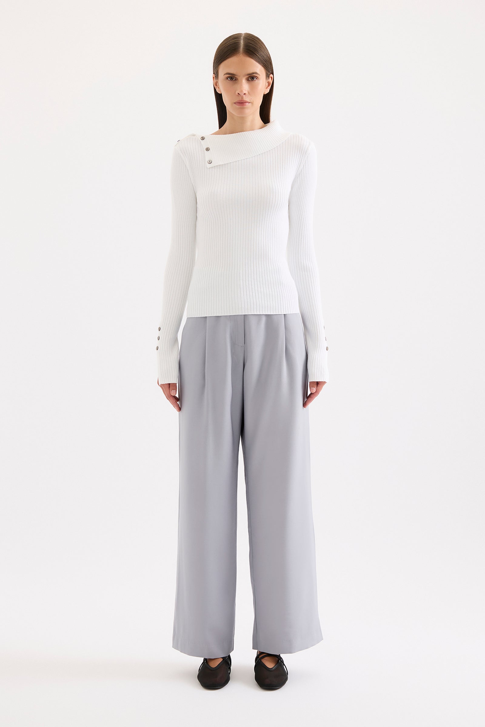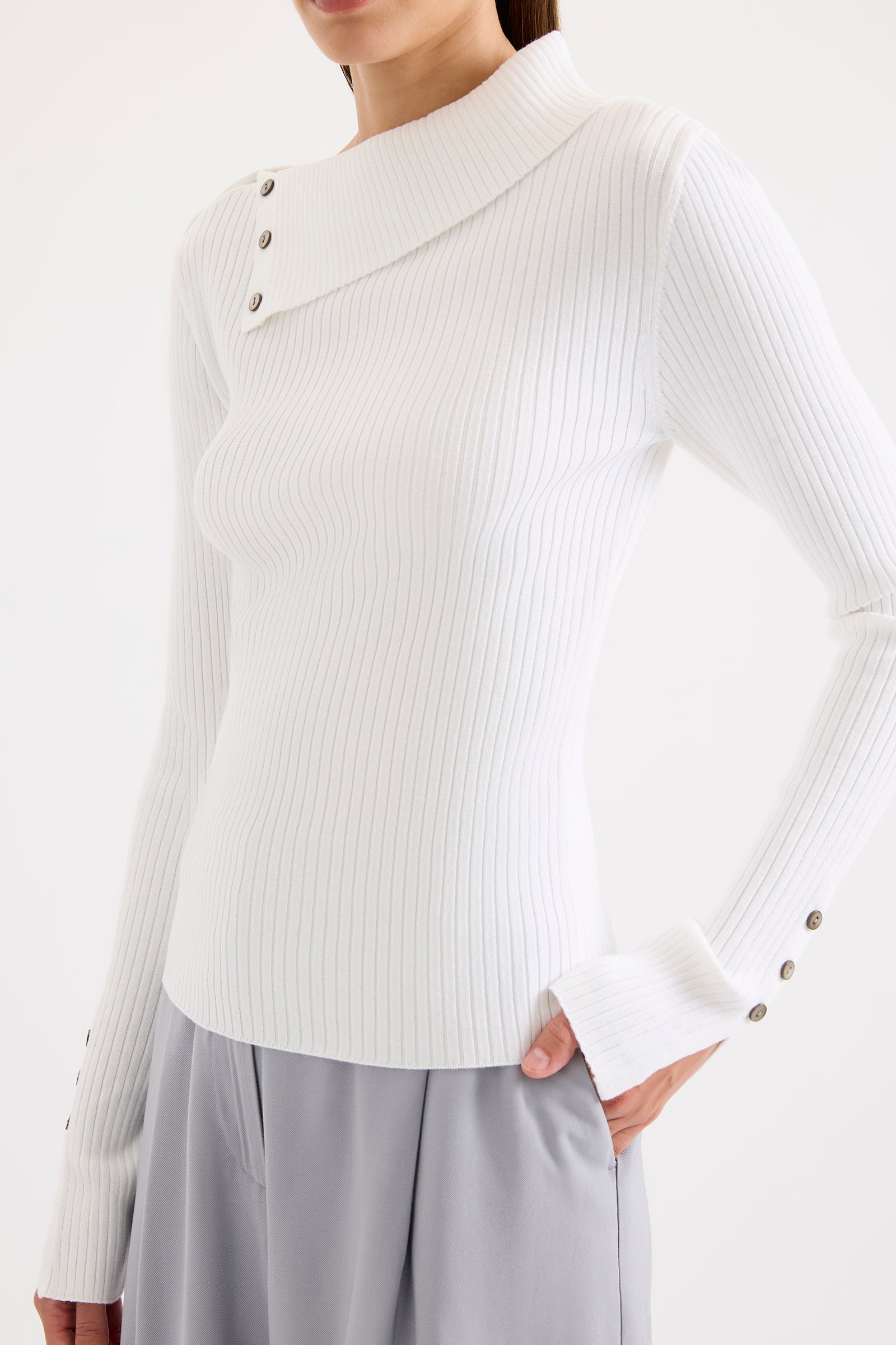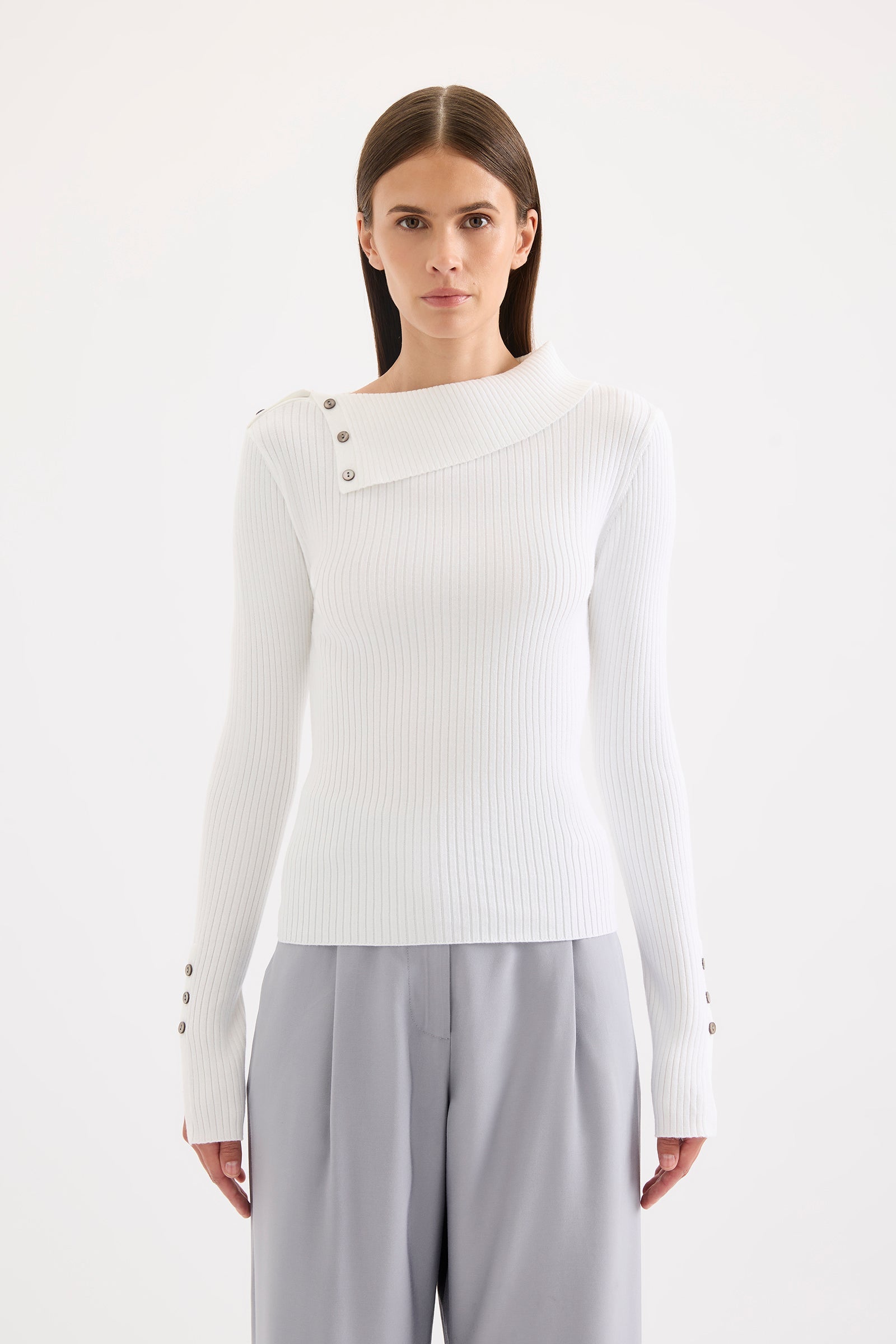 The Dreyfos Knit LS Top is made from a cotton blend yarn which has a ribbed, soft hand feel. The silhouette is fitted to the body with long sleeves and length finishing above the hips. Features include an asymmetric knitted collar, shell buttons and splits at sleeve hems.