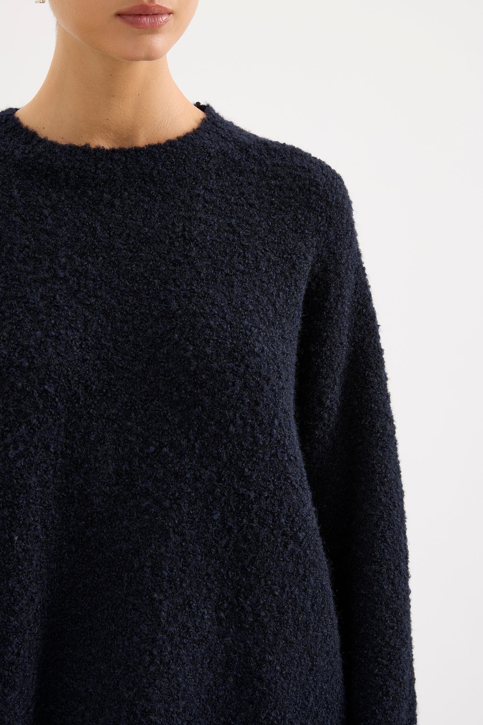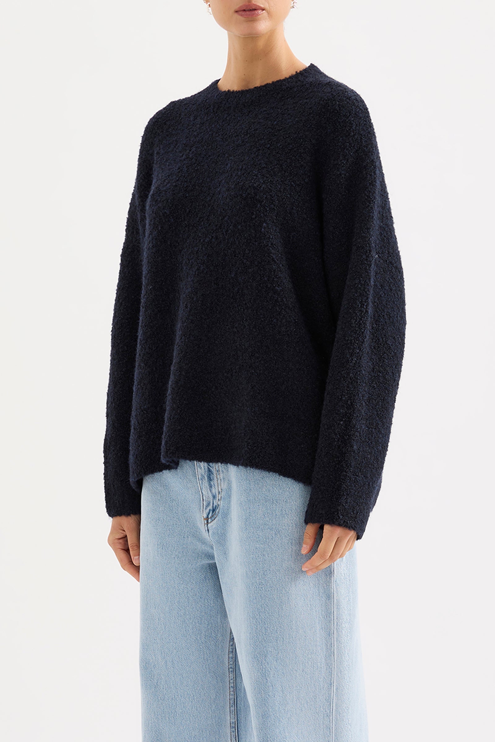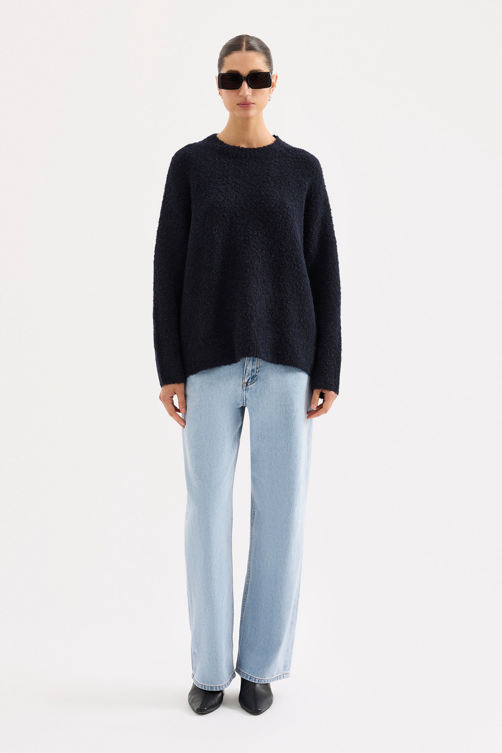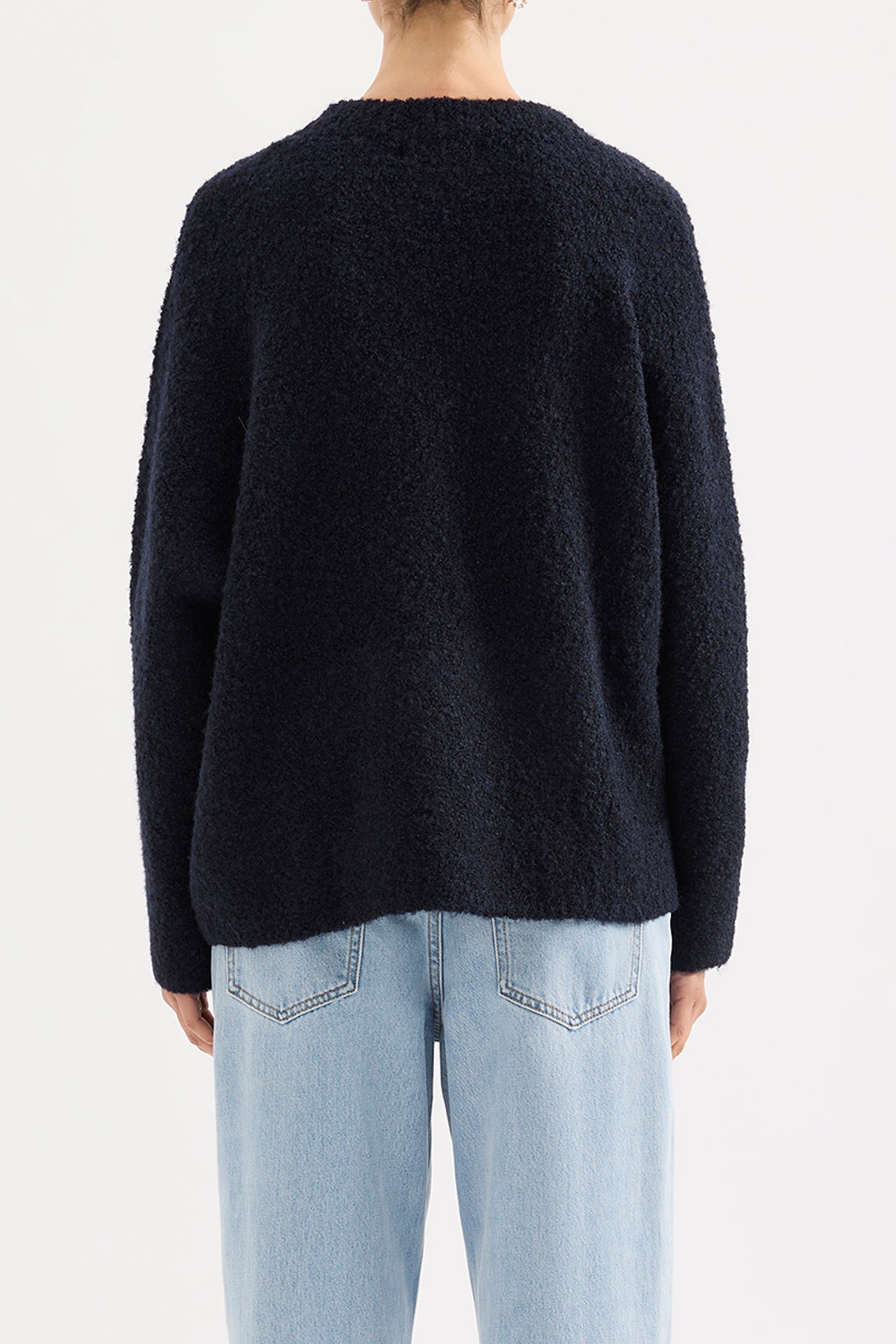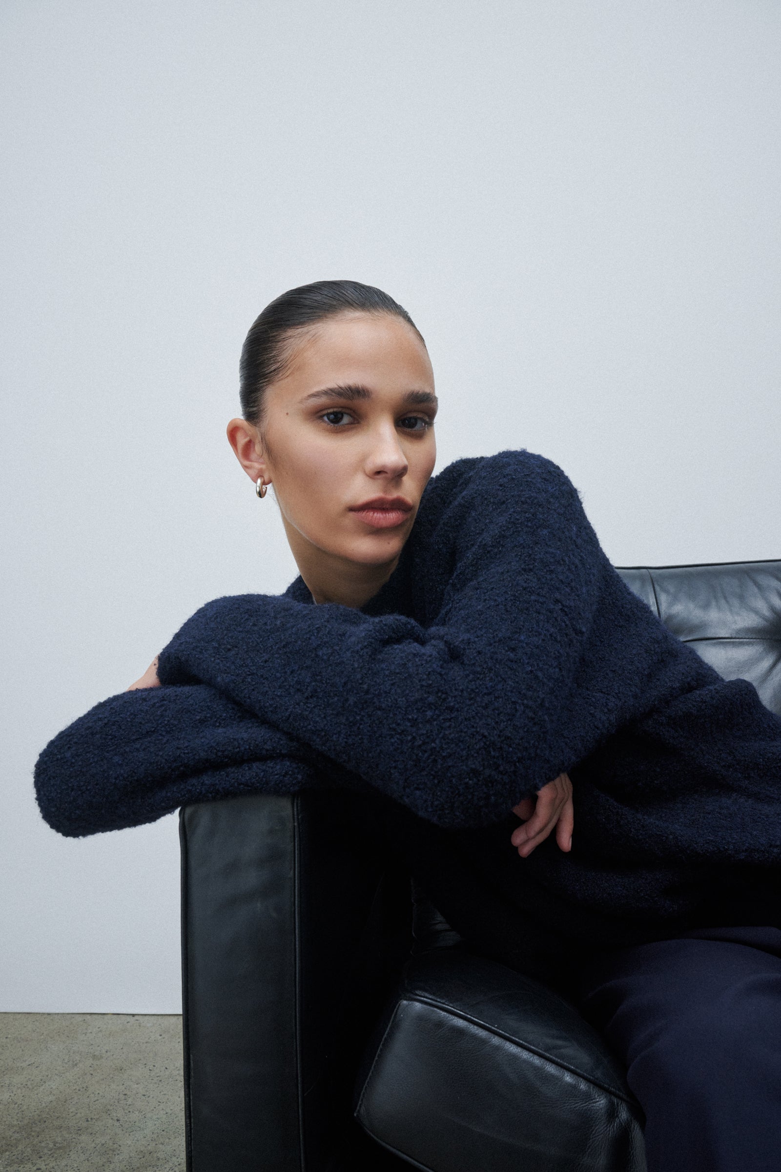 The Elias Knit is made from a recycled, heavyweight yarn which is super soft and has a slight marle effect. The fit is oversized with length finishing above the hips. Features include a crew neckline with ribbed cuff and hem.