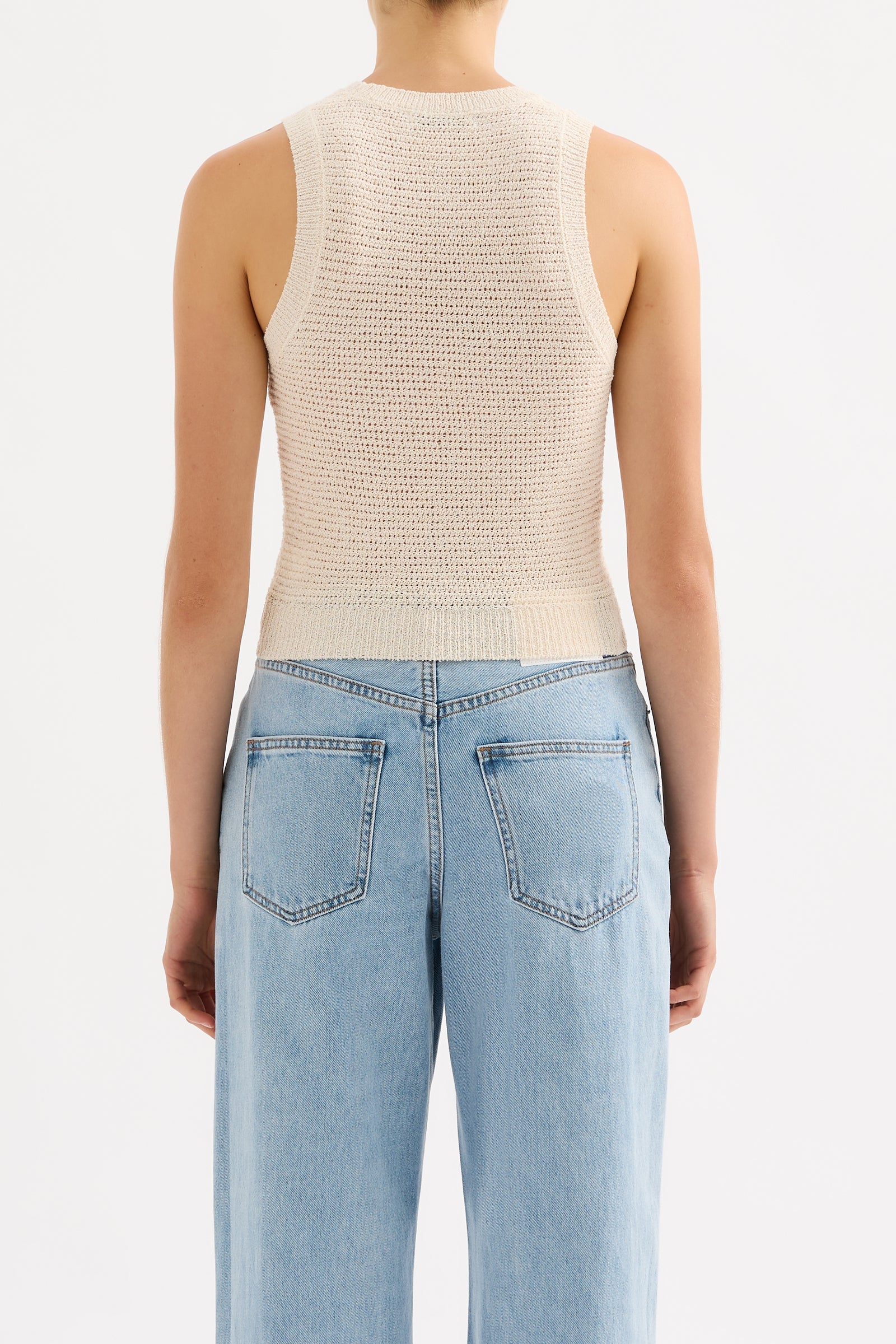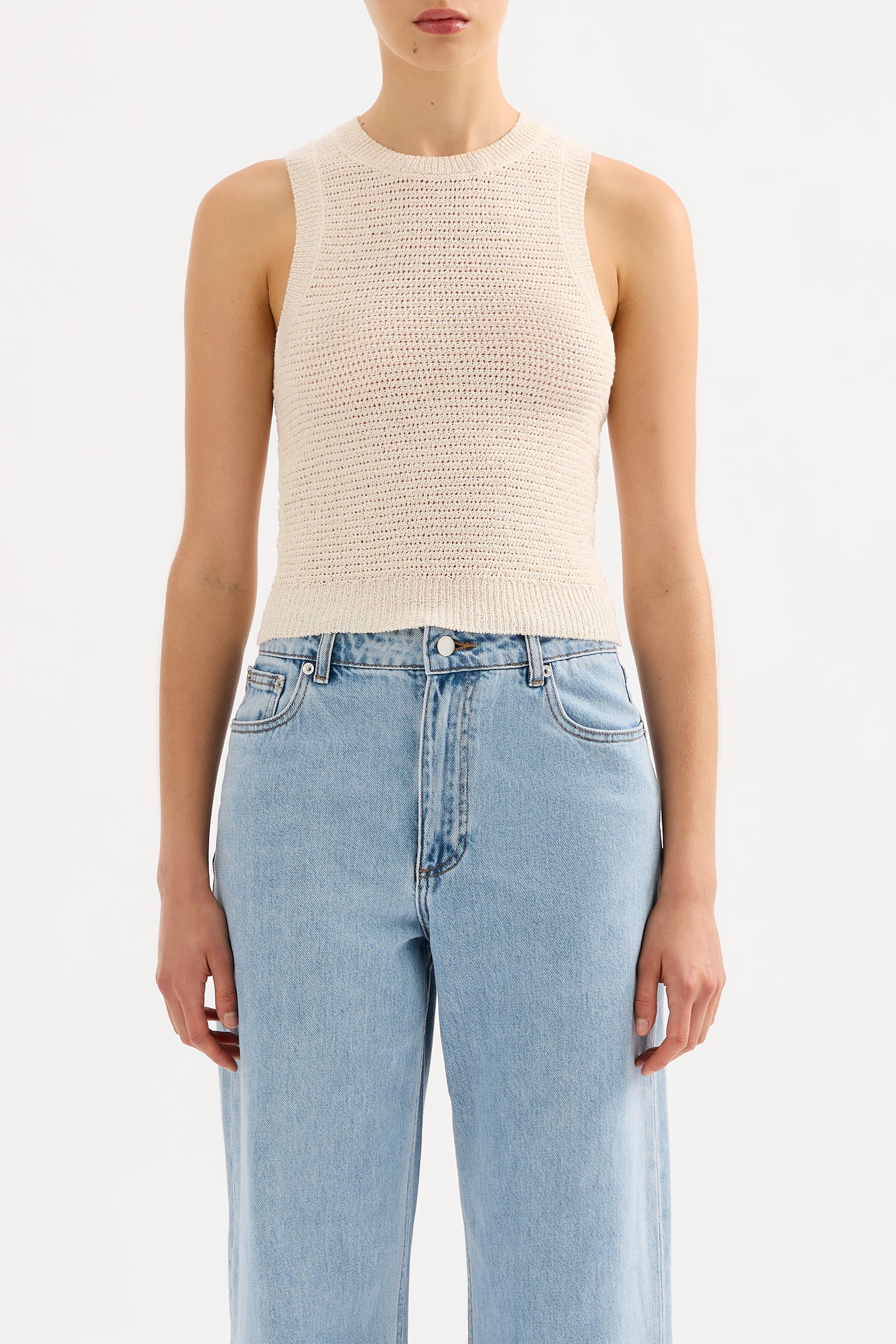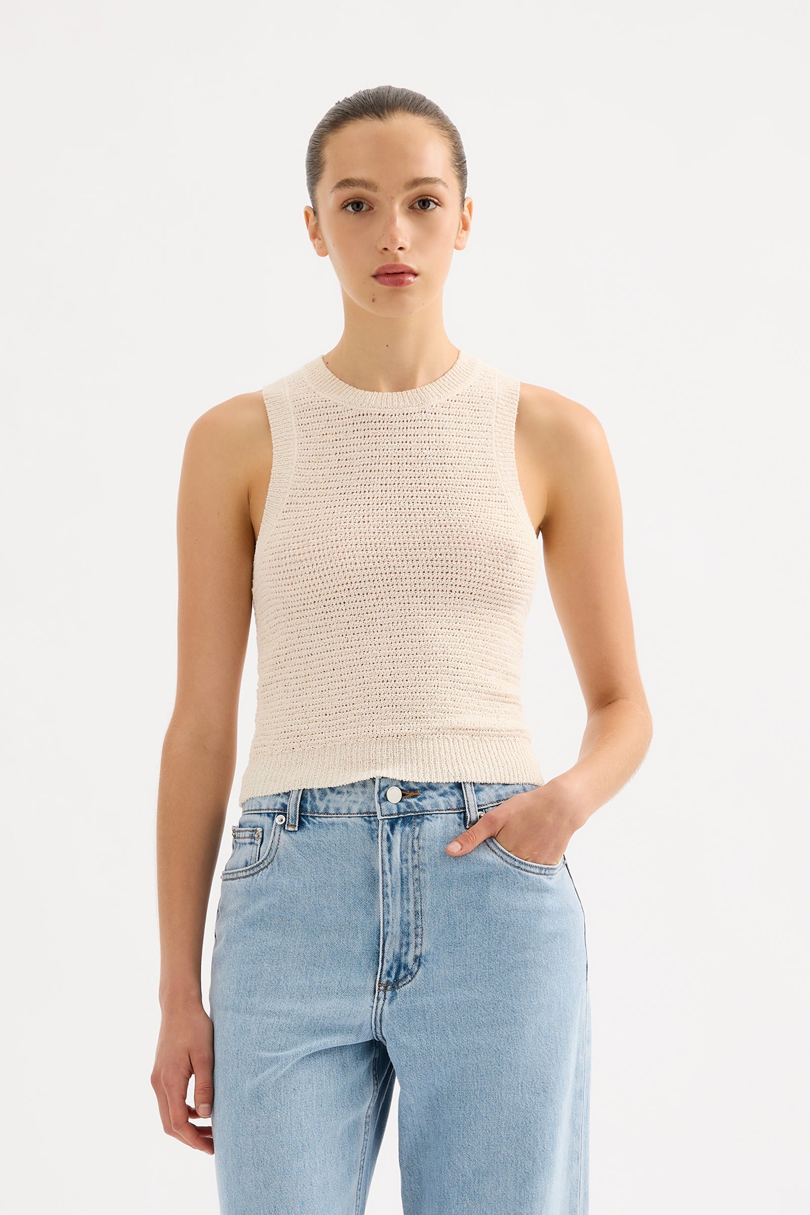 The Ember Knit Tank is made from a lightweight yarn that's soft on the skin and has a mottled texture. The silhouette is slim fitting with a racer tank cut and cropped length. Features include rib construction around neckline, armhole and hem.