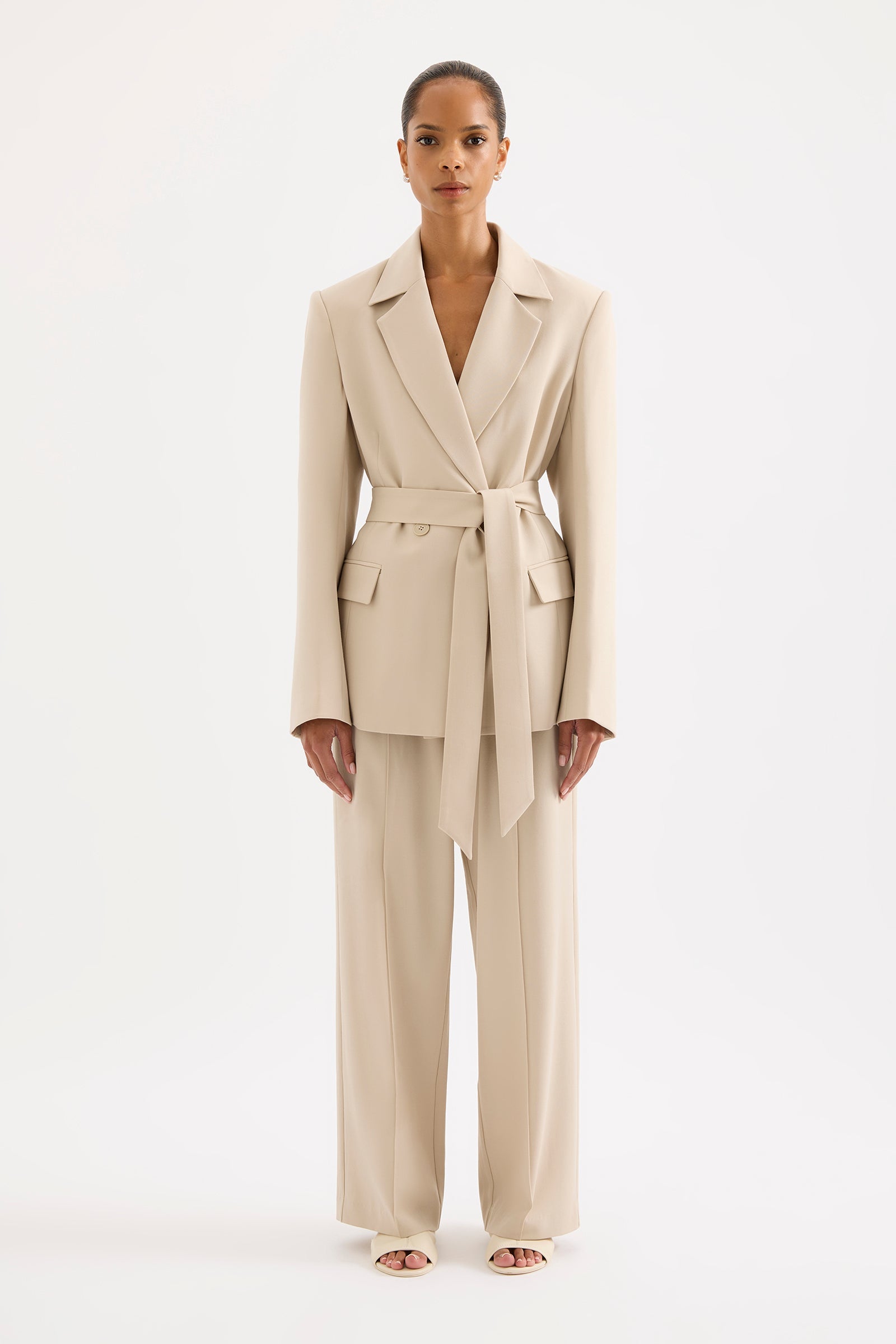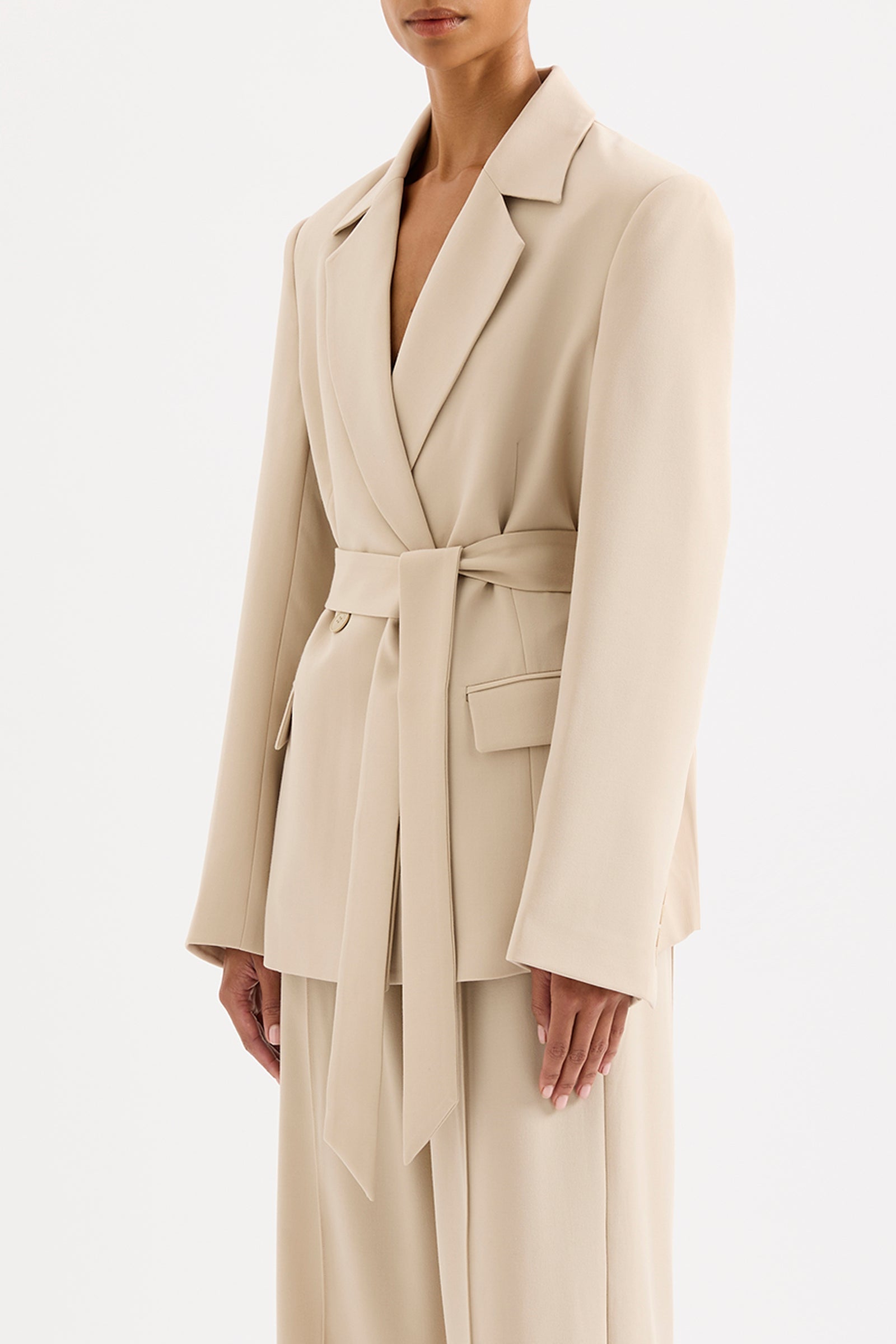 The Eryn Blazer is made from a classic suiting fabrication with a smooth hand feel. The silhouette is a structured double breasted shape with classic sloped shoulder, relaxed to slim fit body & full length sleeve. Features include traditional tailoring detailing throughout, tailored vents at sleeves and back of body, Nude Lucy branded buttons and tie at waist.
