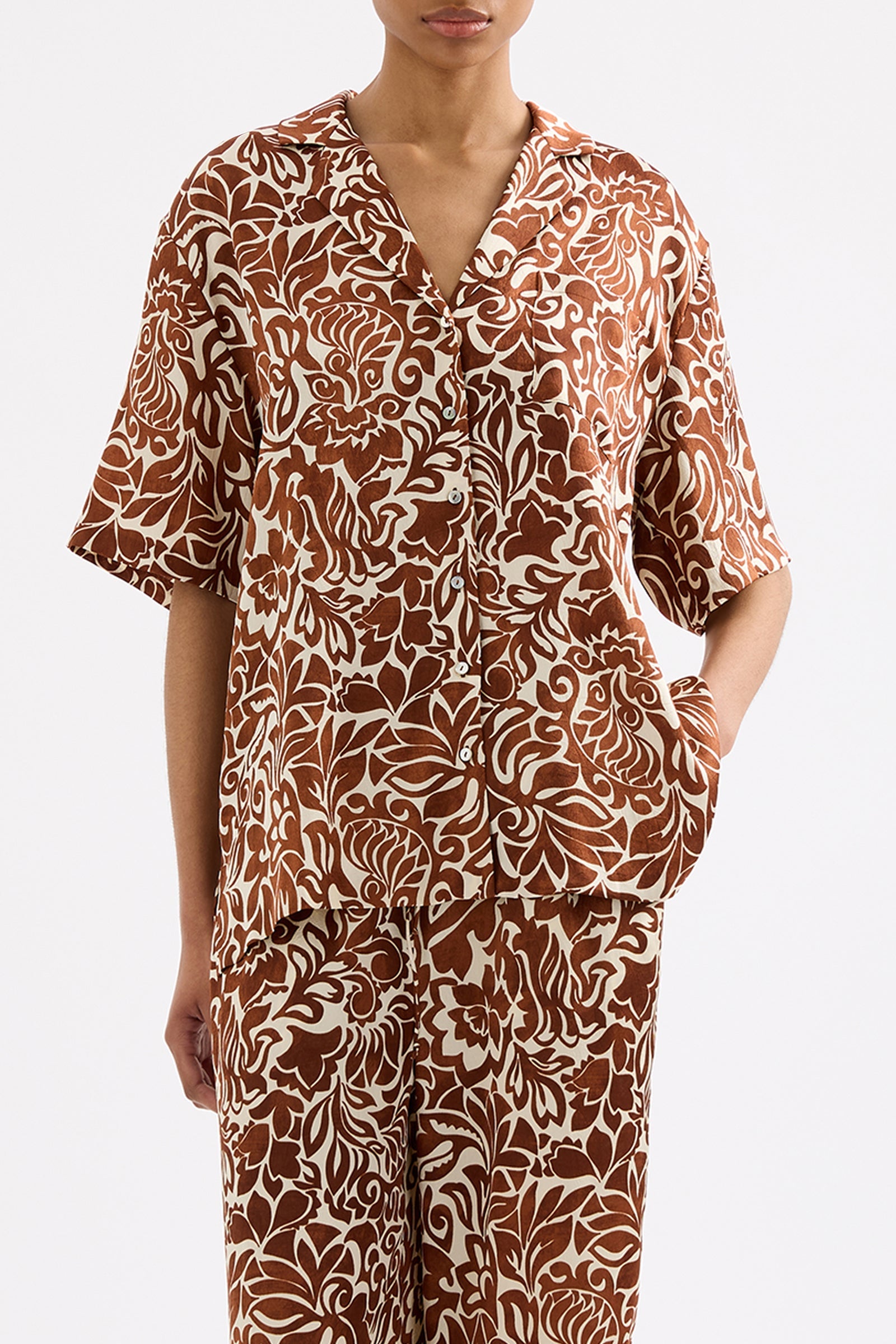 The Florense Shirt is made from a recycled polyester fabrication in our exclusive Florense print. The silhouette is an oversized fit, with length finishing at the hip. Features include classic shirting details with front pocket and shell buttons.