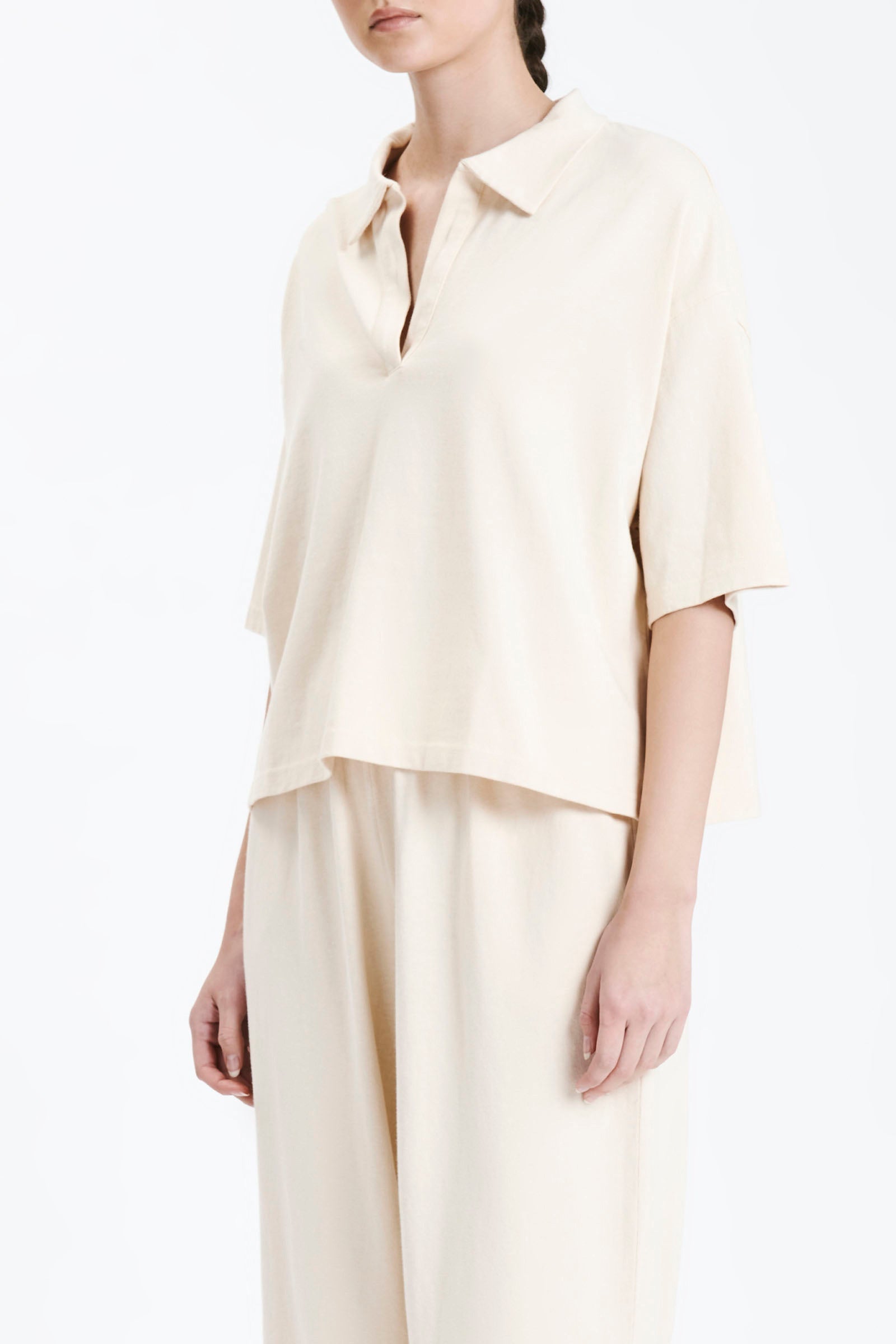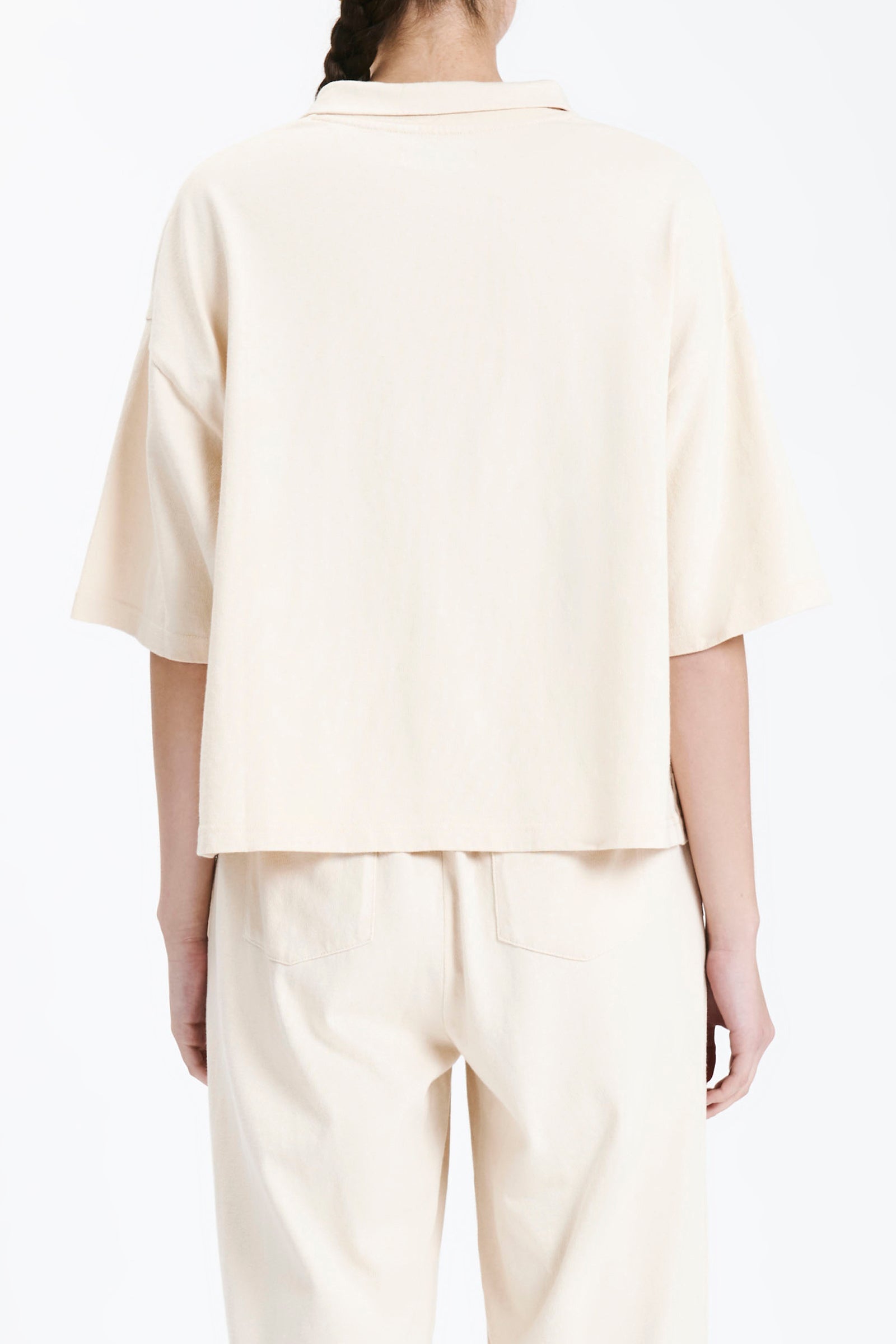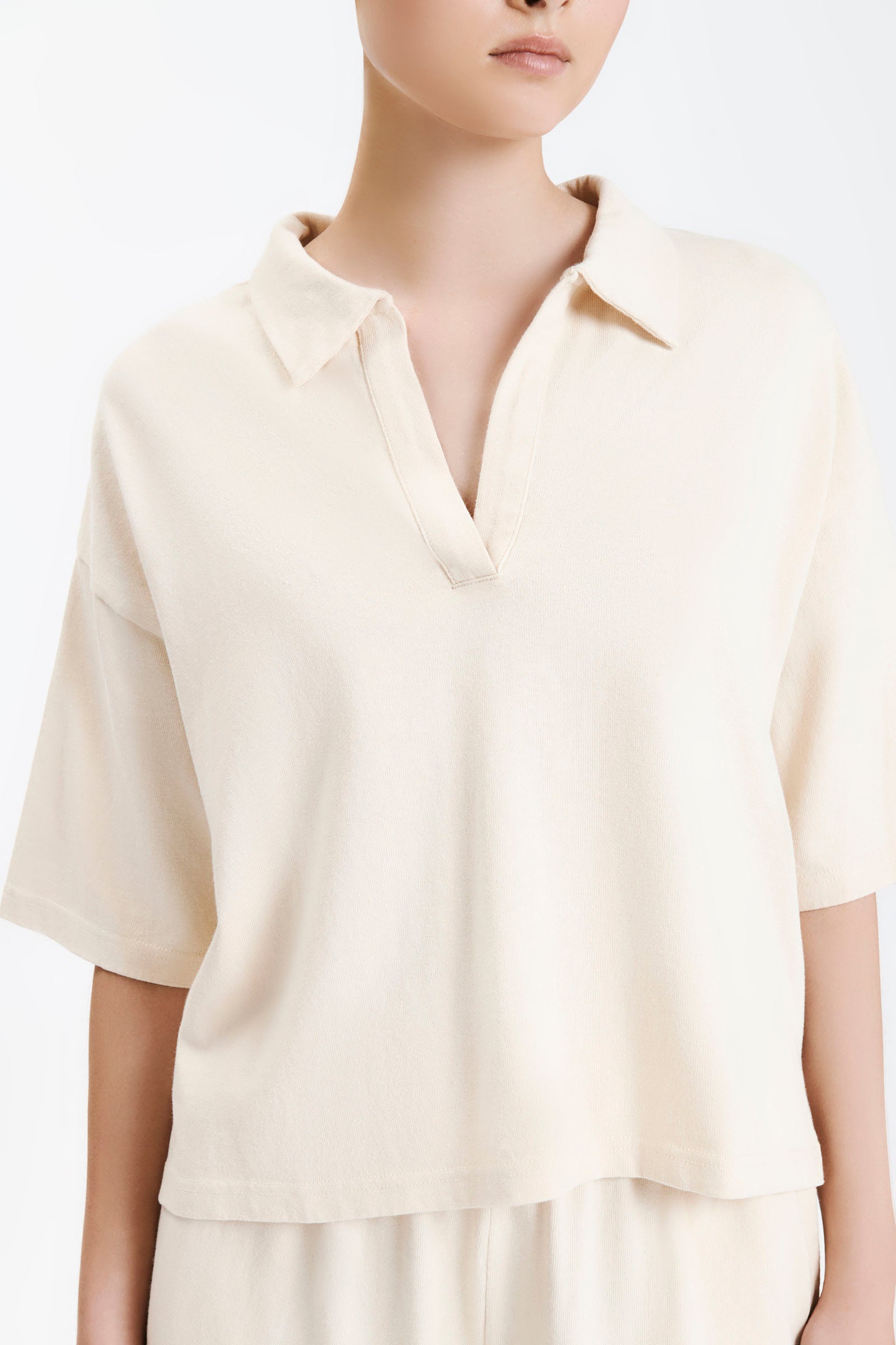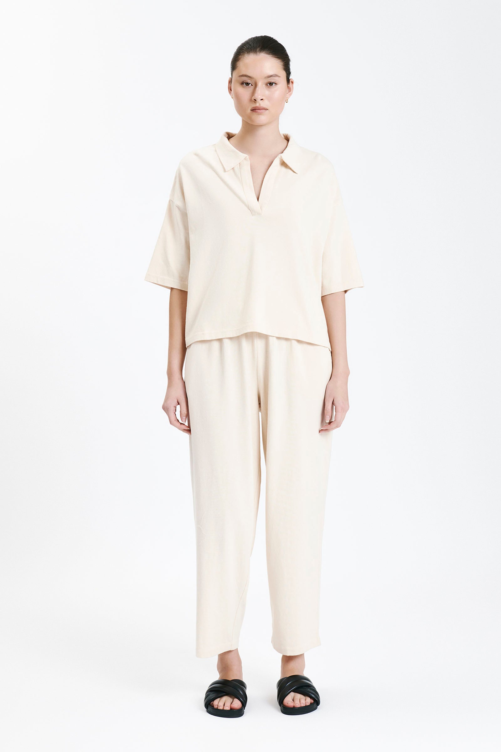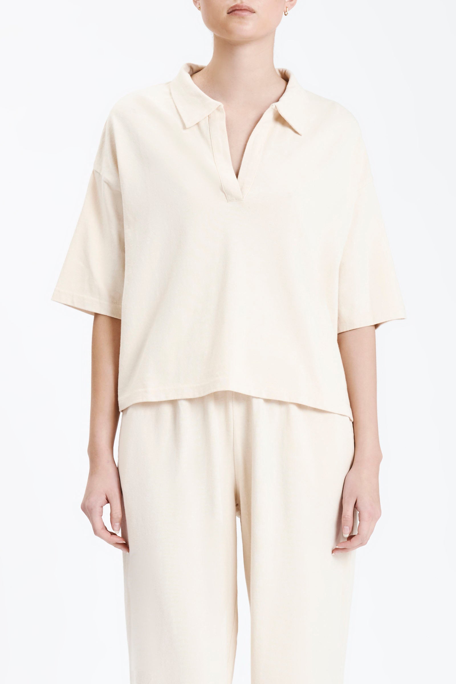 Cut in a premium 100% cotton jersey with a heavyweight but breathable handfeel. The Fresno Rugby Top is a slightly oversized relaxed fit with a dropped shoulder and length finishing on the hips. Features include a classic rugby collar, short sleeves that finish at elbow length and small side seam slits at hem. Pair with the Fresno Pant for a coordinating look.