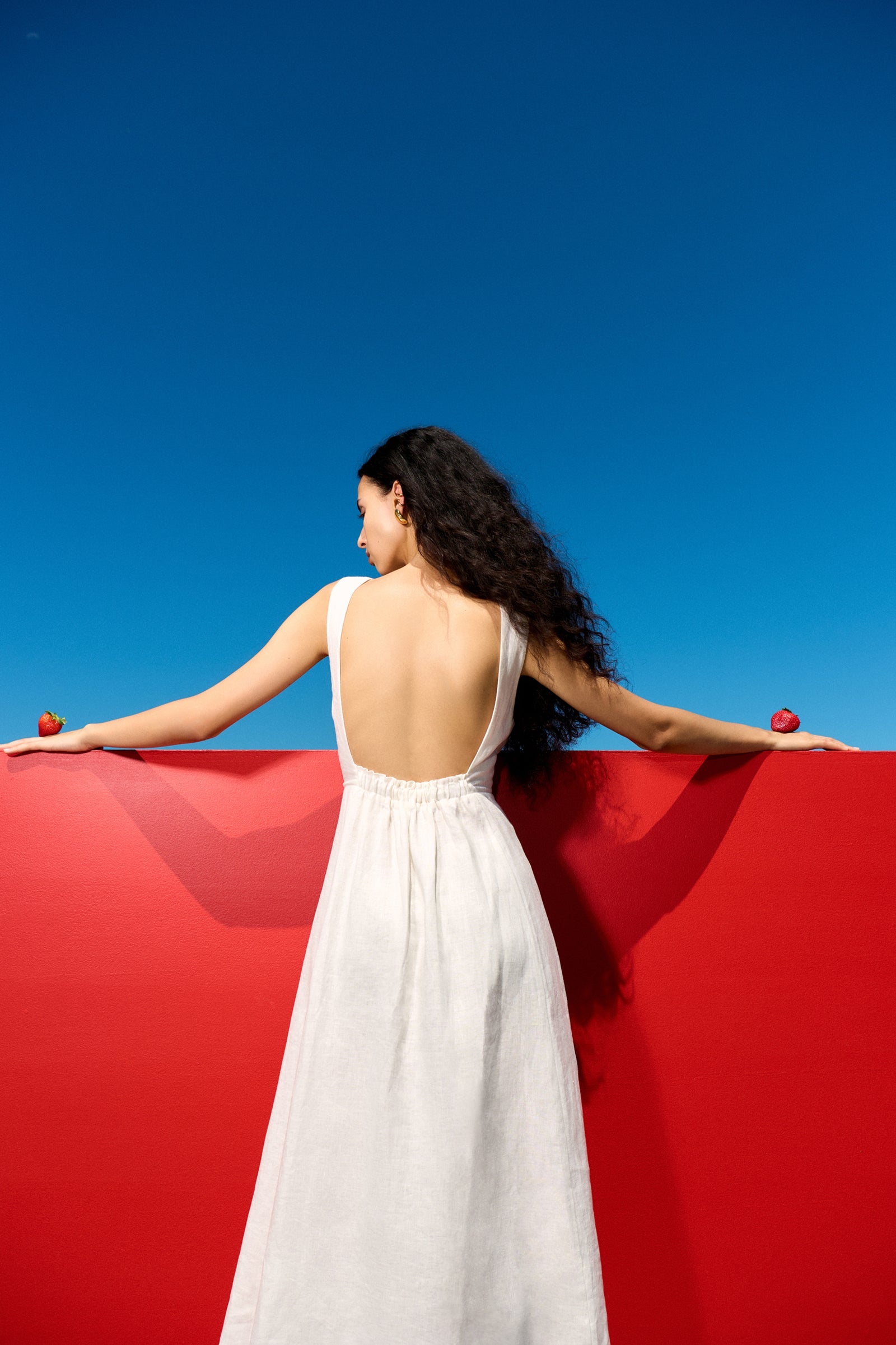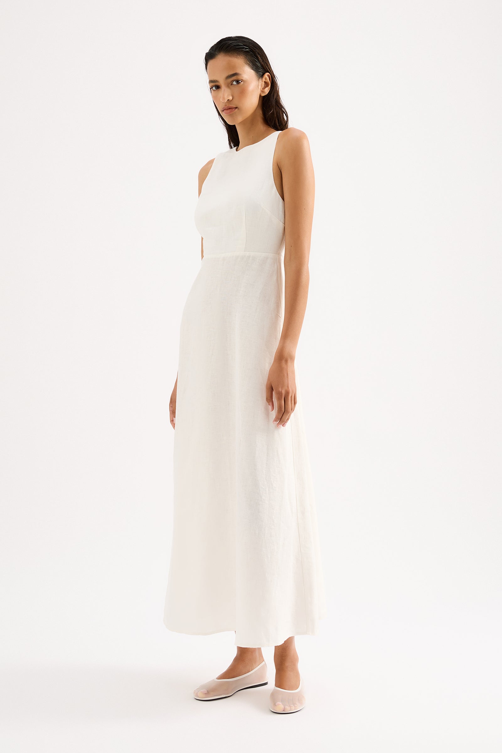The Gael Linen Maxi Dress is made from a premium linen which has been washed for a smooth, soft handfeel.  The silhouette is feminine with a fitted bodice and an A-line maxi length skirt. Features include high front neck and open back with elasticated waist detail and gathering.