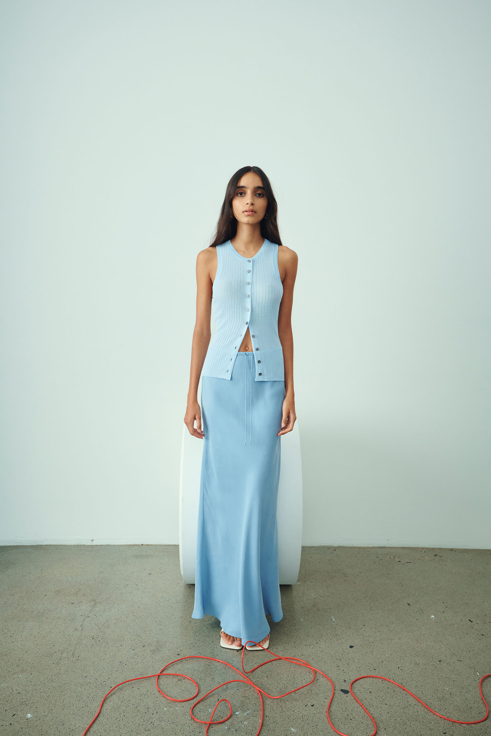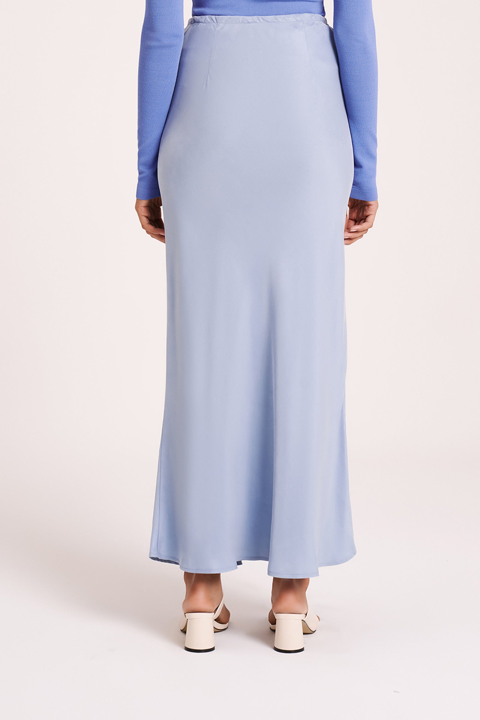 The Hayz Cupro Maxi Skirt in sky is made in our signature cupro fabrication which has a soft, sueded hand feel. Cut on the bias, this silhouette finishes just above the ankles. Features include encased elasticated waistband with a self cut draw string at centre front.