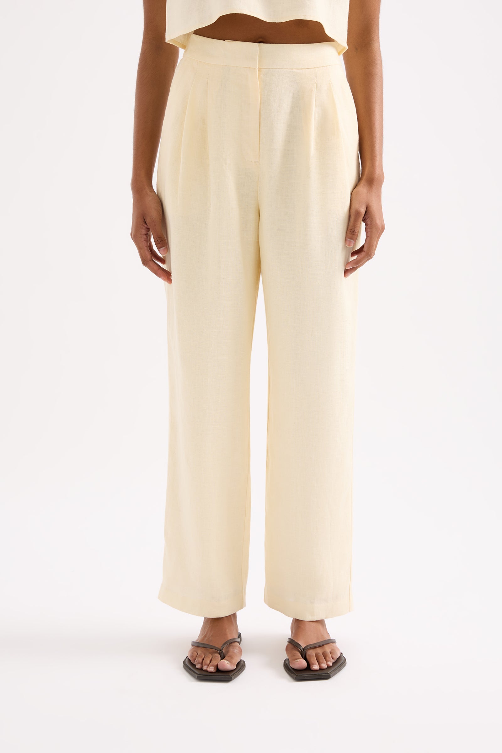 The Ingrid Linen Pant is made from a premium linen which has been washed for a soft, breathable hand feel. The silhouette is a classic high rise with a tapered leg and cropped length finishing at ankle length. Features include front pleats at waist, elasticated back waistband & concealed button and trouser hook closure.