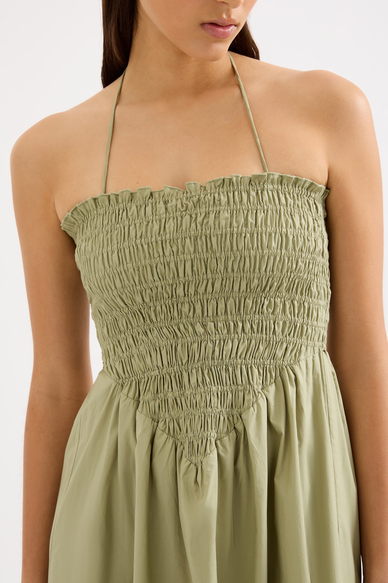 The Inka Maxi Dress is made from a cotton poplin which has be washed for a smooth, crisp hand feel. The silhouette is feminine and relaxed with a shirred elasticated bodice and soft billowing skirt that finishes above the ankle. Features include halter tie and side splits at the hem.