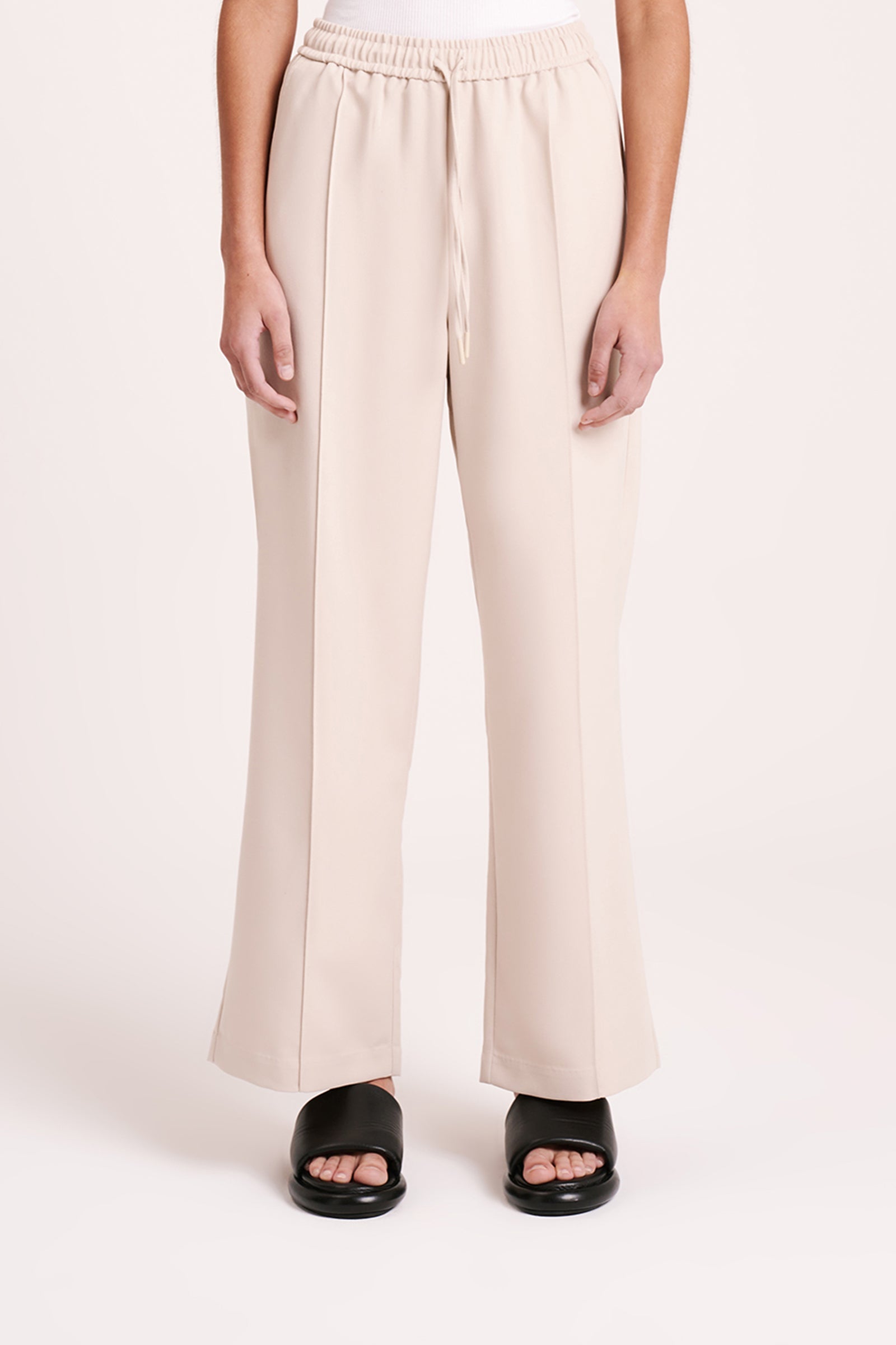 The Jai Pant is made from a lightweight tailoring fabric which has a smooth handfeel. The silhouette is a relaxed full length. Features include an elasticated waistband with an external drawstring, pinstitch down the centre of the legs, and side seam pockets.