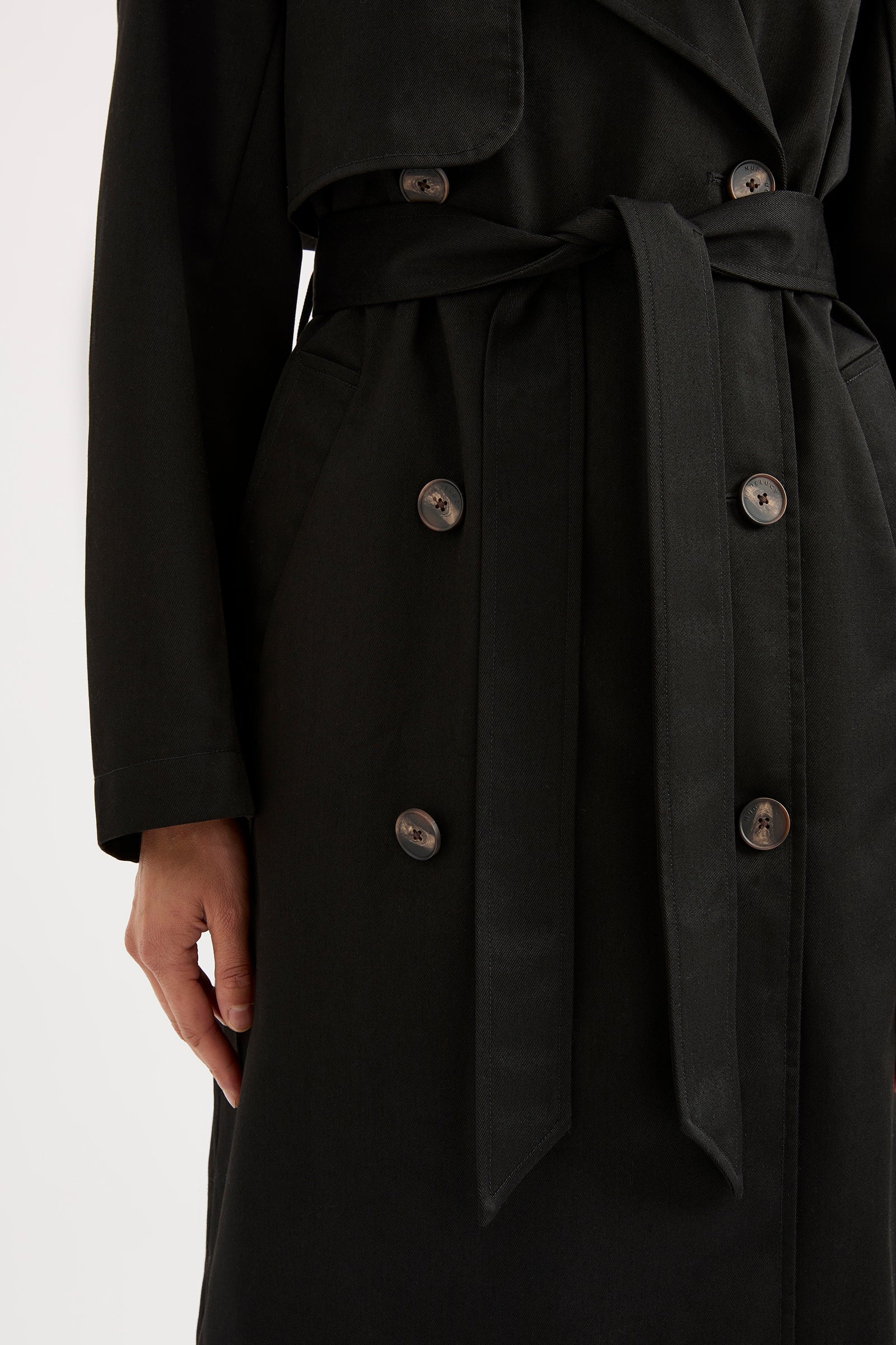 The Kaiya Trench is made from a heavyweight cotton fabric which has a twill finish. The silhouette is relaxed with wide, full length sleeve and body length finishing below the knees. Classic trench coat features, including storm flap, waist tie and welt pocket pockets.