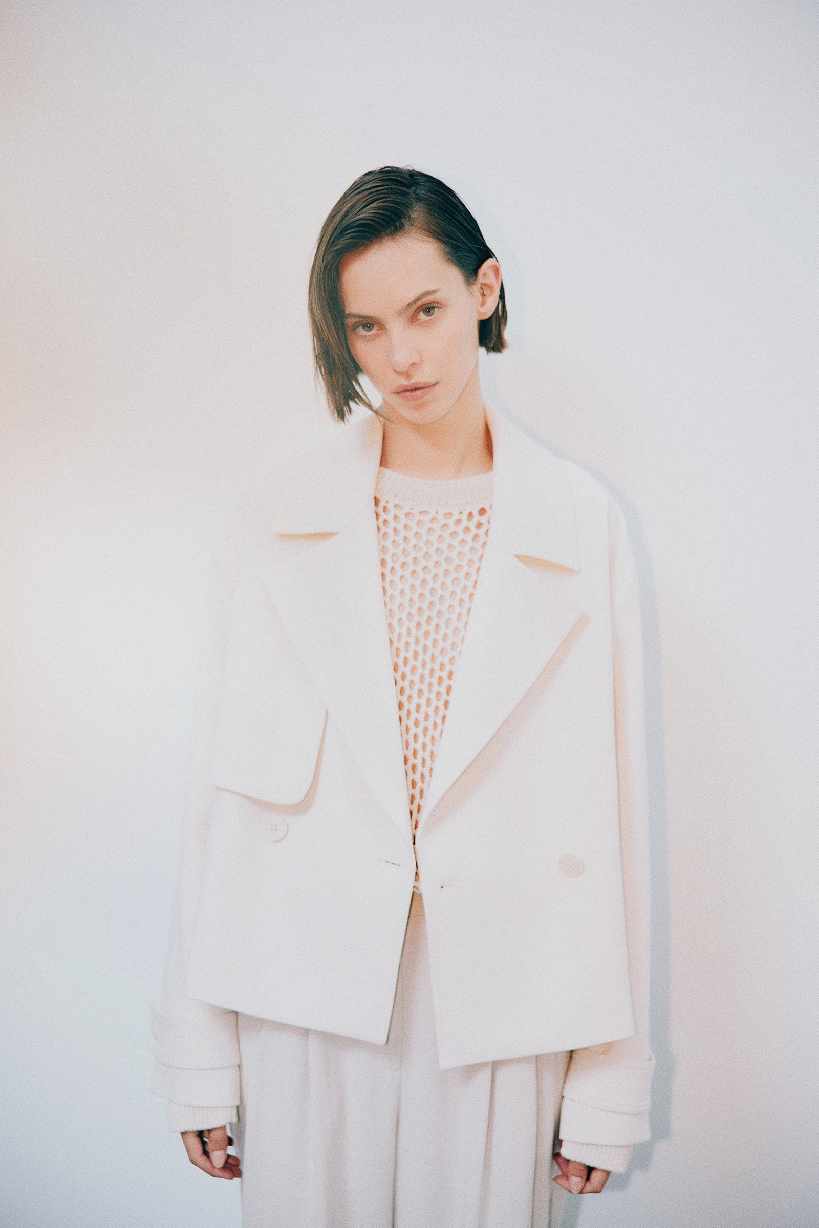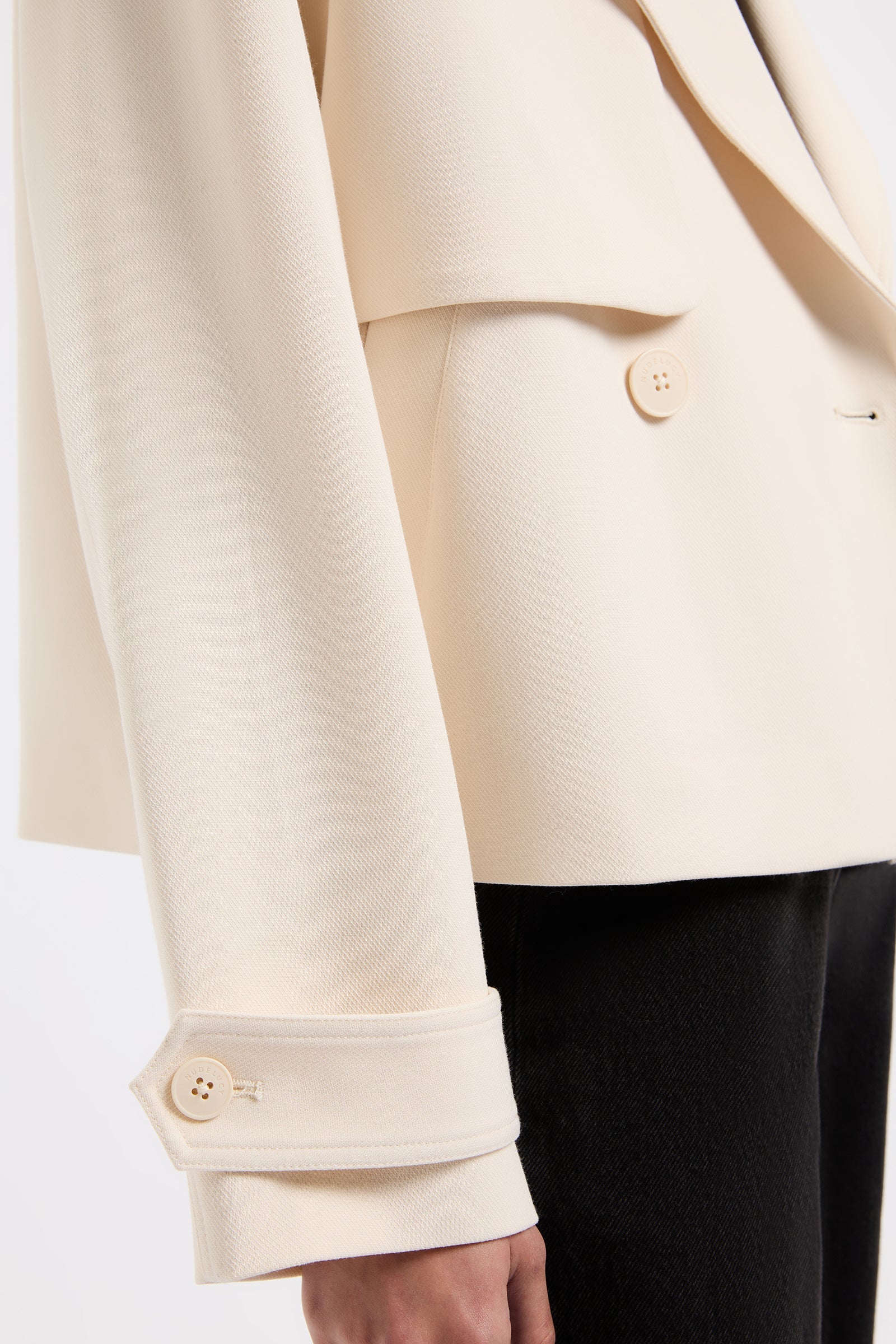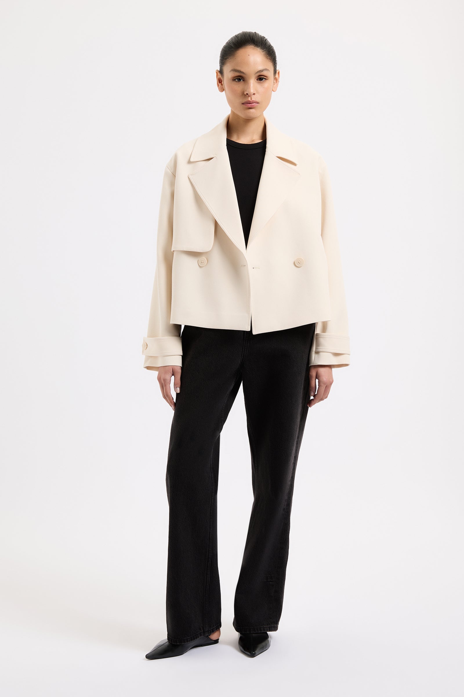 The Karson Crop Trench is made from a midweight fabrication which has a soft, twill hand feel. The silhouette is relaxed with wide full length sleeves & body length finishing at the hips. Features include traditional trench coat detailing, double breasted button opening, storm flap and adjustable cuff detail.
