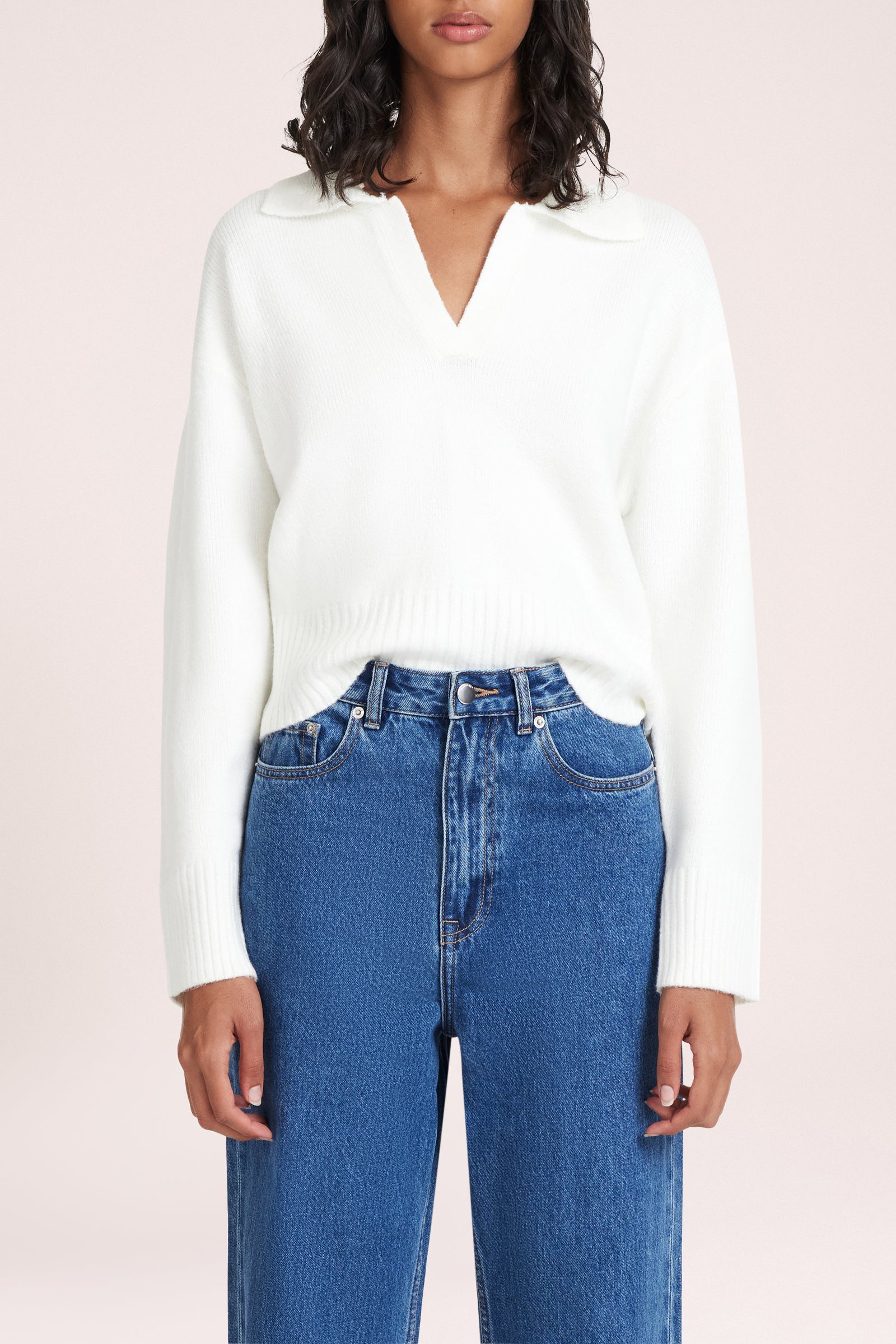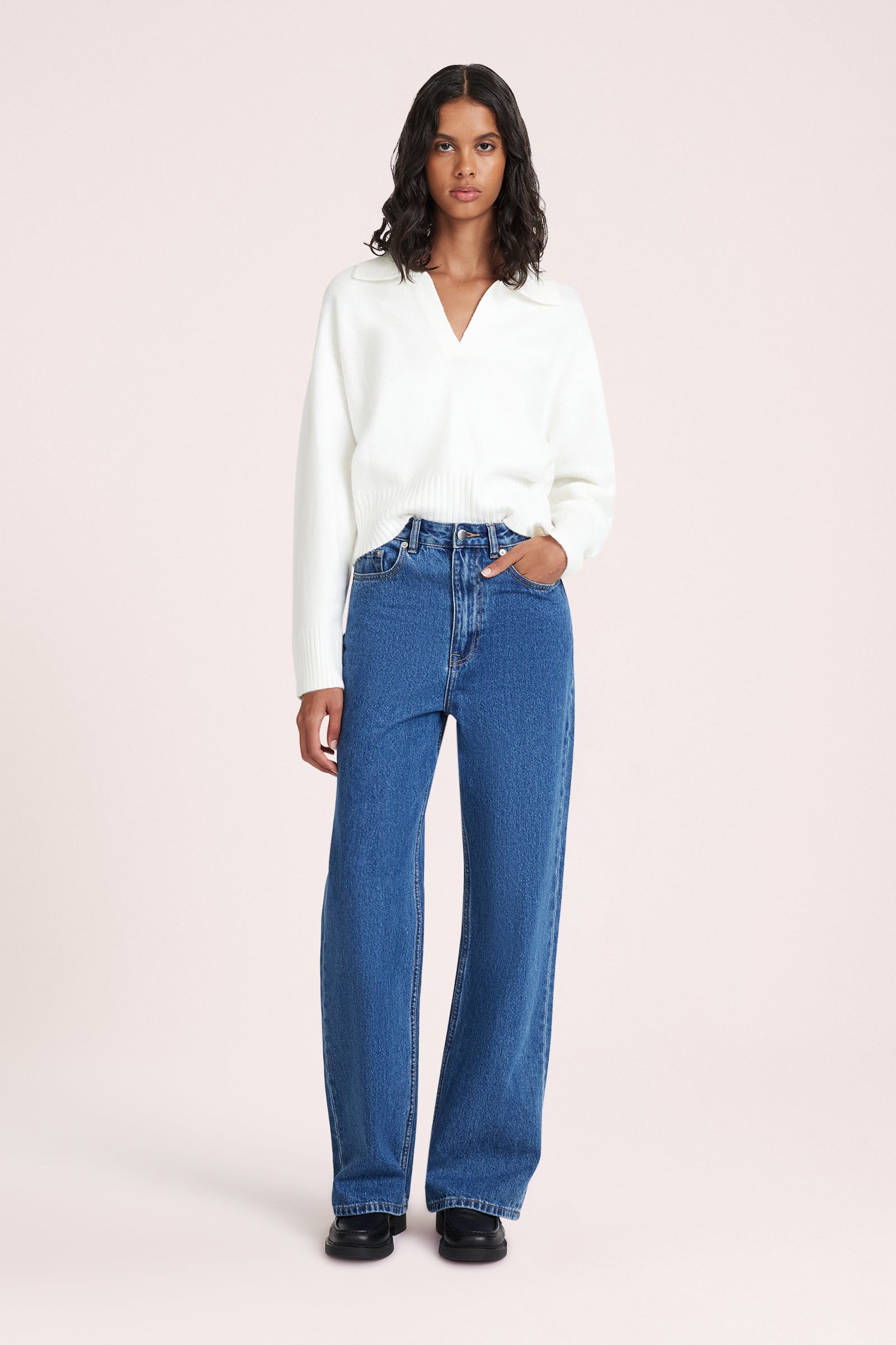 The Kinsley Rugby knit is made from a premium fluffy yarn with an extra soft hand feel. The silhouette is relaxed with long sleeves and length finishing at the hips. Features include a fully knitted rugby collar and a ribbed hemline and cuffs.