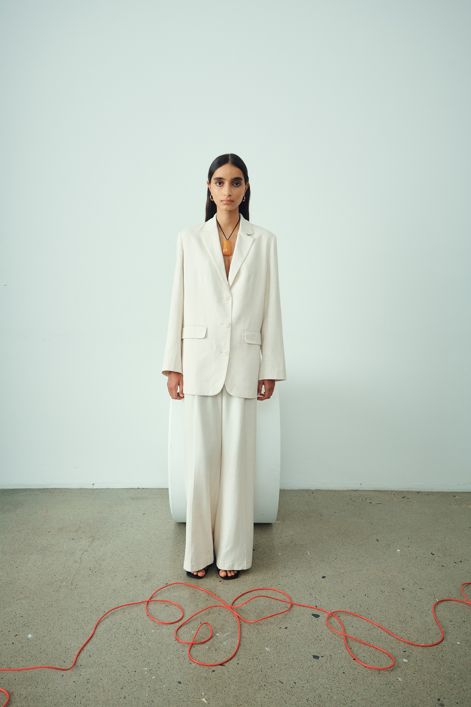 The Koda Pant is made from a classic suiting fabrication with a smooth hand feel. The silhouette is tailored with a midrise and wide leg. Features include front pleats at waist & concealed button and trouser hook closure.