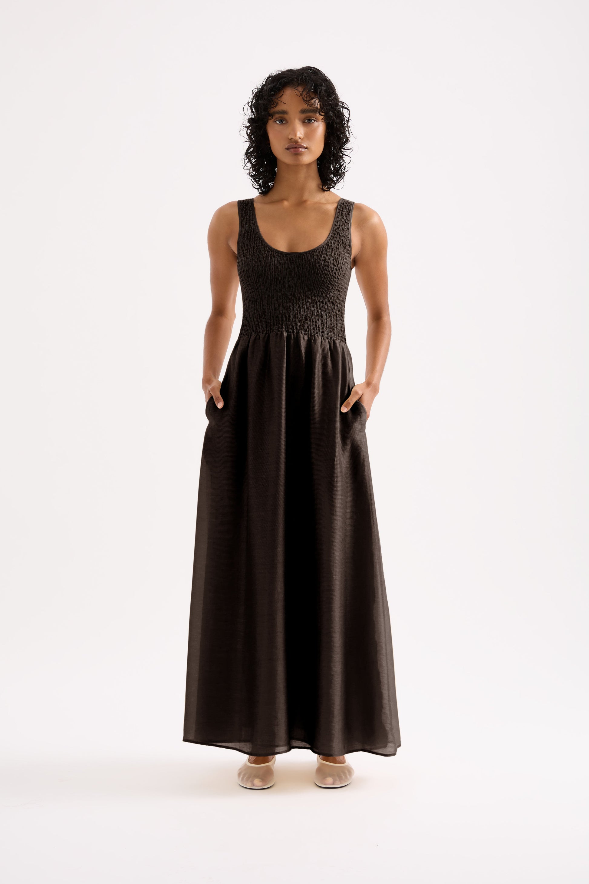 The Kova Maxi Dress is made from a light weight lyocell blend fabric which is slightly sheer and has a smooth hand feel. The silhouette is feminine and relaxed with a shirred bodice and soft billowing skirt that finishes above the ankle. Features include a scooped neckline with thick straps. This dress is fully lined.