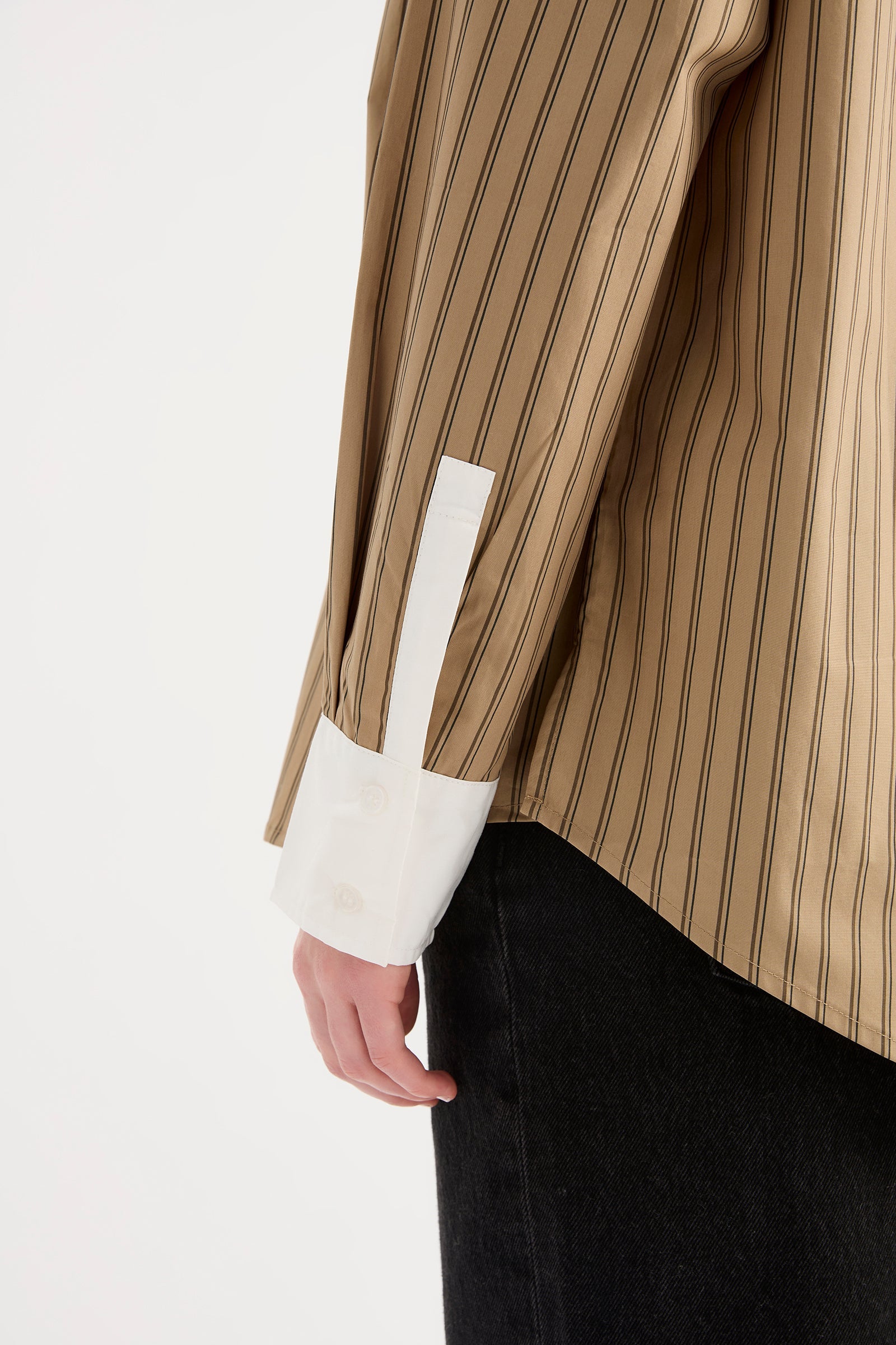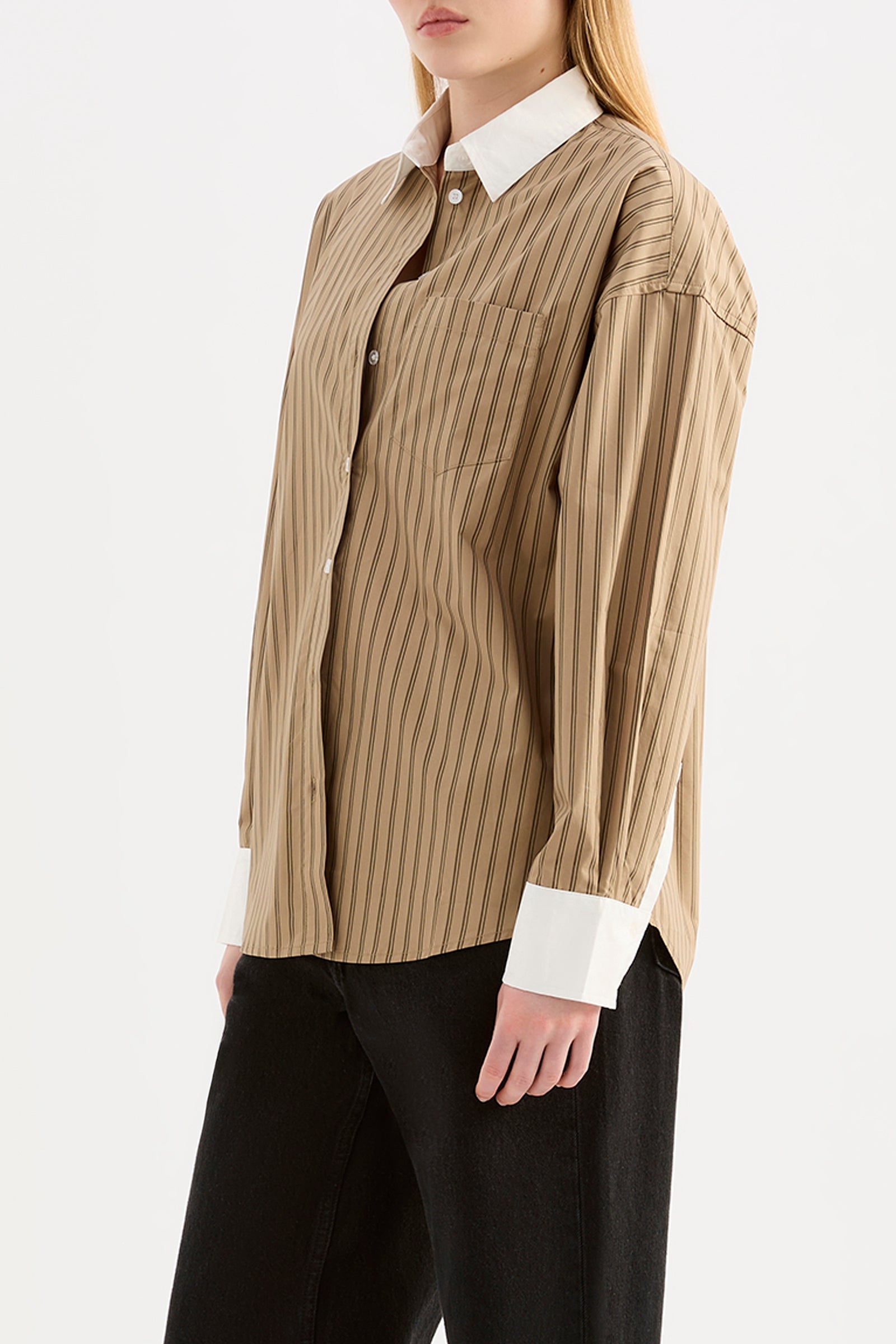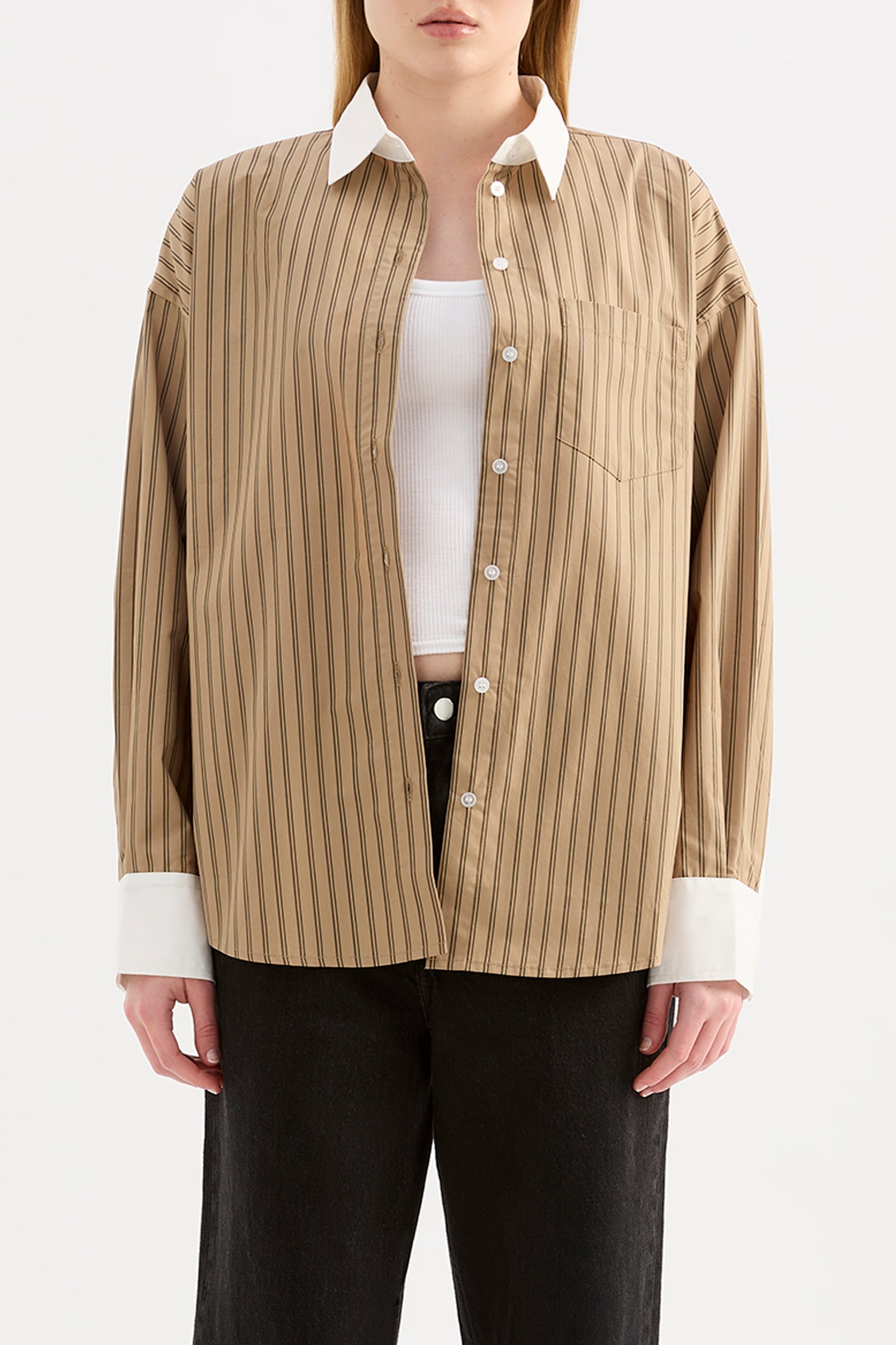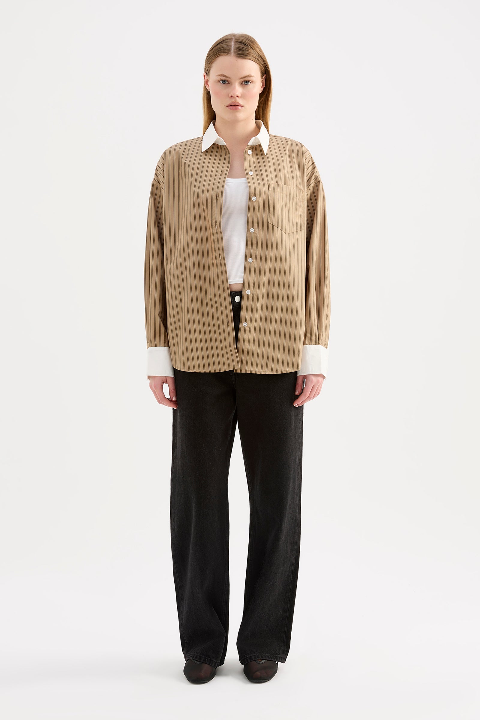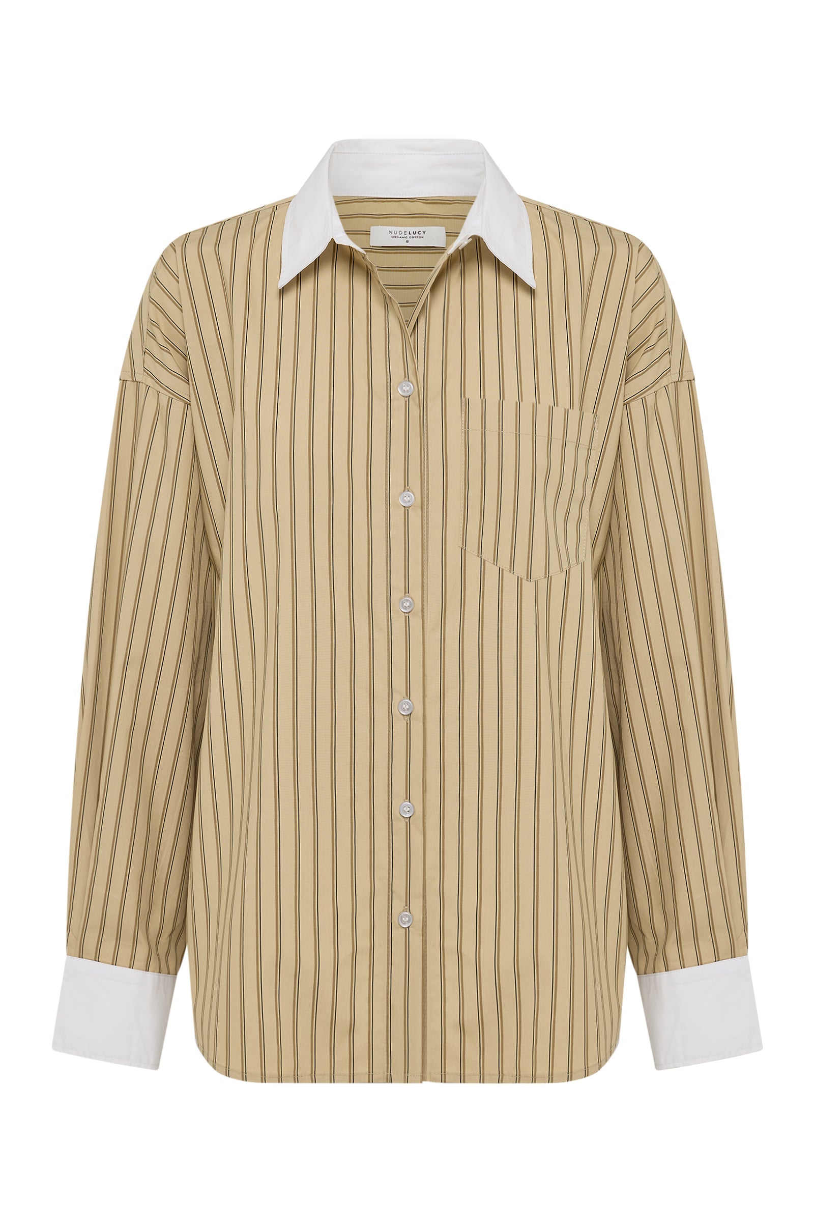 The Lando Shirt is made from a organic cotton poplin which has been washed for a smooth, crisp hand feel. The silhouette is oversized throughout with length finishing on the hips. Features include front patch pockets, a large cuff and Nude Lucy branded buttons.