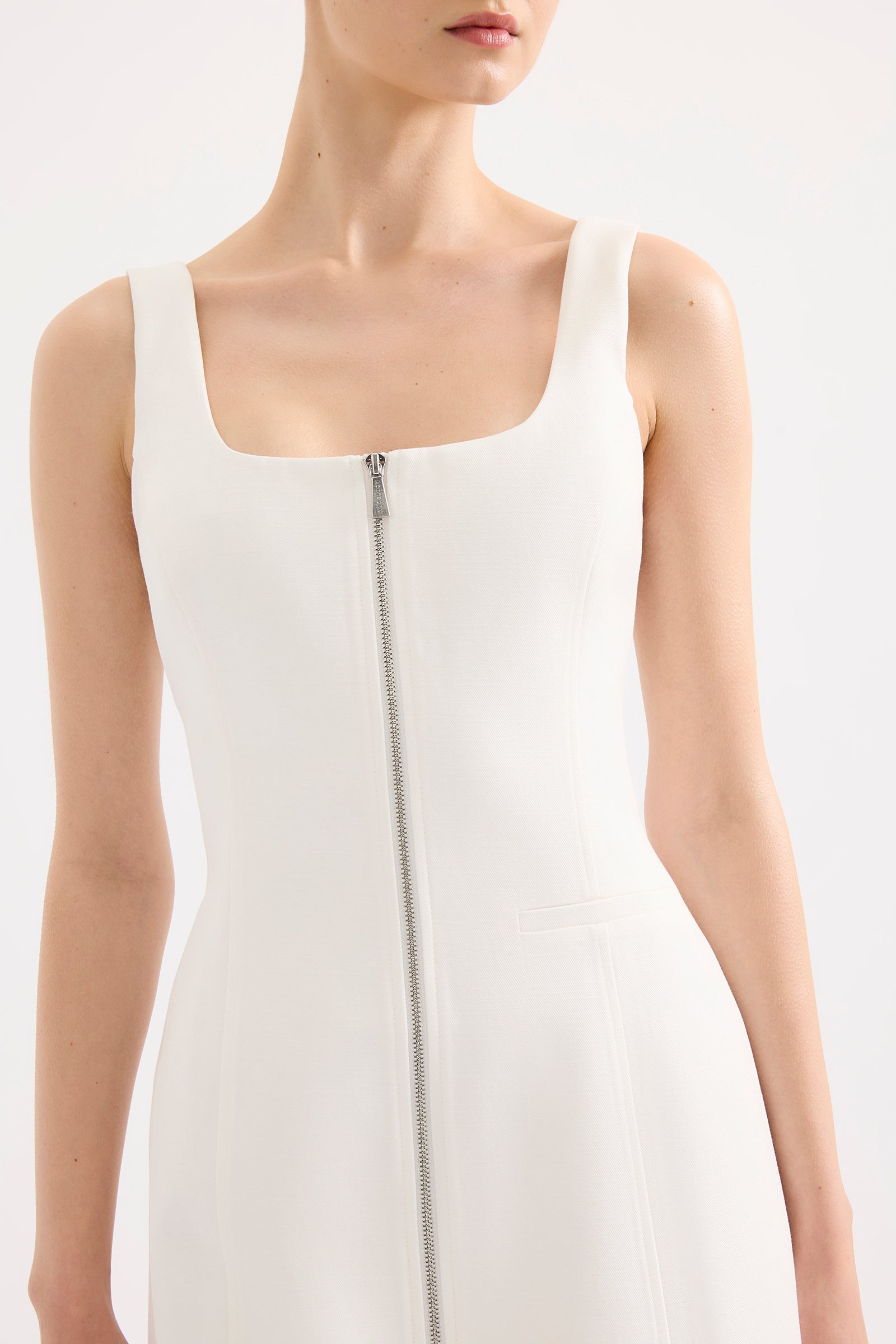 The Lina Mini Dress is made from a mid weight cotton Lyocell blend fabrication which has a soft, breathable hand feel and subtle texture. The silhouette is fitted at the bodice with an A line skirt that is mini in length. Features include panels to create shaping, faux pocket design detail and exposed branded zipper at centre front. This dress is fully lined.