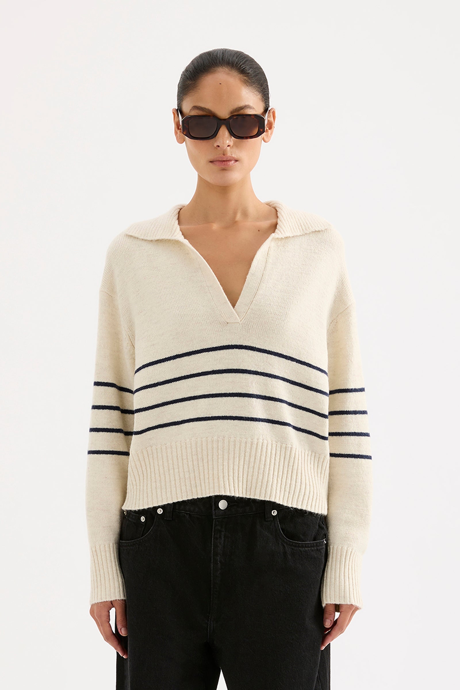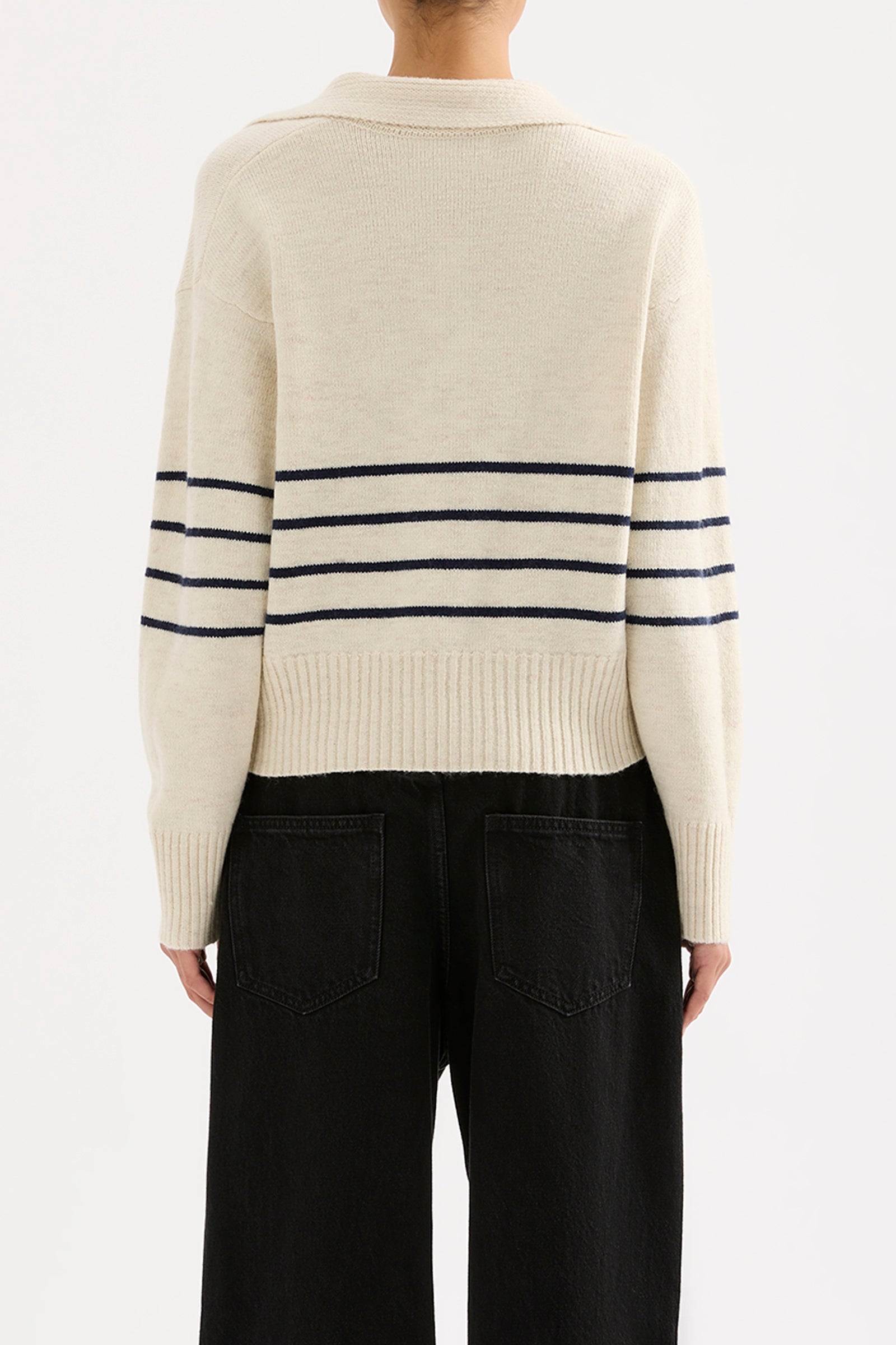 The Logan Rugby Knit is made from a thick yarn which has a soft hand feel. The silhouette is relaxed with long sleeves and length finishing at the hips. Features include a knitted stripe design, fully knitted rugby collar and a ribbed hemline and cuffs.