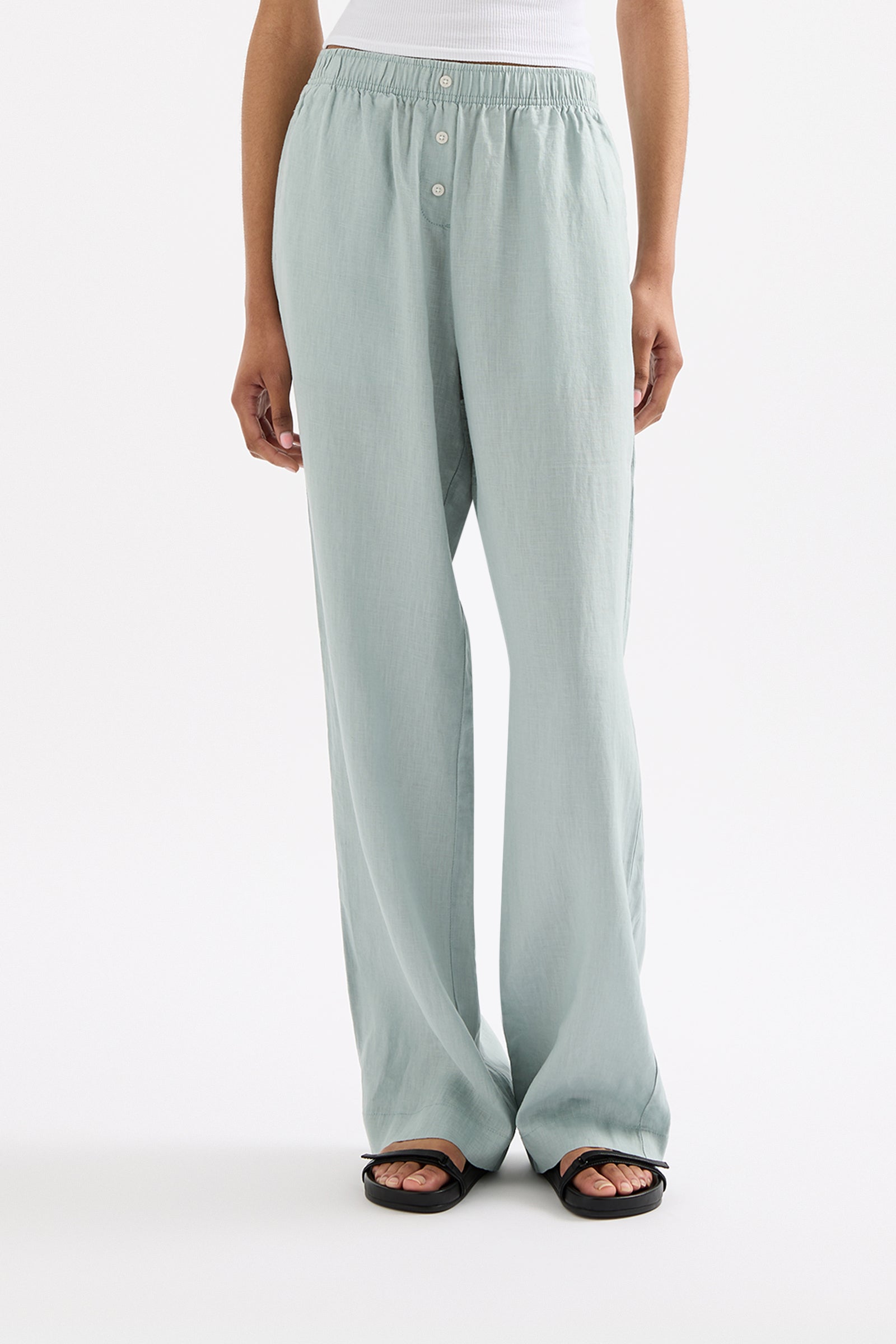 The Lounge Linen Pant is made in a premium 100% organic French linen which has been washed down for a soft and breathable handfeel. The silhouette is a clean, casual fit with a wide leg opening. Features include an elasticated waistband with a mock button front, side seam pockets and back patch pockets with Nude Lucy branded label. Pair with a Nude Lounge top in coordinating colours.