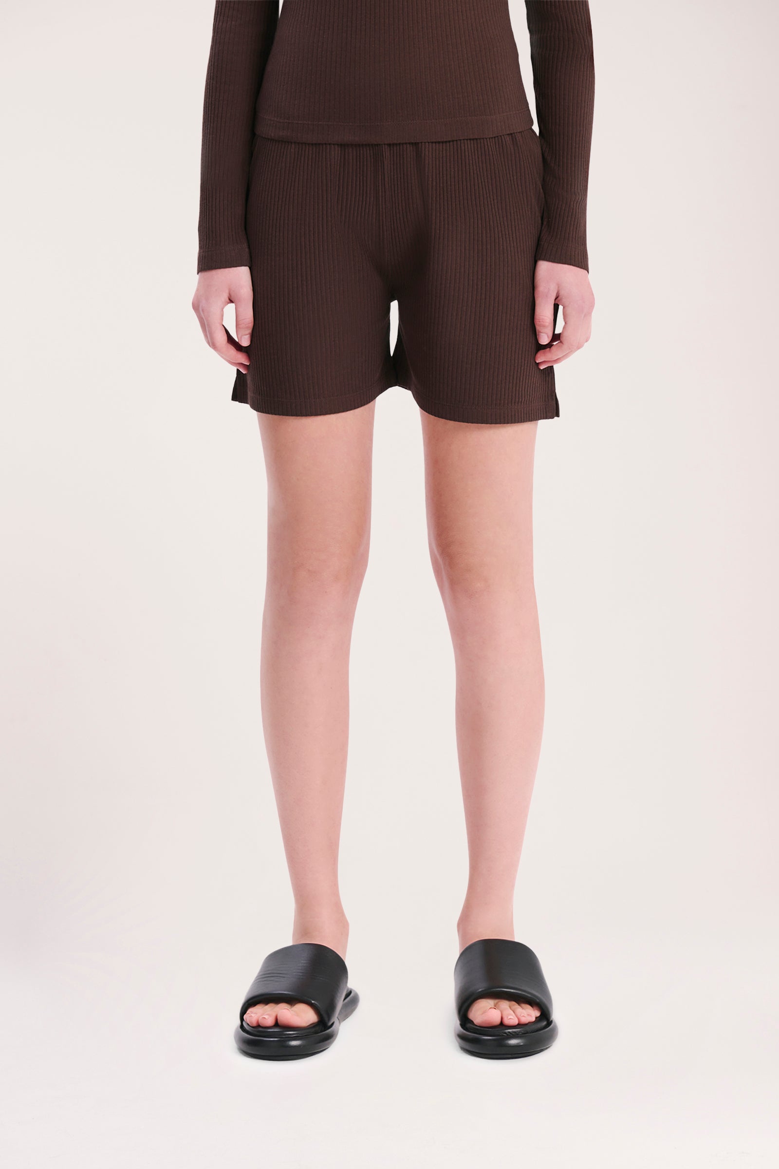 The Nude Ribbed Lounge Lounge Short is a neat fitted mini short made in a breathable Organic cotton and elastane blend. Features include a hidden elasticated waistband, button front and a Nude Lucy branded label.
