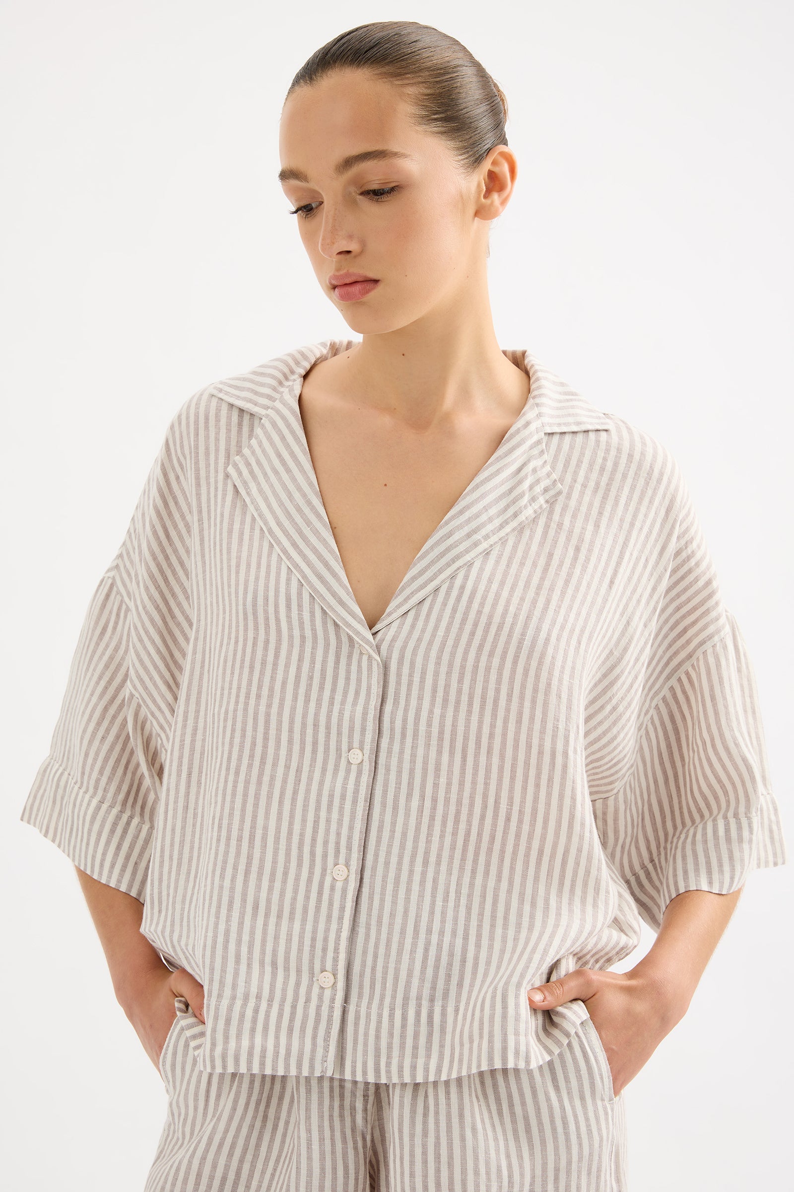 The Lounge Stripe Linen Shirt is made in a premium 100% organic French linen which has been washed down for a soft and breathable hand feel and features an exclusive yarn dyed stripe. The silhouette is a classic shape, with a clean and casual fit. Features include a wide collared neckline, button front opening and wide elbow length sleeves. This shirt also includes the Nude Lucy branded label. Pair with a Nude Lounge Bottom in coordinating colours.