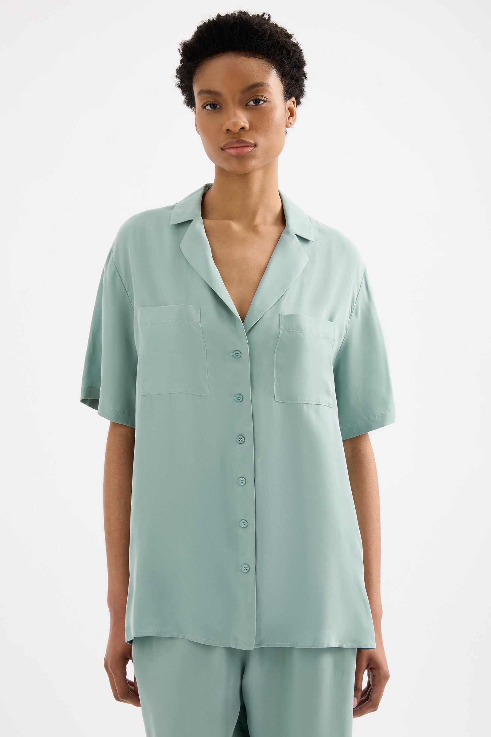 The Lucia Cupro Shirt is made in our signature cupro fabrication, with a soft, sueded hand feel. The silhouette is an oversized fit, with length finishing at the hip. Features include classic shirting details with front pocket and shell buttons.
