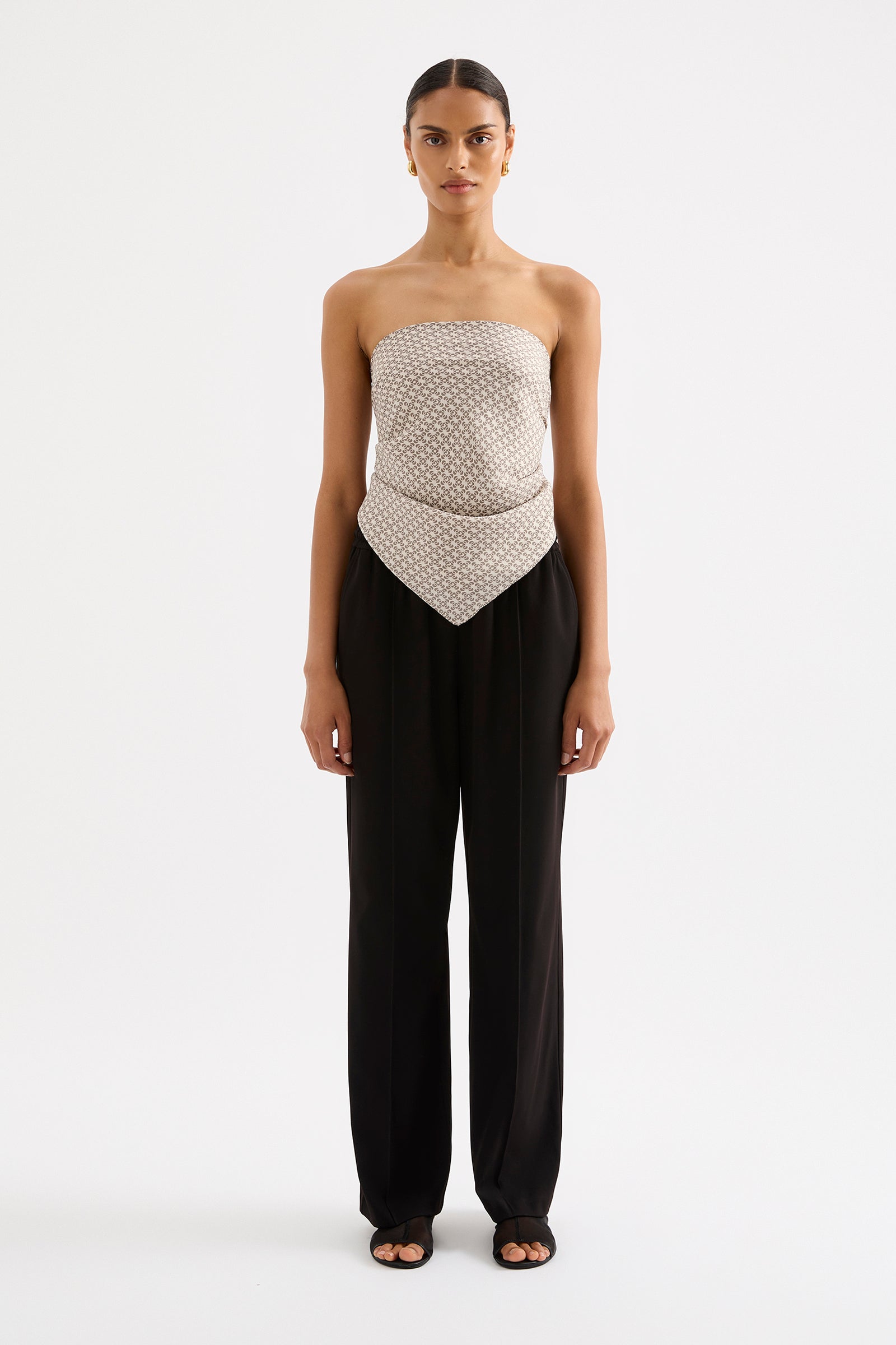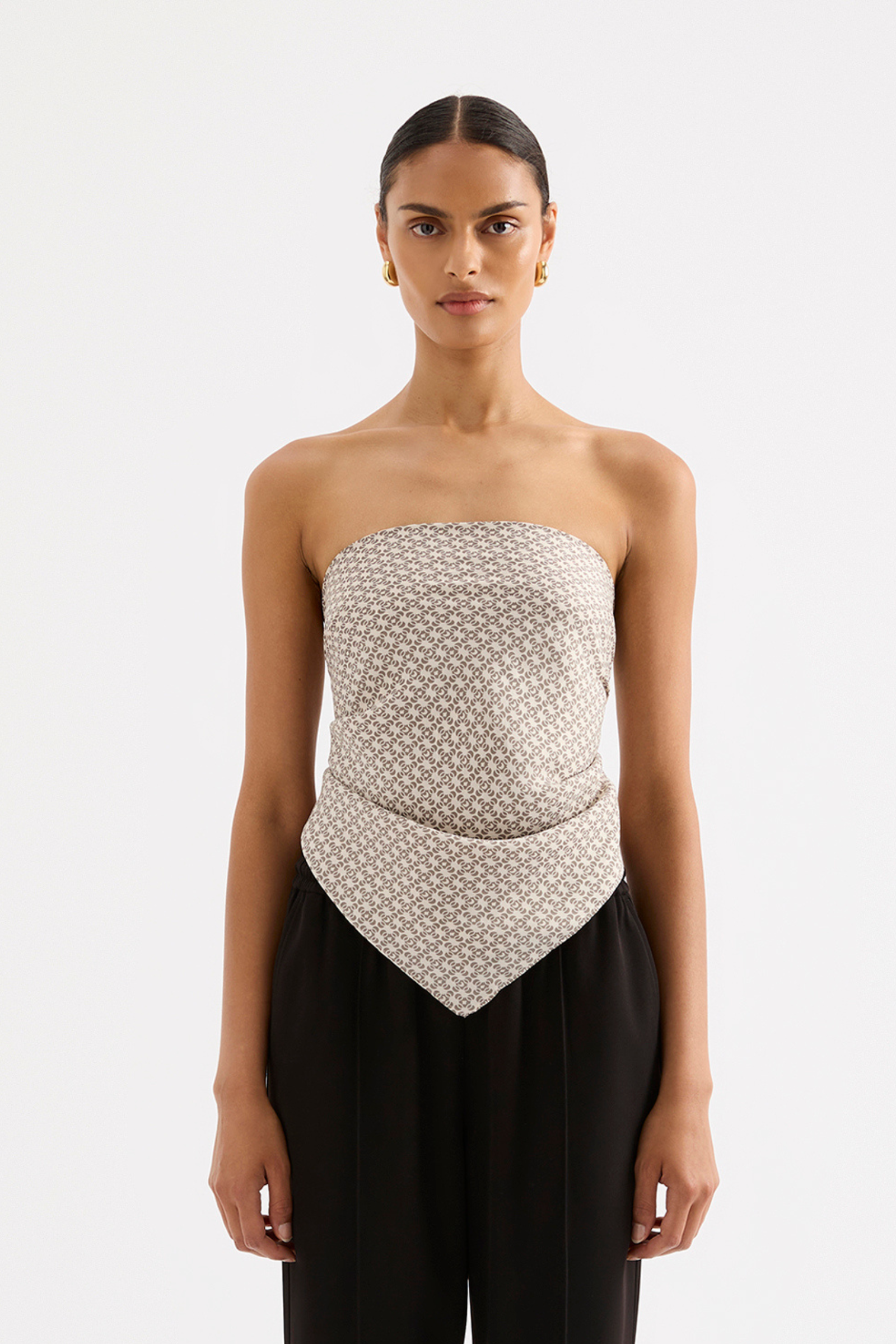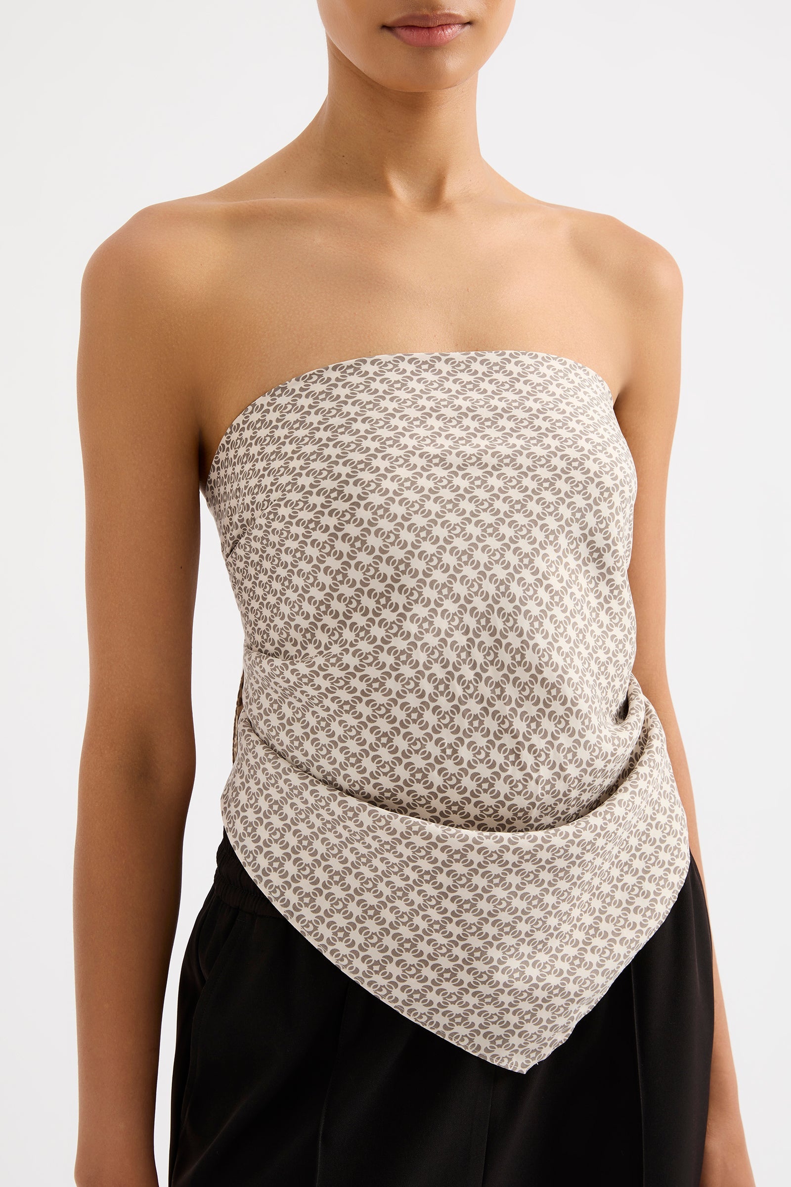 The Moneta Cupro Scarf is made in our signature cupro fabrication signature cupro fabrication in our exclusive Moneta print. The scarf is a smooth single layer piece with a neat double turned hem. Designed with versatility, this scarf can be worn as either a top, head scarf, or bag accessory.