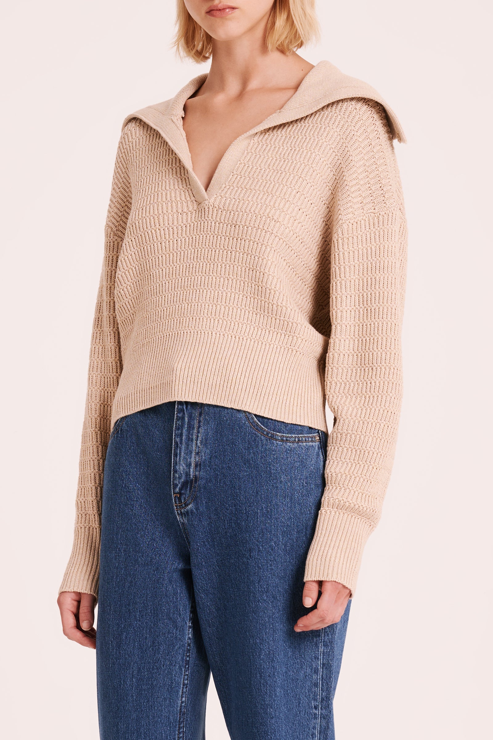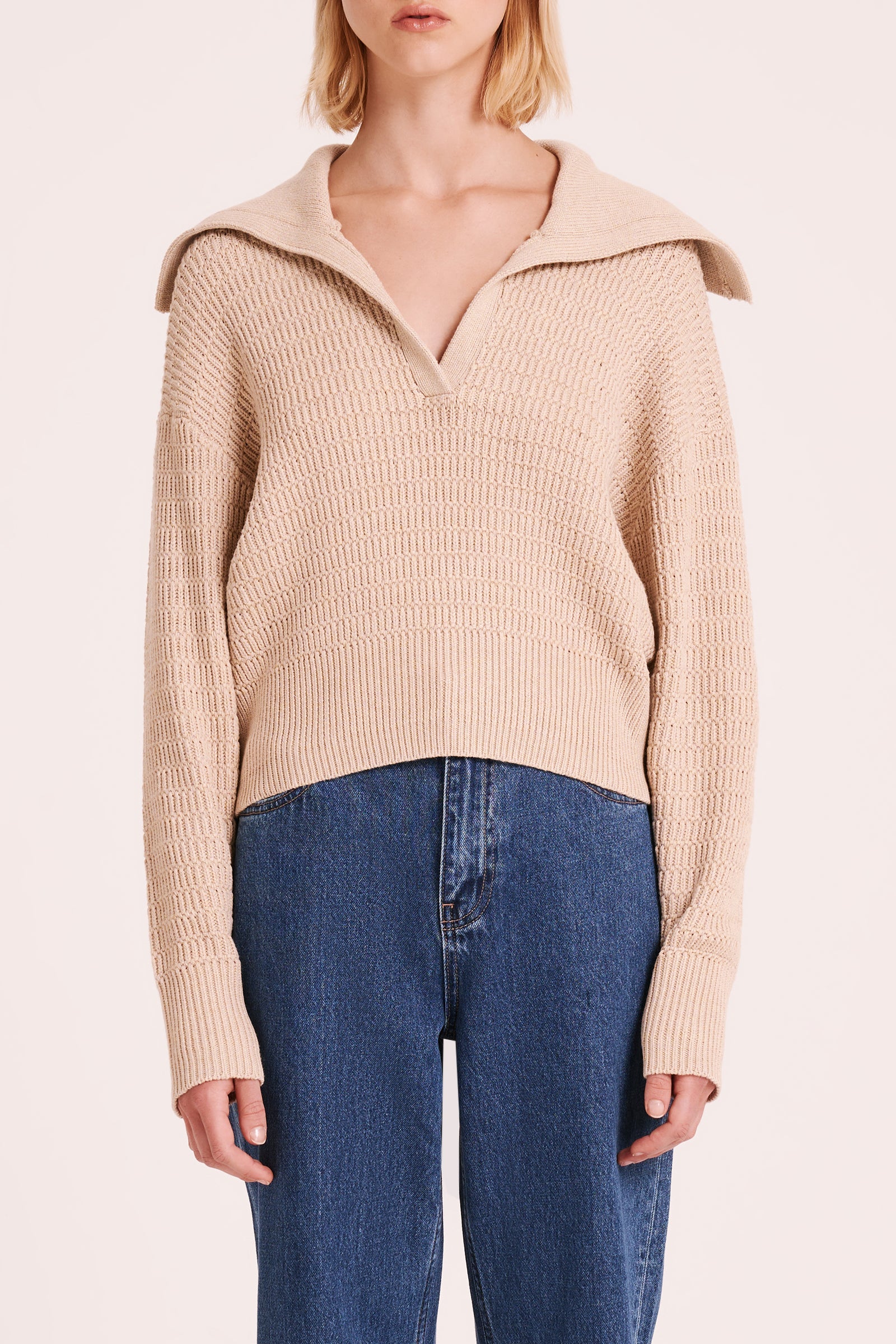 The Nala Rugby knit is made from a cotton yarn with an extra soft hand feel. The silhouette relaxed with long sleeves and length finishing at the hips. Features include a fully knitted rugby collar, a ribbed hemline and cuffs.