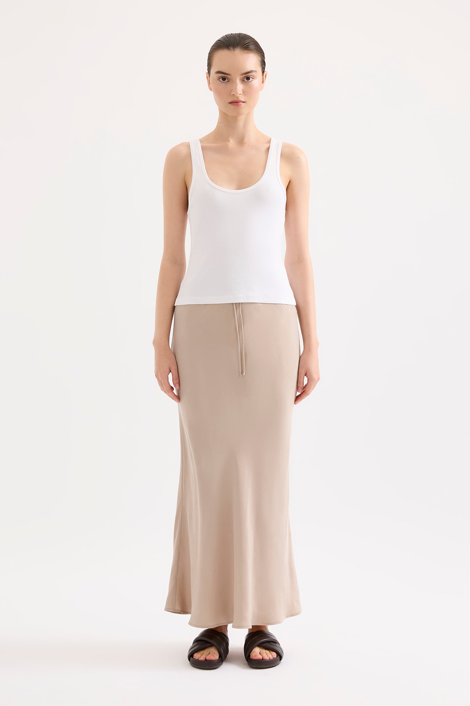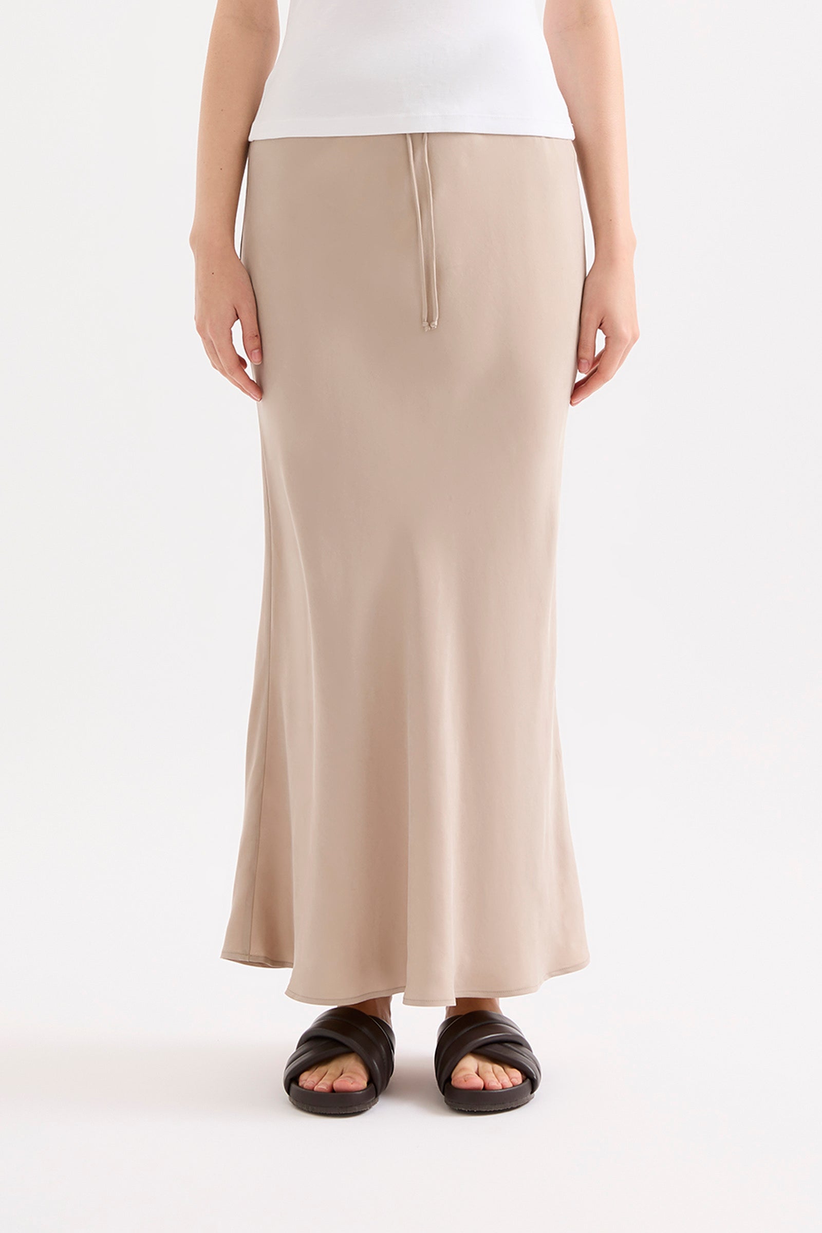 The Nikkia Cupro Maxi Skirt is made in our signature cupro fabrication which has a soft, sueded hand feel. Cut on the bias, this silhouette finishes at ankle length. Features include encased elasticated waistband and drawcord.