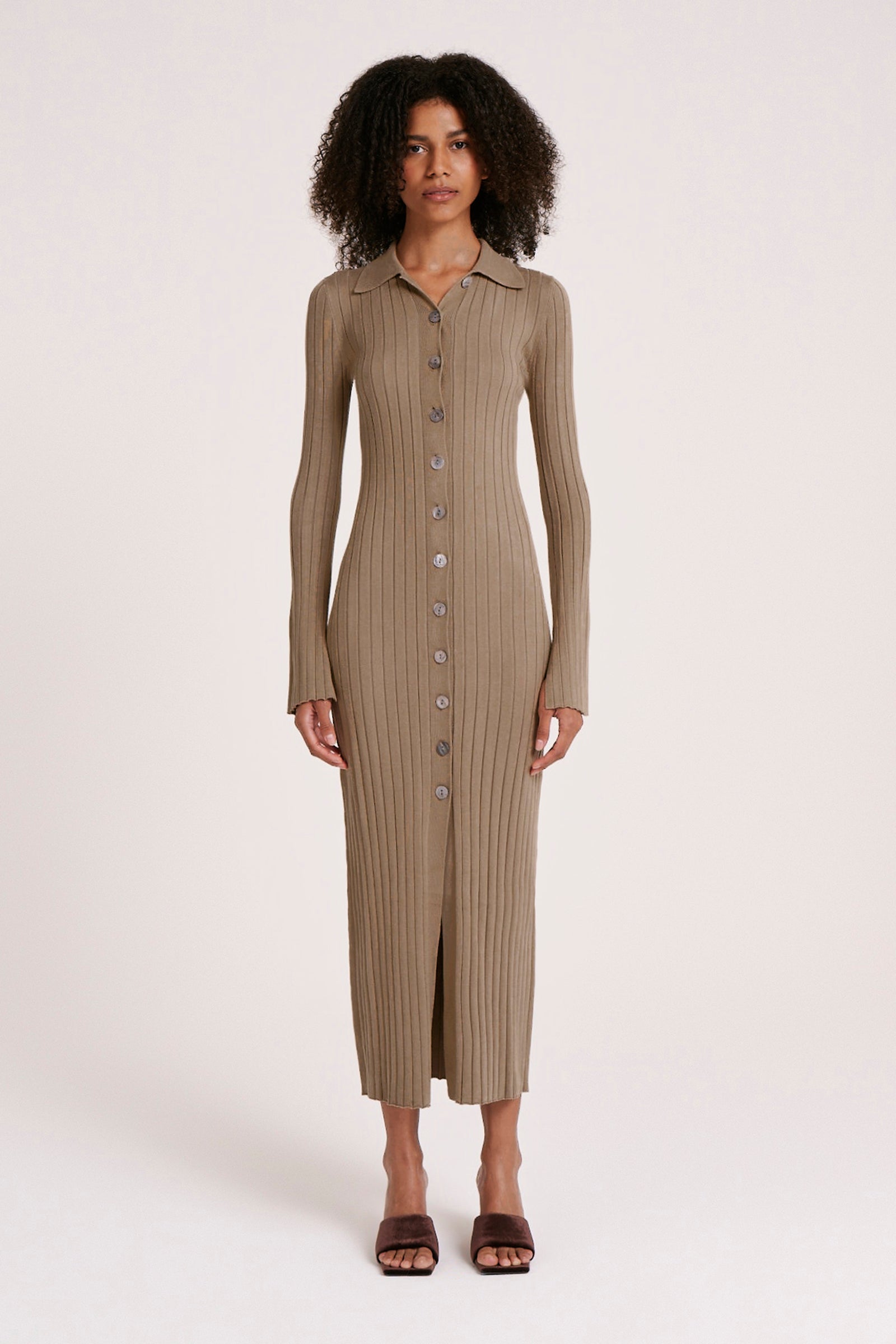 The Noemi Knit Dress is made from a lightweight cotton blend yarn which is soft on the skin. Silhouette is slim fitting with full length sleeves and length finishing just above the ankles. Features include a classic rib pattern construction through the body and a finer rib pattern at the crew neckline,
